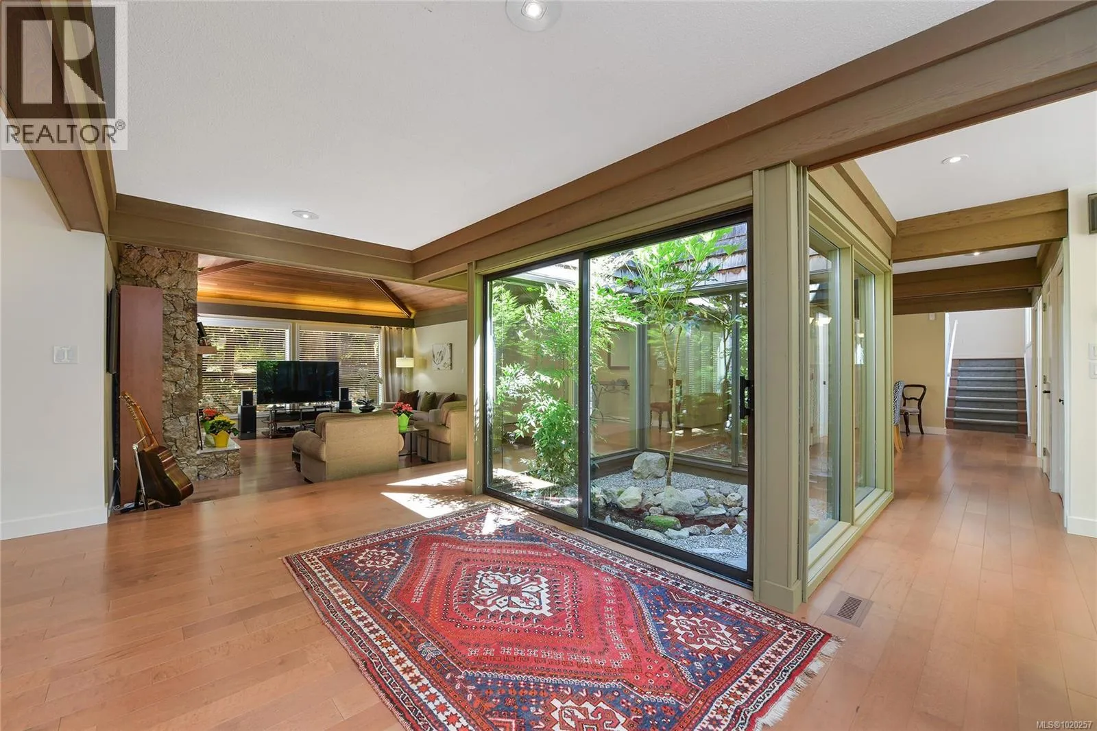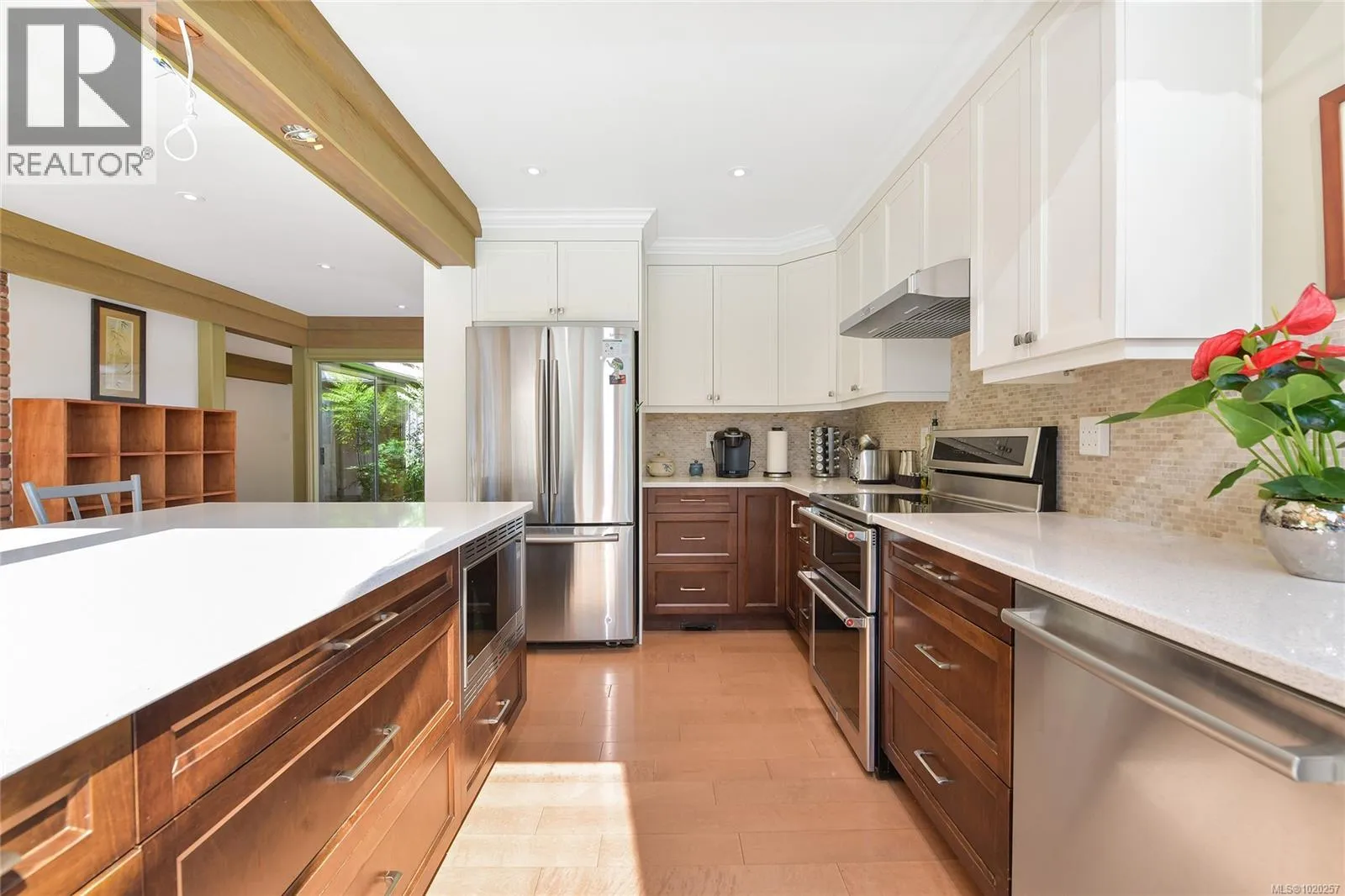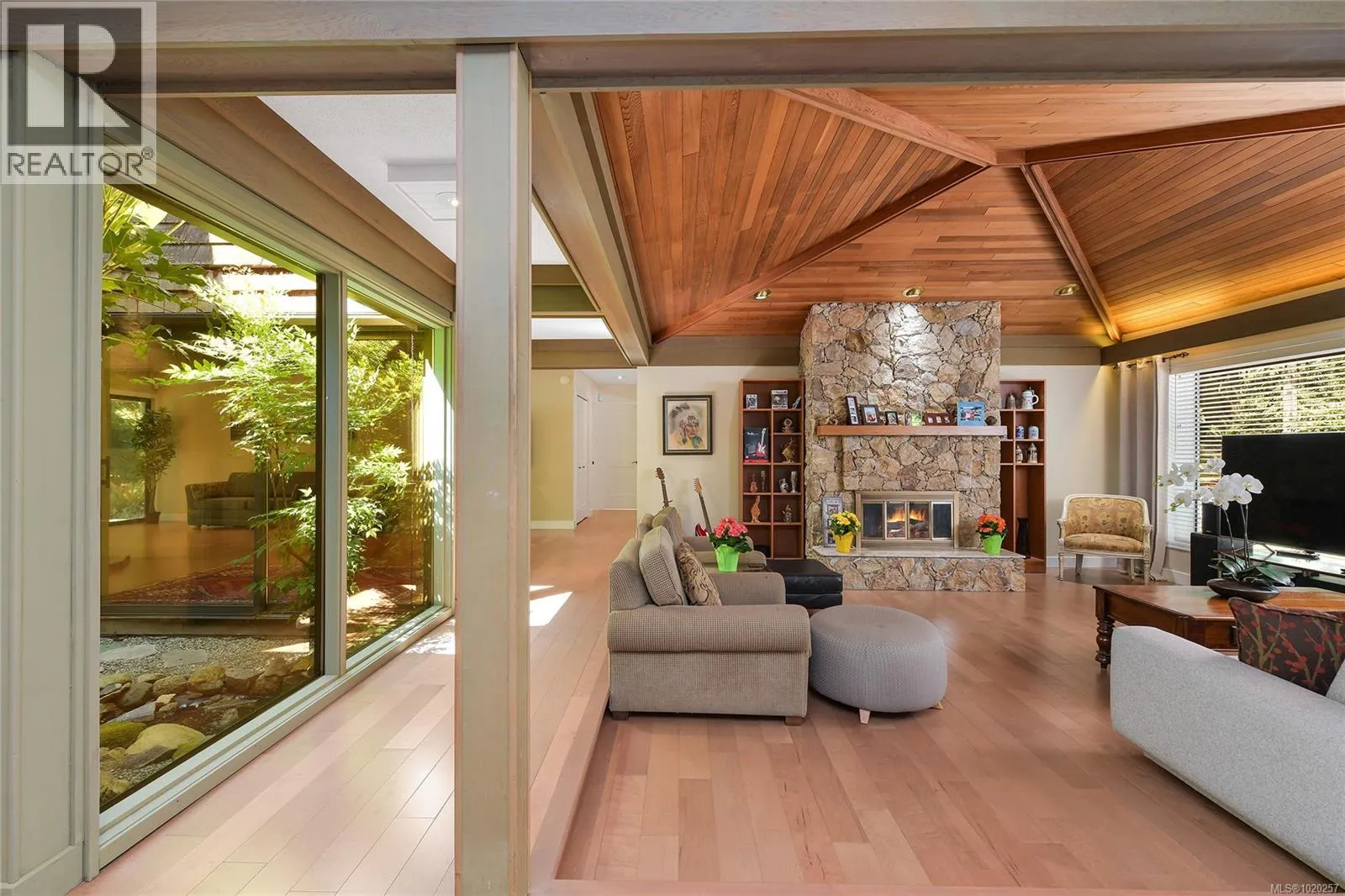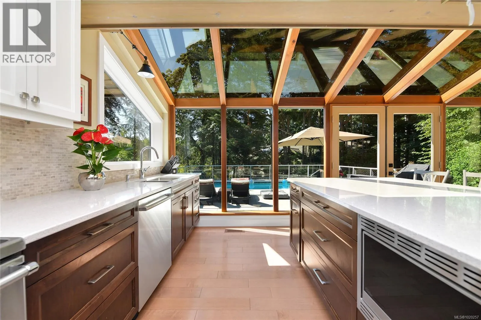 Welcome to your private retreat in sunny Ardmore. Set on 1-acre, this thoughtfully updated 4BD/4BA family home features a fully fenced garden, detached 1,100 sq.ft. workshop with its own heat pump, and a resort-style backyard with large deck and heated pool perfect for entertaining or unwinding. Inside, youâll find quartz counters, a large kitchen island, maple floors, SS appliances, and a cozy wood stove. The open-concept kitchen flows seamlessly into a bright sunroom, while an indoor atrium opens into the inviting living room with a wood-burning fireplace. The main floor offers easy one-level living, complete with a spacious primary suite that includes a walk-in closet and an ensuite with heated floors. A bonus crafts room for hobbies, an oversized double garage with RV/boat parking, and a self-contained in-law suite for added flexibility. Located just minutes to ferries, the airport, and the shops of Sidney, this home offers peaceful country living with urban convenience. (id:27476)