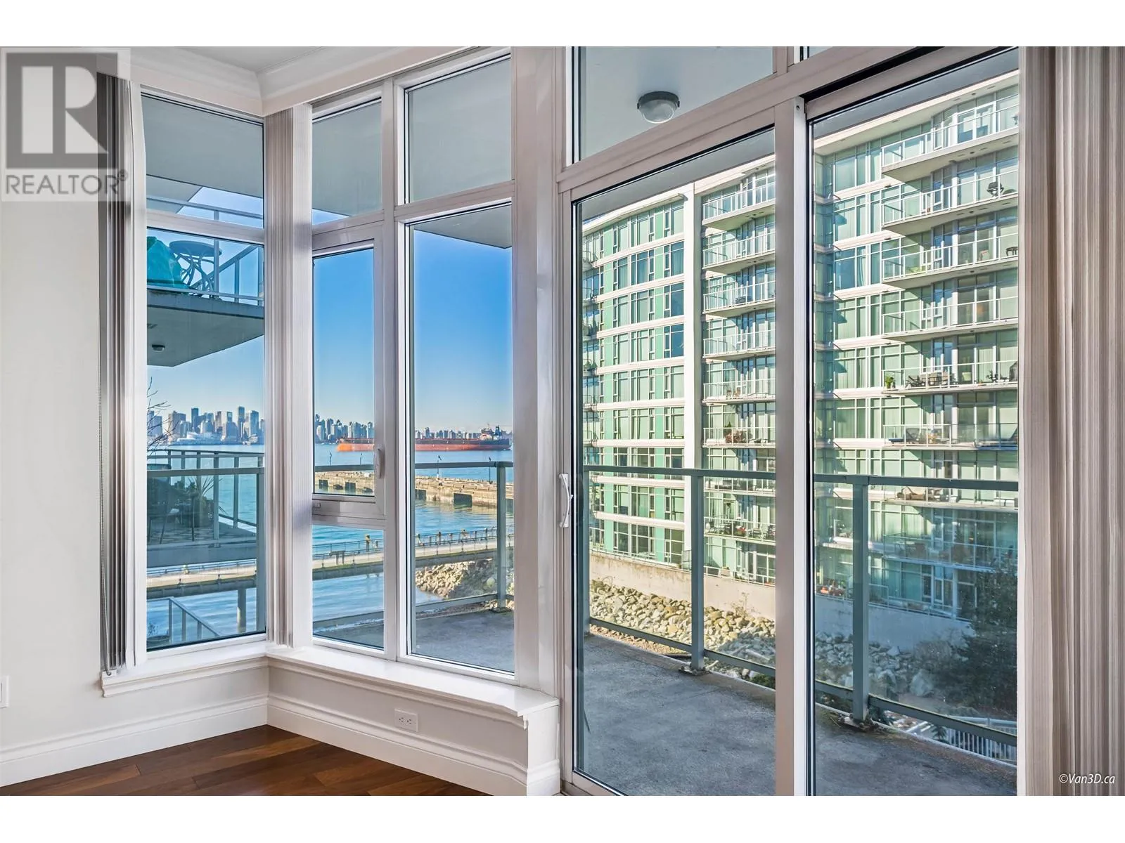 INVESTORS ALERT! Rented at $3200/month until the end of April 2026. BEST 1-BEDROOM VIEW - RARELY AVAILABLE 05 UNIT! This stunning west-facing unit offers 659 SQ.FT with 1 bedroom, 1 den, an ensuite bathroom with separate entrance, walkthrough closet, and a spacious balcony with some of the best ocean views Cascade at the Pier has to offer of the private beach, Vancouver Harbour, Stanley Park and Downtown Vancouver´s breathtaking skyline. Enjoy an open floor plan, gourmet Bosch kitchen with gas stove, integrated fridge/freezer, soft-close drawers, breakfast bar, 9´ ceilings, crown mouldings, A/C, and European finishes. Owners receive VIP Pinnacle Hotel perks: indoor pool, steam room, sauna, jacuzzi, and gym. Steps from Shipyards District, Lonsdale Quay, and endless dining/shopping. (id:27476)