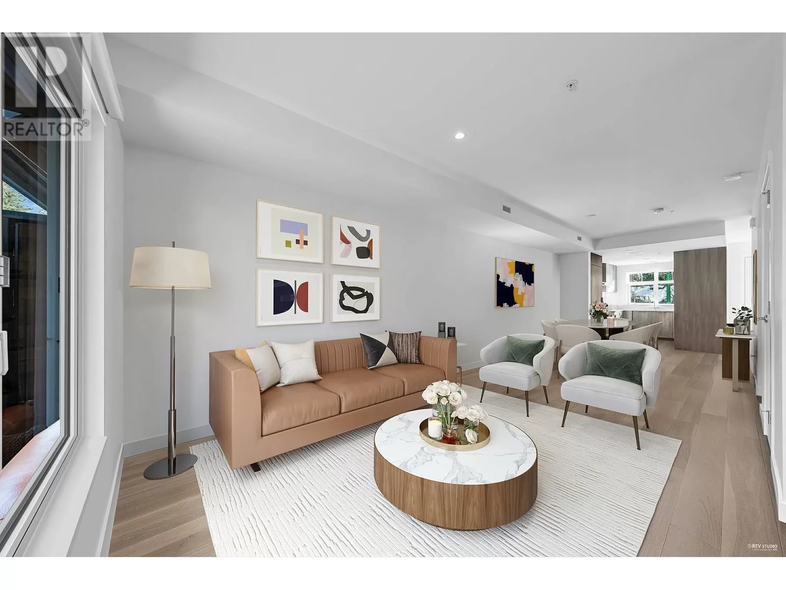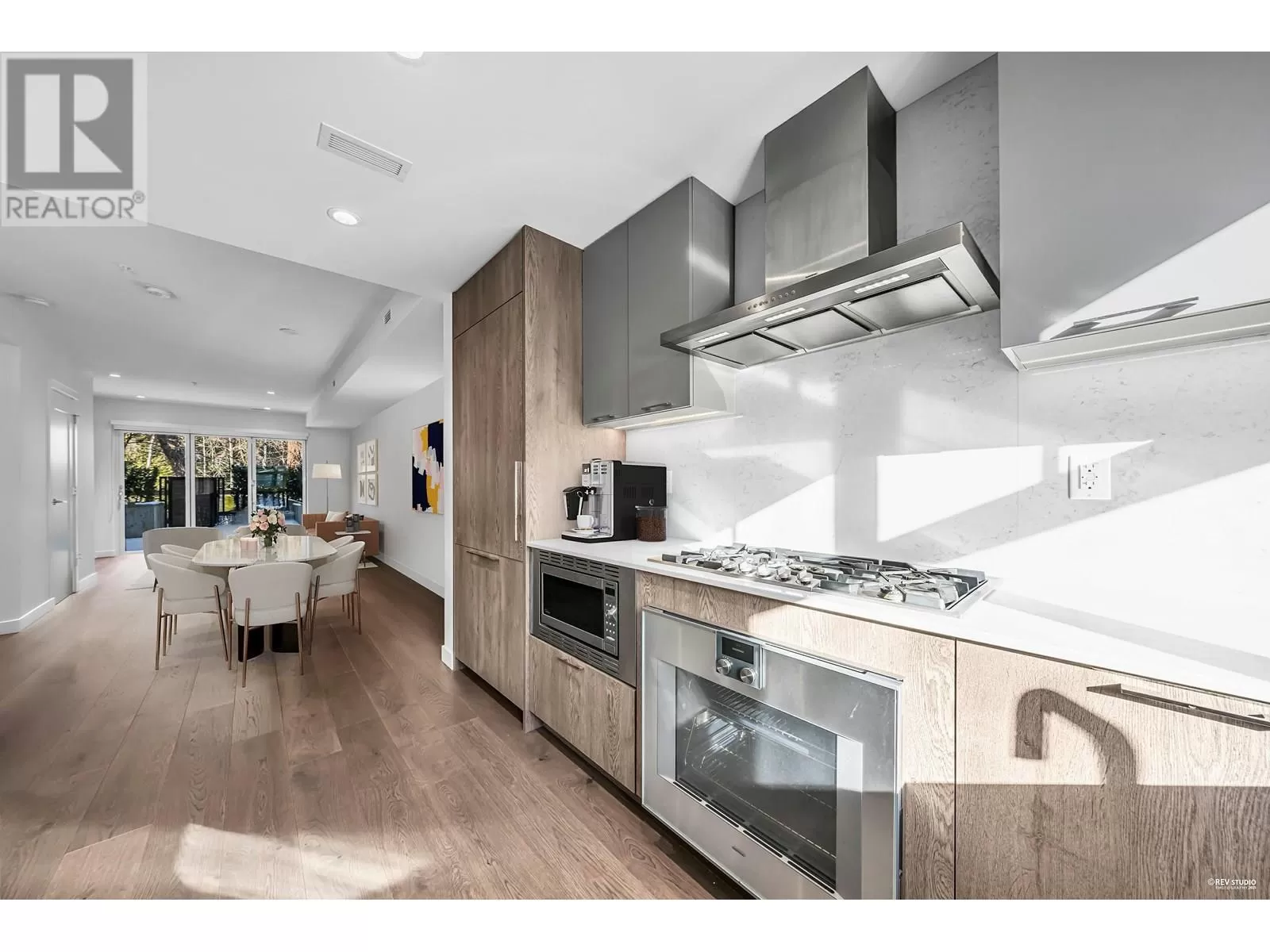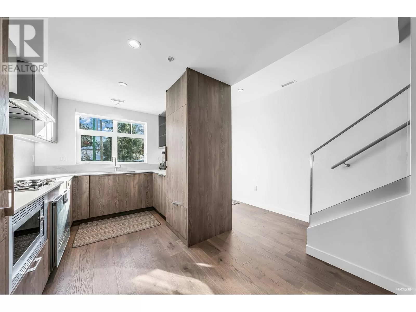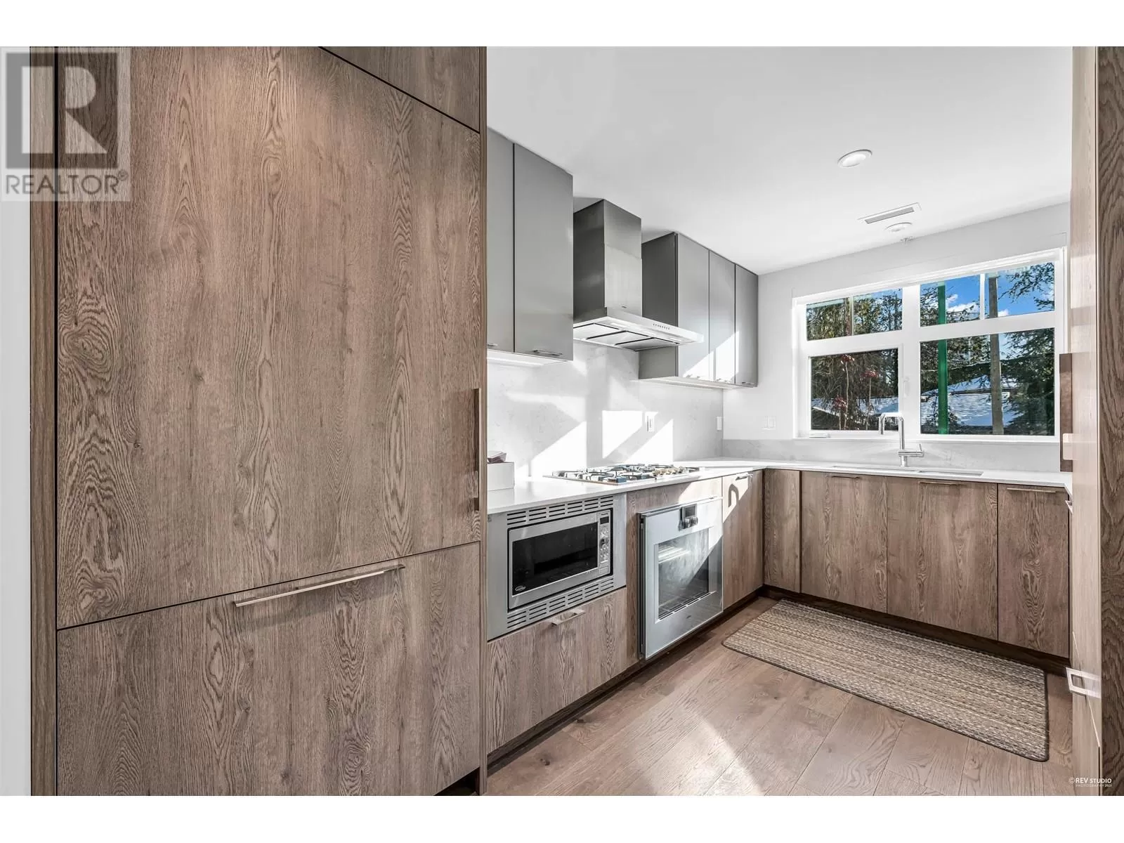 Welcome to Unit 4 at Holland Row-a rare opportunity to own a riverfront townhome in this exclusive 23-home community. This 4-bedroom residence offers the feel of a single-family home, featuring a spacious primary suite with double closets, stunning Capilano River views, and a spa-inspired ensuite with heated floors, a seamless glass shower, and double vanity. The high-end kitchen is equipped with integrated Gaggenau appliances, setting the tone for luxury. Accordion-style doors open to a private patio, seamlessly blending indoor and outdoor living. With both street-level and private garage entry, plus easy access to trails, cafes, transit, and shopping, this is North Vancouver living at its finest. (id:27476)