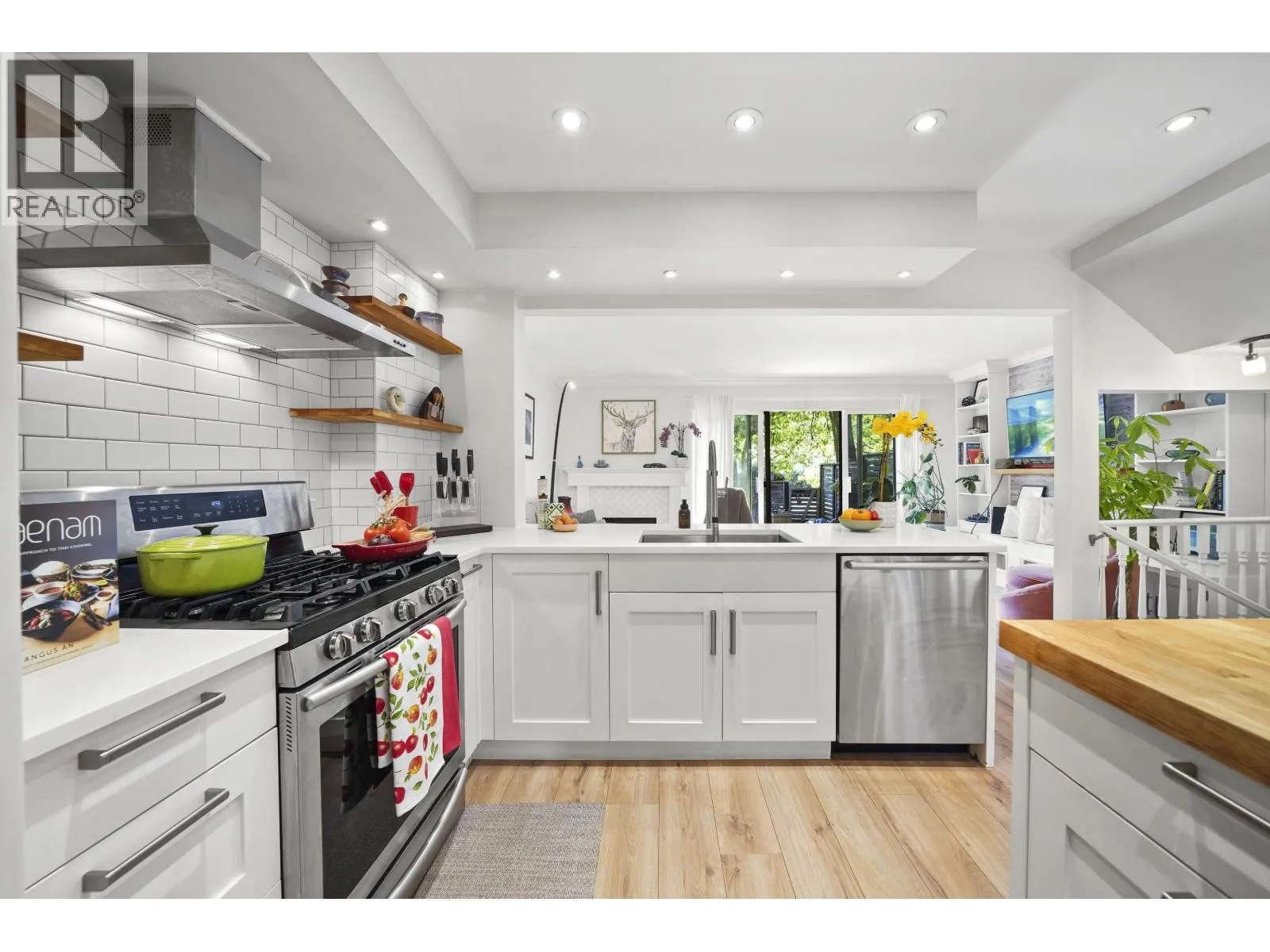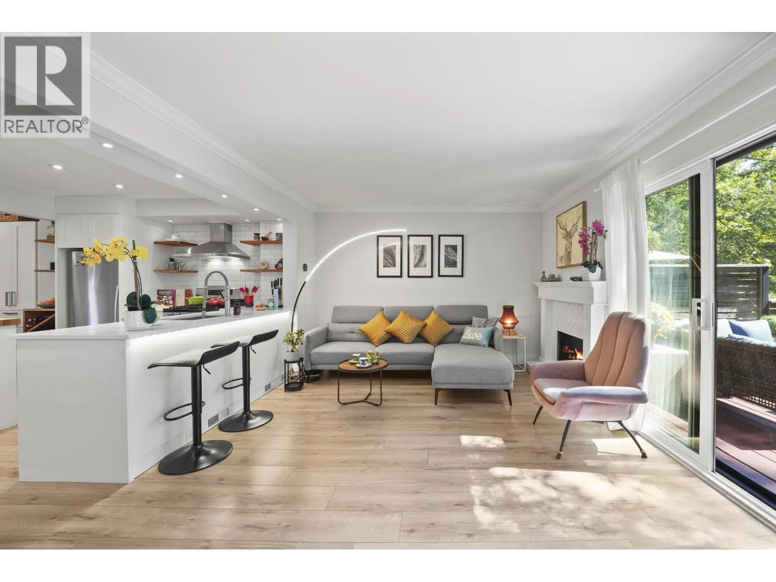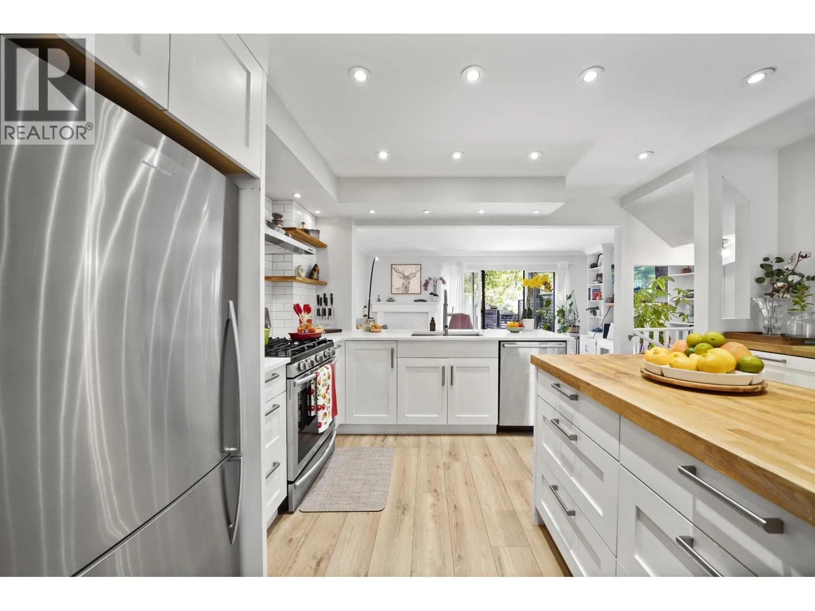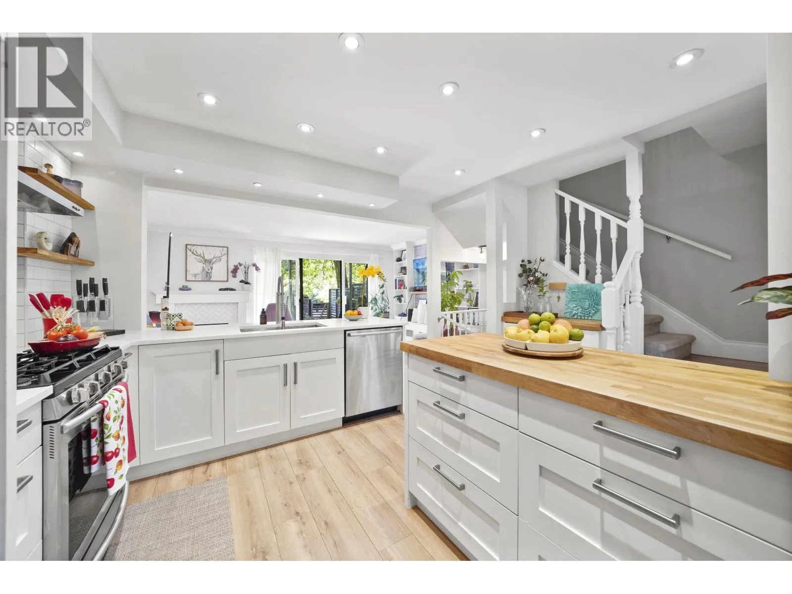 Welcome to your new home - where the comfort of a detached house meets low maintenance townhome with modern finishing! Nestled in a quiet, tree-lined community, this SE-facing home offers privacy, space & a seamless indoor-outdoor lifestyle with newly painted 325sqft patio. Enter from your front porch by the carport with overhead storage, or through your private gate. The open-concept chef´s kitchen features Caesarstone quartz counters, s/s appliances, gas stove, & a centre island perfect for entertaining or a growing family. Upstairs boasts 3 beds incl a spacious primary with custom closets & renovated bath. The lower level offers a family room, den/4th bedroom, laundry, & extra storage. Close to parks, schools, shops, rec centre, transit, & trails-this home is West Coast living at its best! (id:27476)