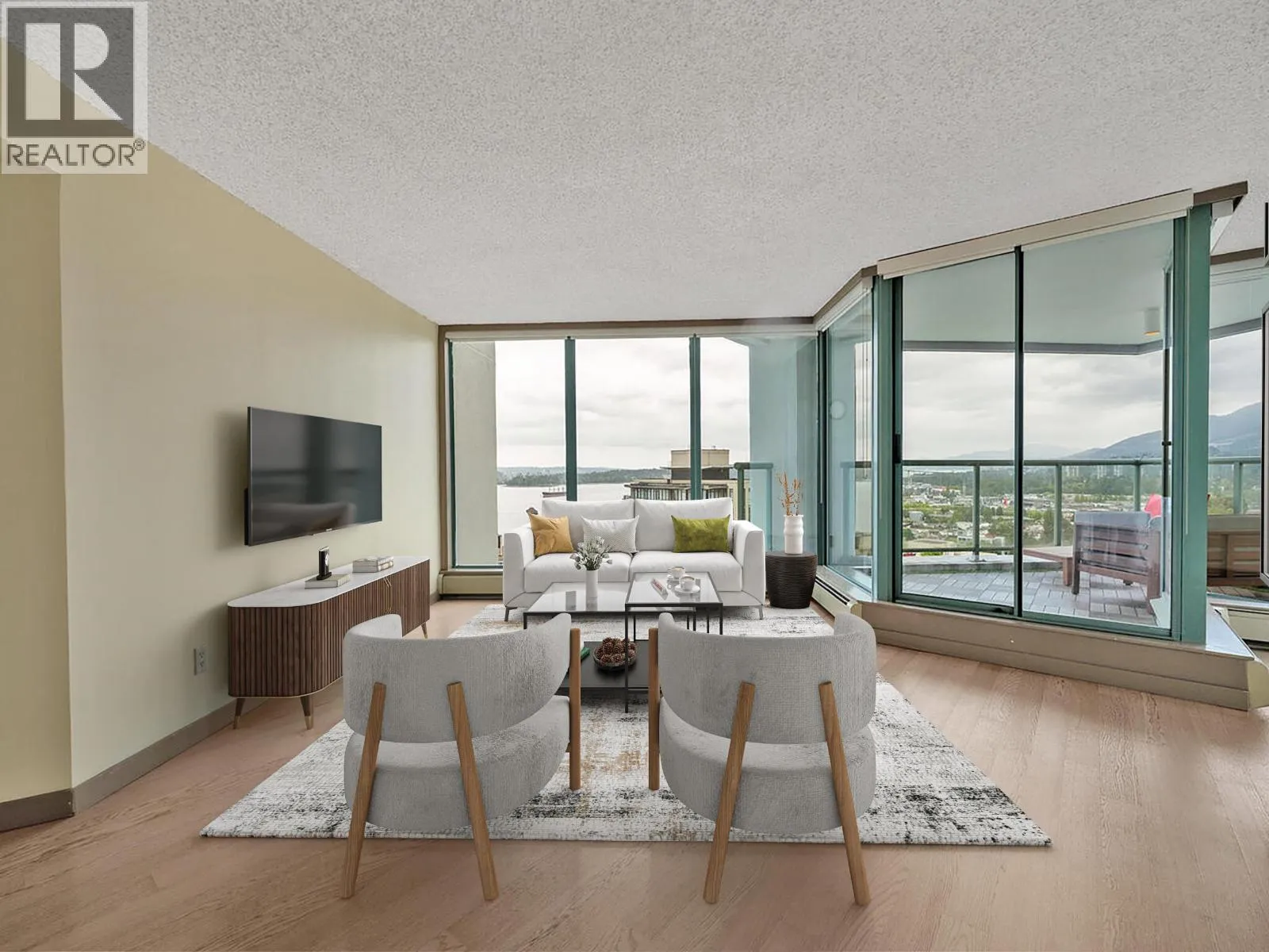 The Observatory - Unobstructed Views & Investment Appeal Enjoy spectacular, unobstructed ear-to-ear views from this 2 bed, 2 bath unit in a boutique building with only 3 units per floor. Offering over 1100 square ft and a layout ideal for house-sized furniture. Floor-to-ceiling windows and a spacious patio showcase panoramic views from every room. Updates include hardwood floors, fresh paint, and new blinds-move-in ready, with room to personalize or renovate. Resort-style amenities include an outdoor pool, fitness centre, and lush landscaped gardens. Bonus: 2 side-by-side parking stalls and a large storage locker. Located steps from Lonsdale Quay, Seabus, shopping, and LoLo´s vibrant restaurant scene-an ideal rental or resale location for long-term growth. Pet-friendly and ready for its next chapter. (id:27476)