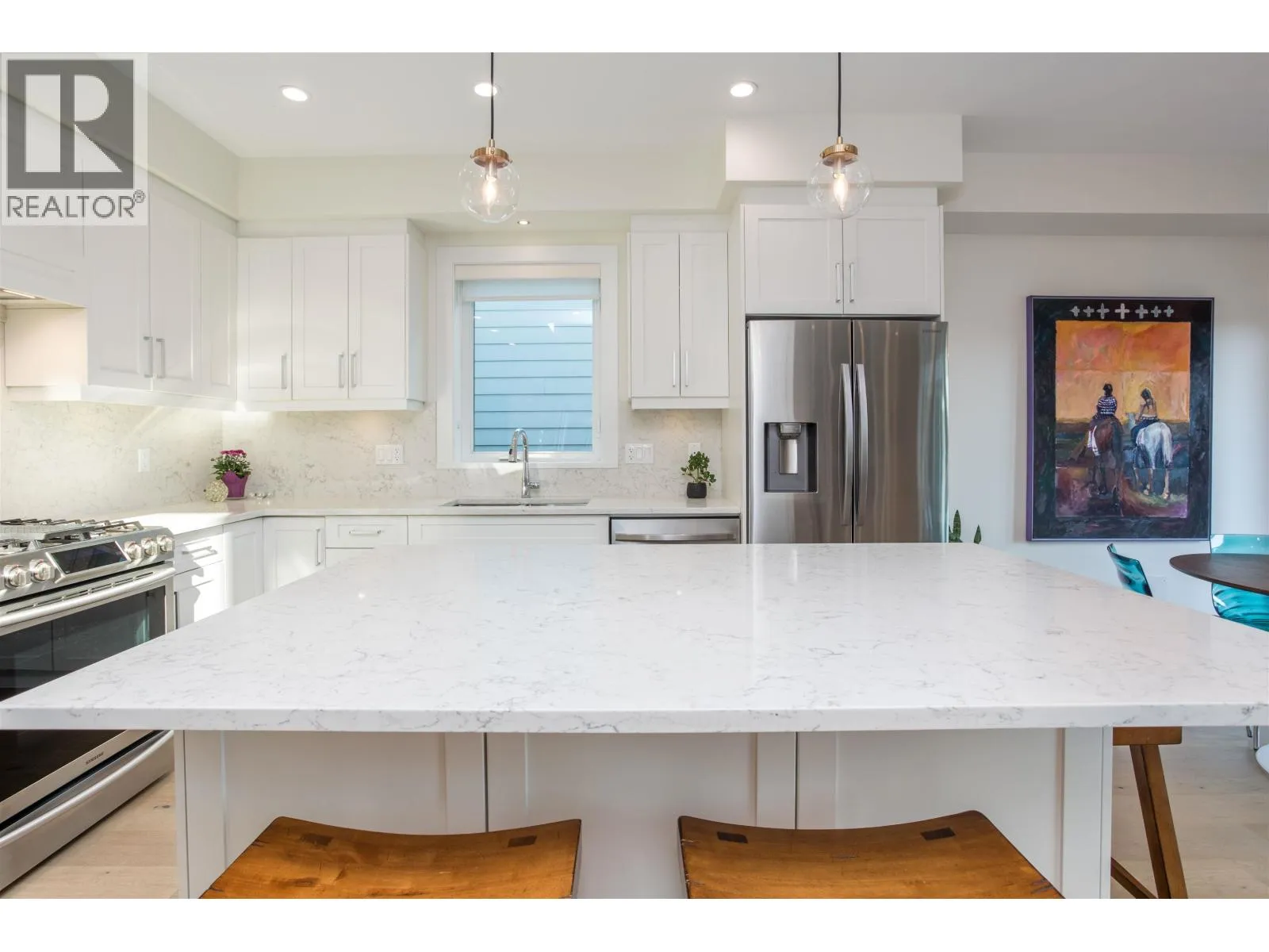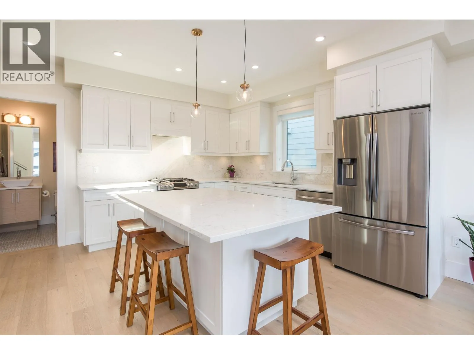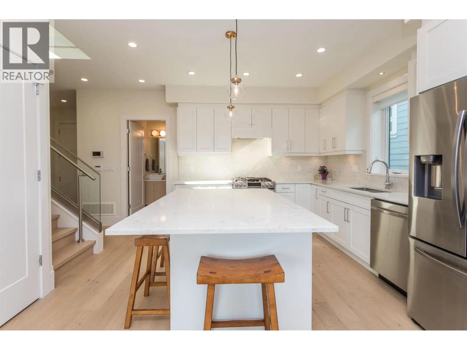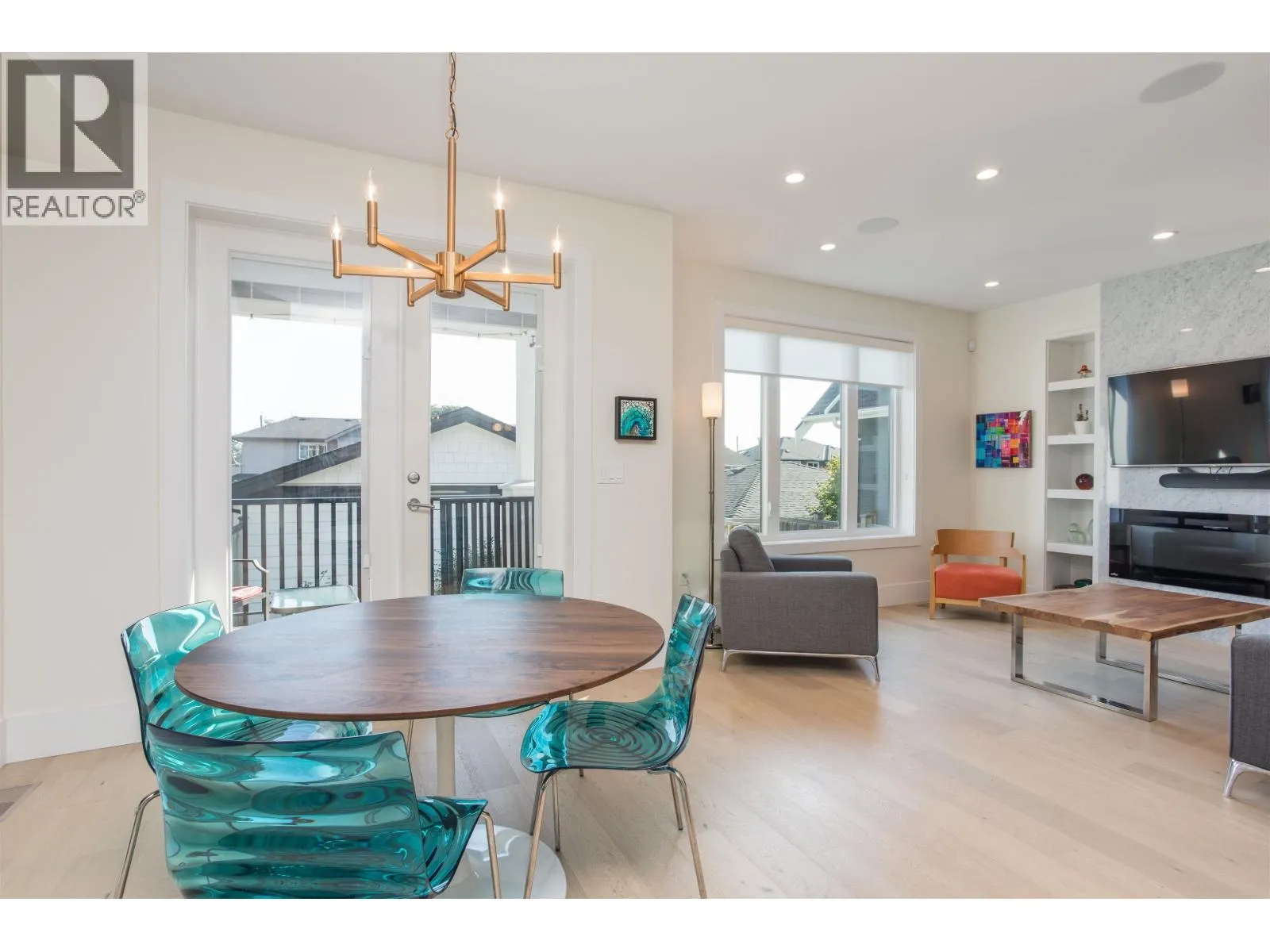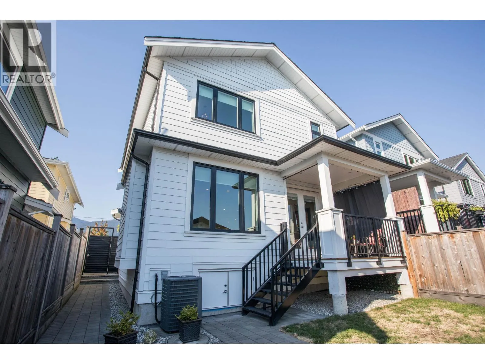 Nestled between the urban conveniences of Central Lonsdale and the serenity of Ray Perrault Park and Grand Boulevard, this custom-built half duplex offers the best of both worlds. Spanning two levels, it features soaring ceilings, hardwood floors, A/C, a cozy fireplace, and an expansive crawl space. The bright kitchen with large island, stone counters, and high-end appliances flows seamlessly into the sunlit dining and living areas. Upstairs, the private primary suite includes a partial skyline view, while two additional bedrooms complete the traditional family layout. Enjoy outdoor living on the south-facing deck or in the fully fenced yard. With lane access to a detached garage and a prime walkable location, this is the perfect family home-without strata fees or restrictions! (id:27476)