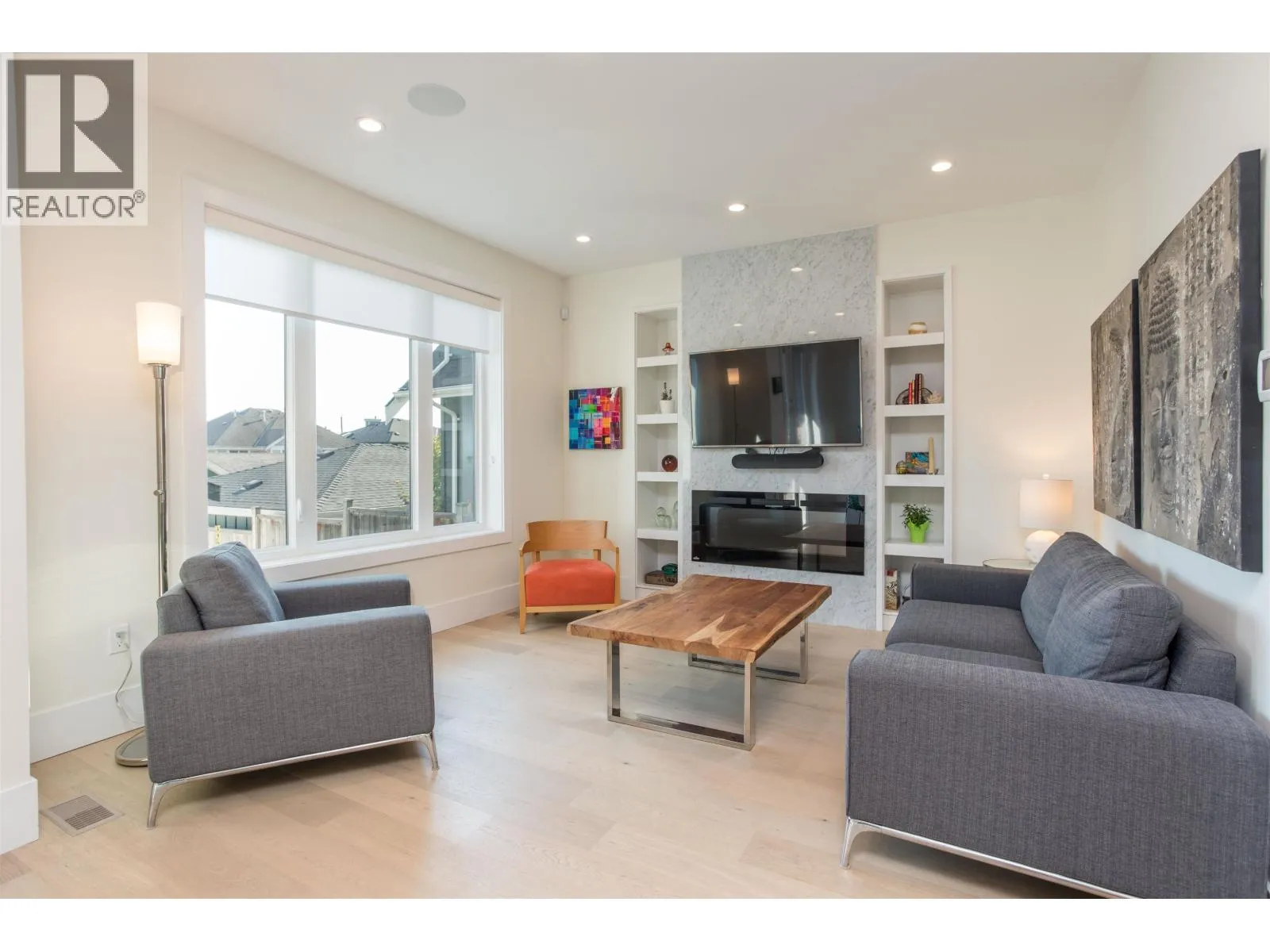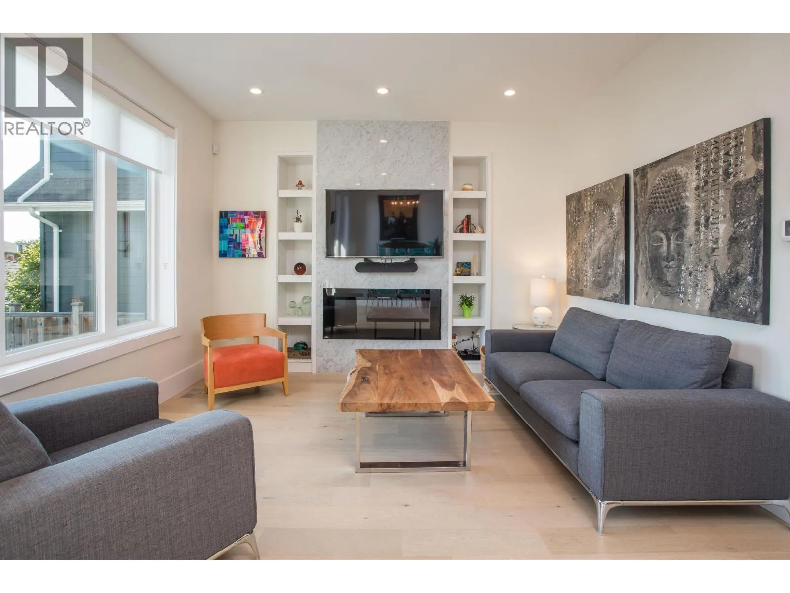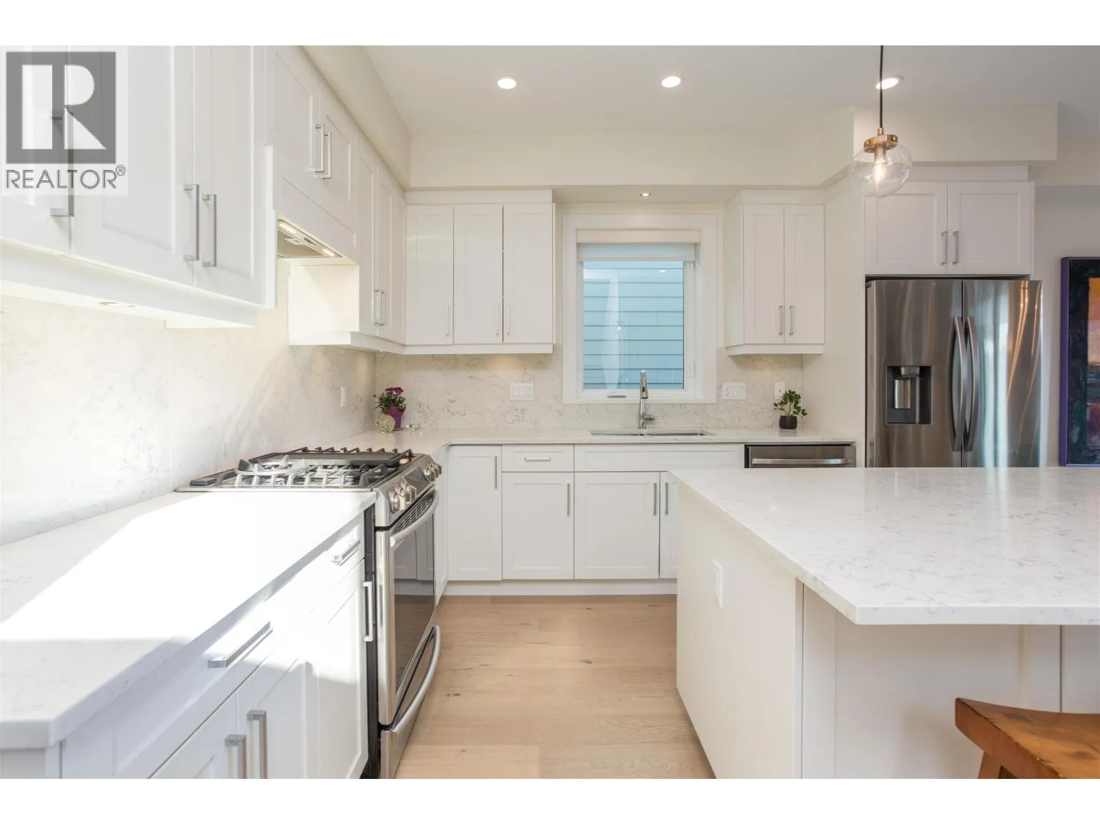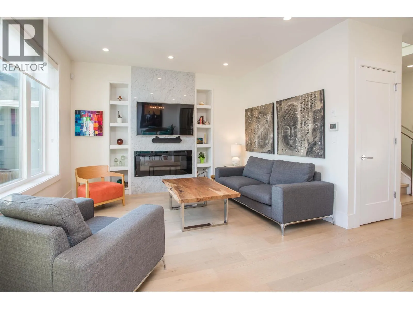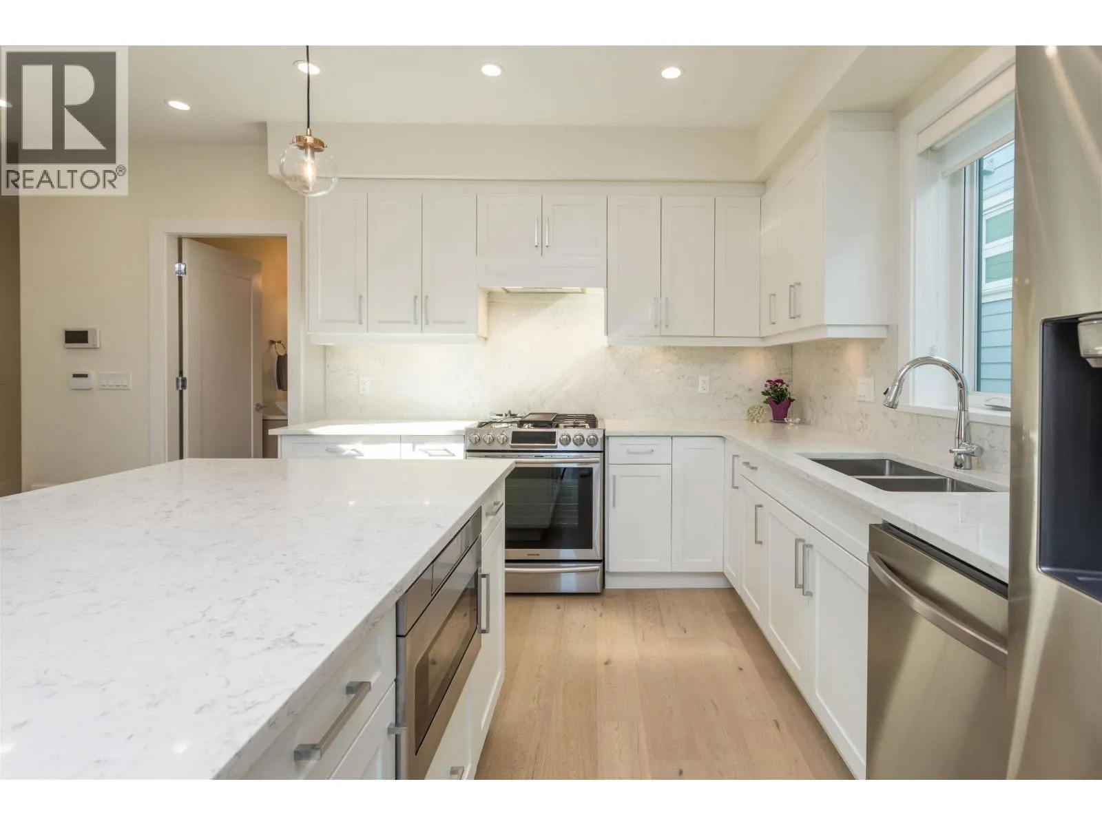 Nestled between the urban conveniences of Central Lonsdale and the serenity of Ray Perrault Park and Grand Boulevard, this custom-built half duplex offers the best of both worlds. Spanning two levels, it features soaring ceilings, hardwood floors, A/C, a cozy fireplace, and an expansive crawl space. The bright kitchen with large island, stone counters, and high-end appliances flows seamlessly into the sunlit dining and living areas. Upstairs, the private primary suite includes a partial skyline view, while two additional bedrooms complete the traditional family layout. Enjoy outdoor living on the south-facing deck or in the fully fenced yard. With lane access to a detached garage and a prime walkable location, this is the perfect family home-without strata fees or restrictions! (id:27476)