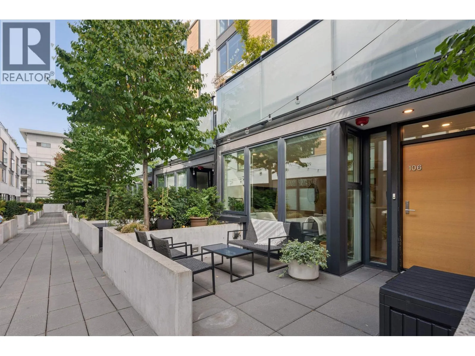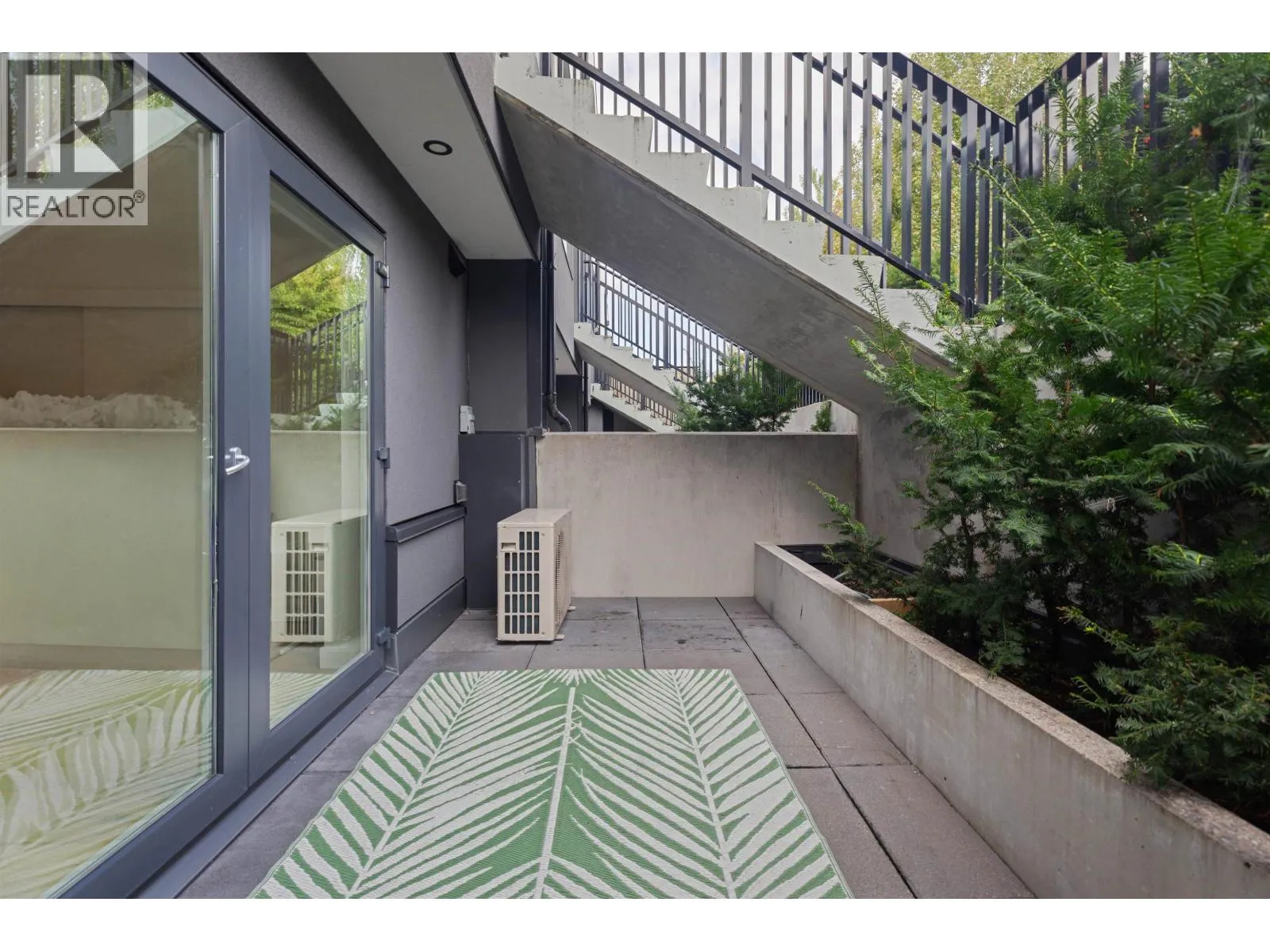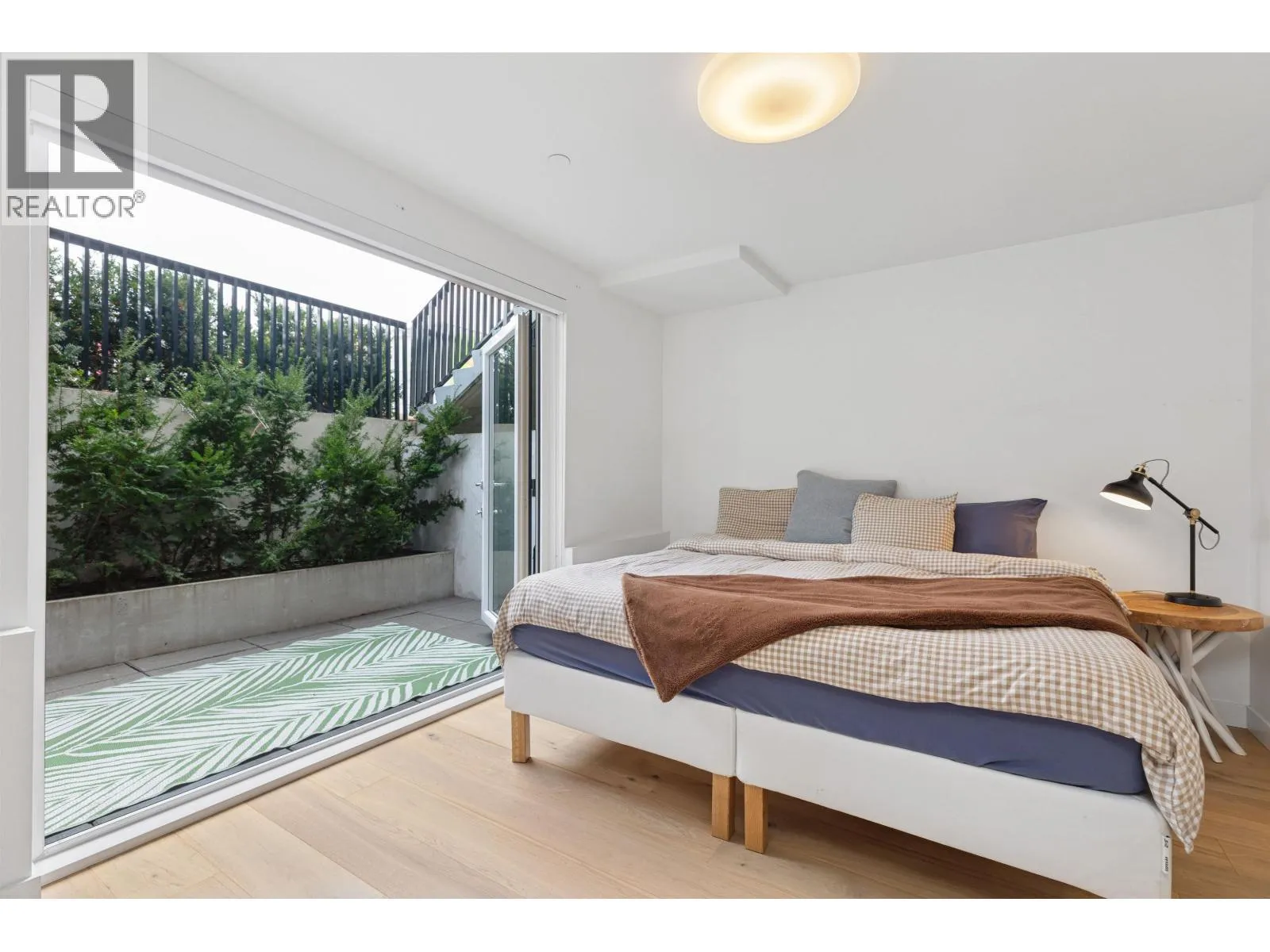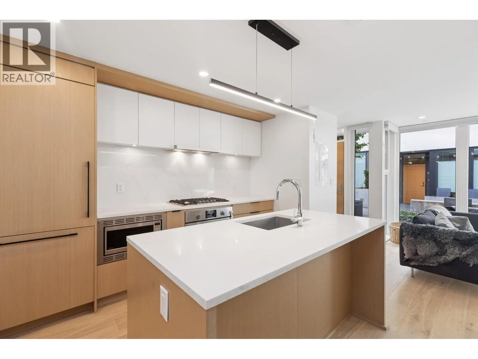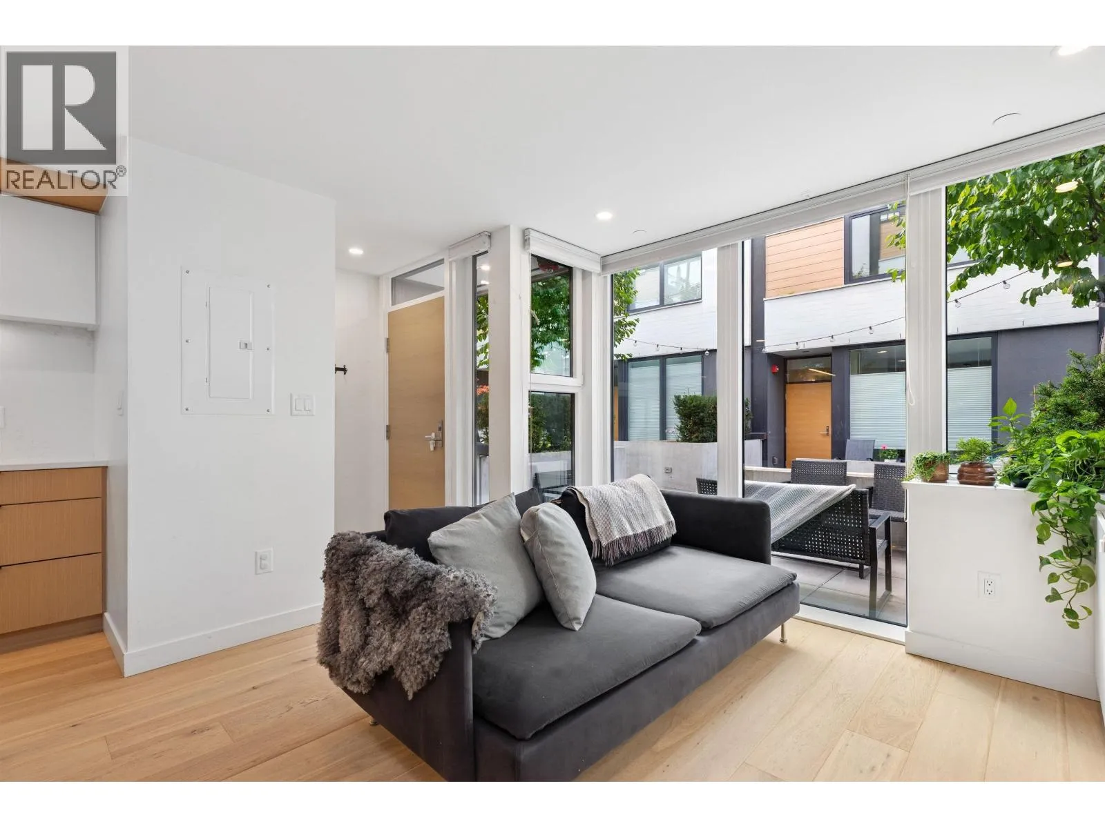 Welcome to The Morrison - boutique West Coast living at its finest! This garden-level 1 bed+ den shines with two expansive patios (230+ sq. ft.) including natural gas hookups, perfect for entertaining or relaxing outdoors. Inside, enjoy a luxury kitchen with Bosch appliances, quartz island with countertops, and custom cabinetry, all flowing into a bright open-plan living space with floor-to-ceiling windows. Wide-plank oak floors, radiant in-floor heating, upgraded dual zone Air Conditioning throughout highlight the home's high-end quality. The oversized den with sliding doors easily doubles as a 2nd bedroom or office. Steps to Moodyville Park, Spirit Trail, and all the Lower Lonsdale amenities. Don't miss this incredible garden level property! (id:27476)