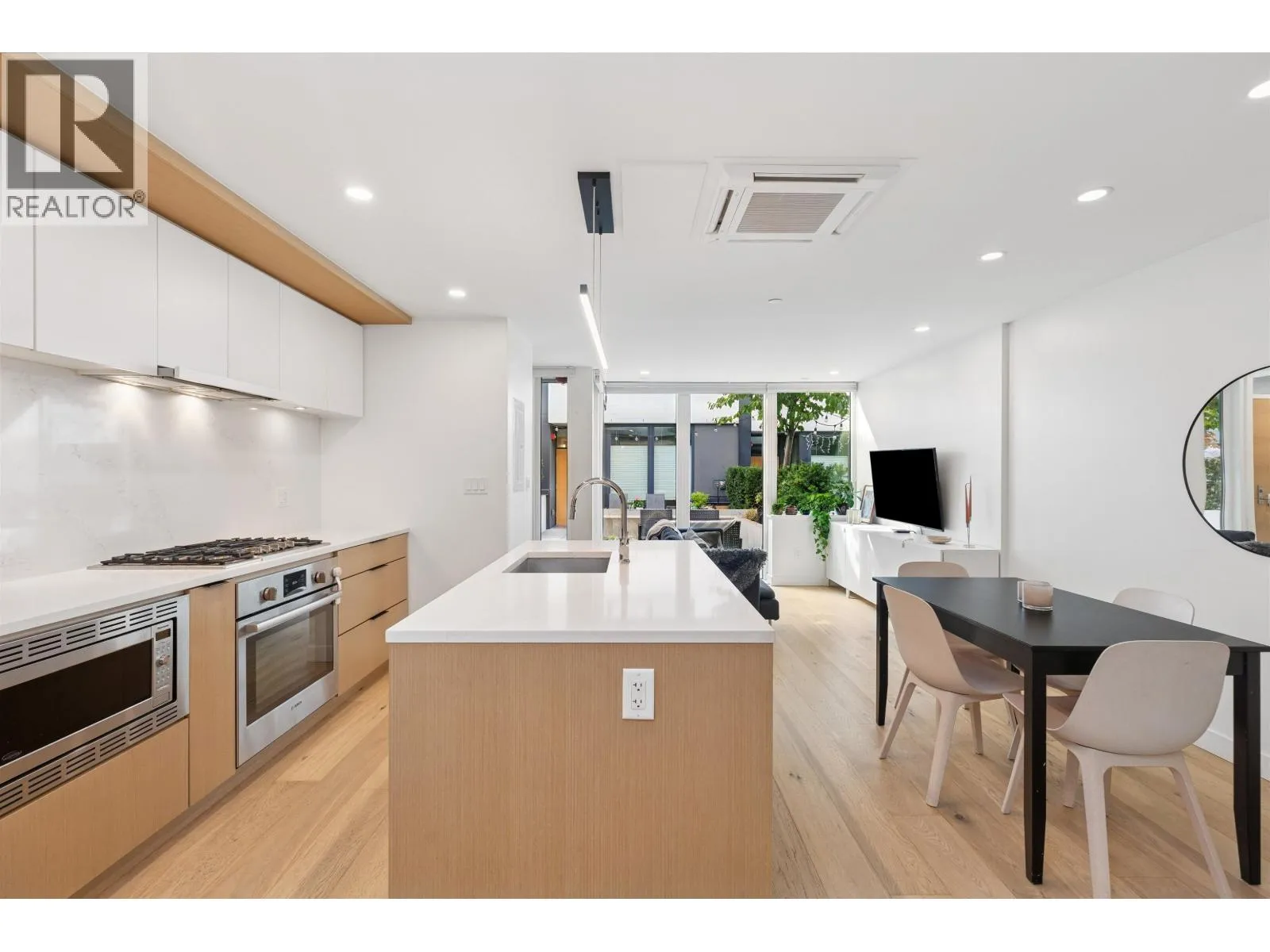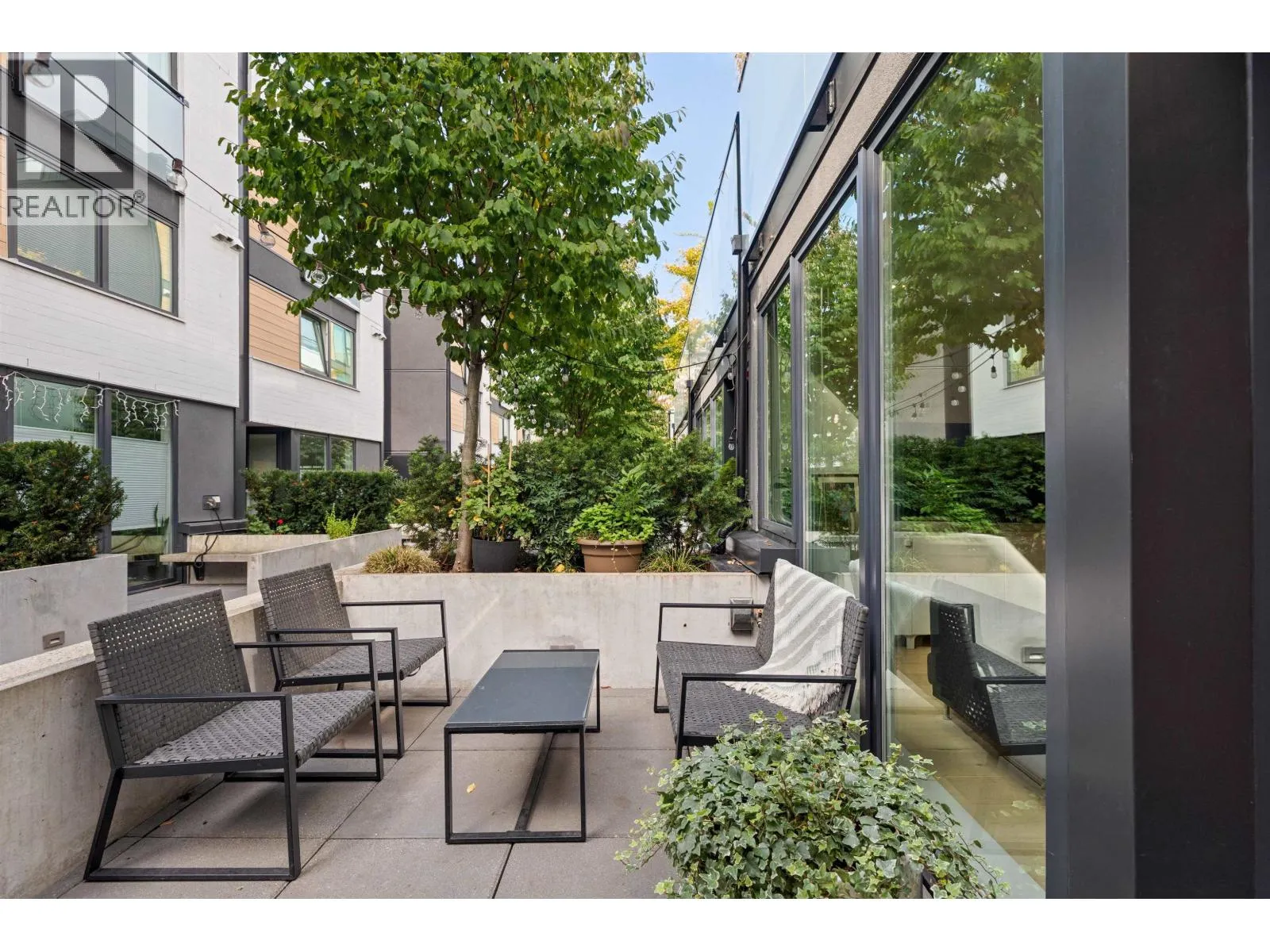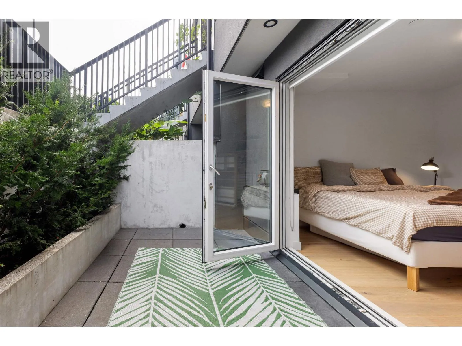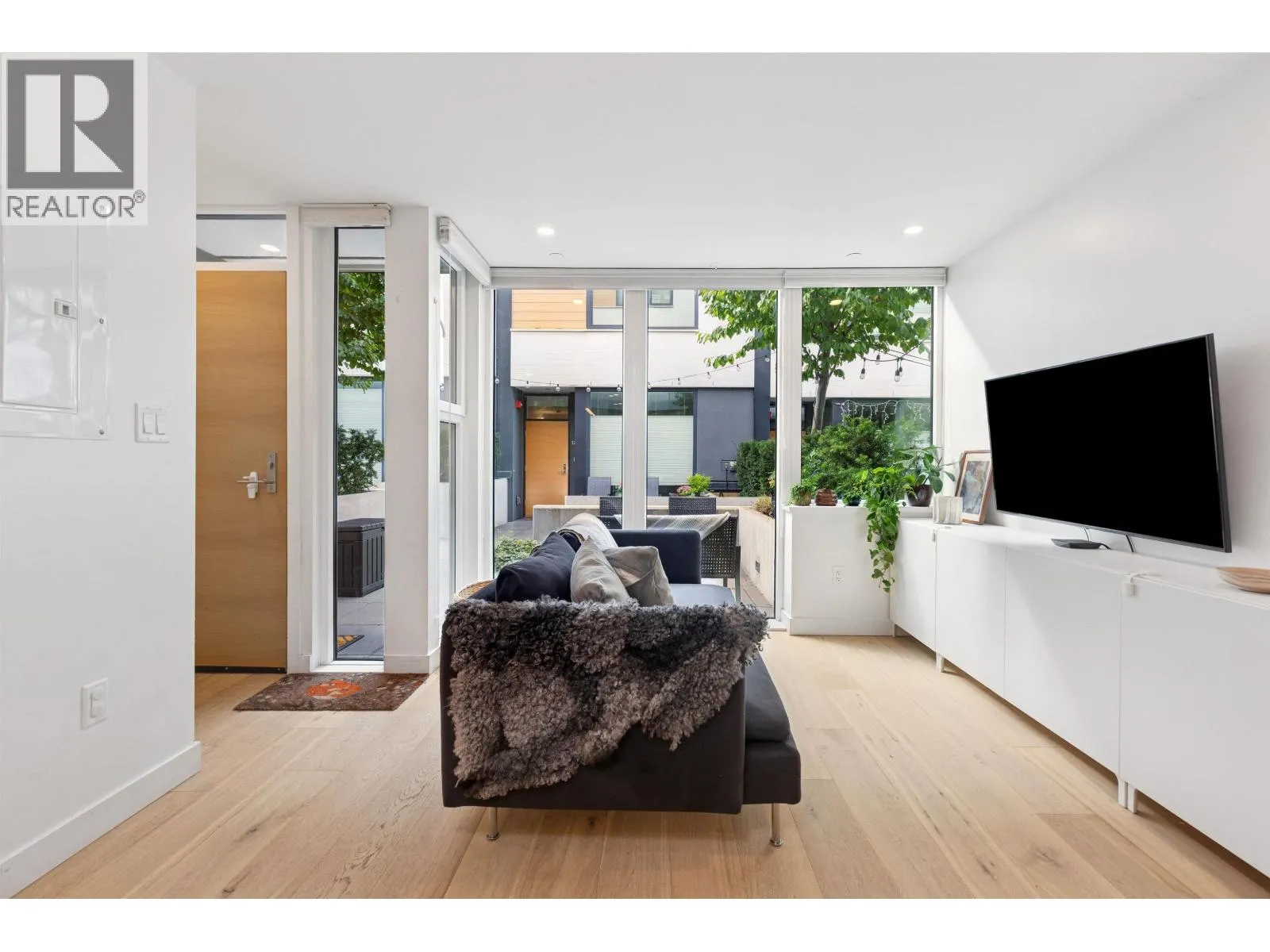 Welcome to The Morrison - boutique West Coast living at its finest! This garden-level 1 bed+ den shines with two expansive patios (230+ sq. ft.) including natural gas hookups, perfect for entertaining or relaxing outdoors. Inside, enjoy a luxury kitchen with Bosch appliances, quartz island with countertops, and custom cabinetry, all flowing into a bright open-plan living space with floor-to-ceiling windows. Wide-plank oak floors, radiant in-floor heating, upgraded dual zone Air Conditioning throughout highlight the home's high-end quality. The oversized den with sliding doors easily doubles as a 2nd bedroom or office. Steps to Moodyville Park, Spirit Trail, and all the Lower Lonsdale amenities. Don't miss this incredible garden level property! (id:27476)