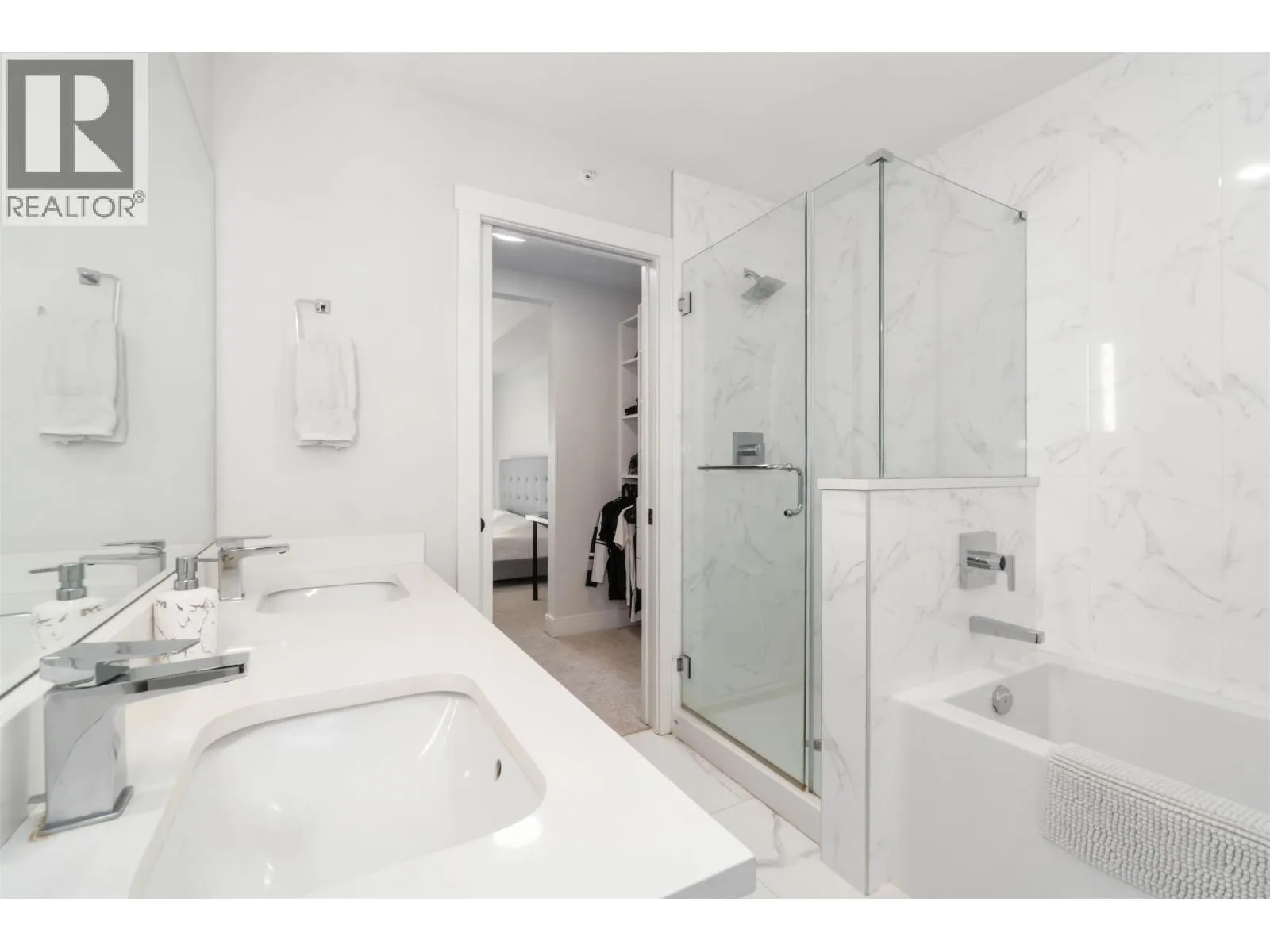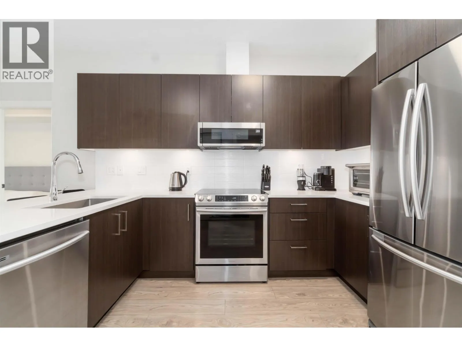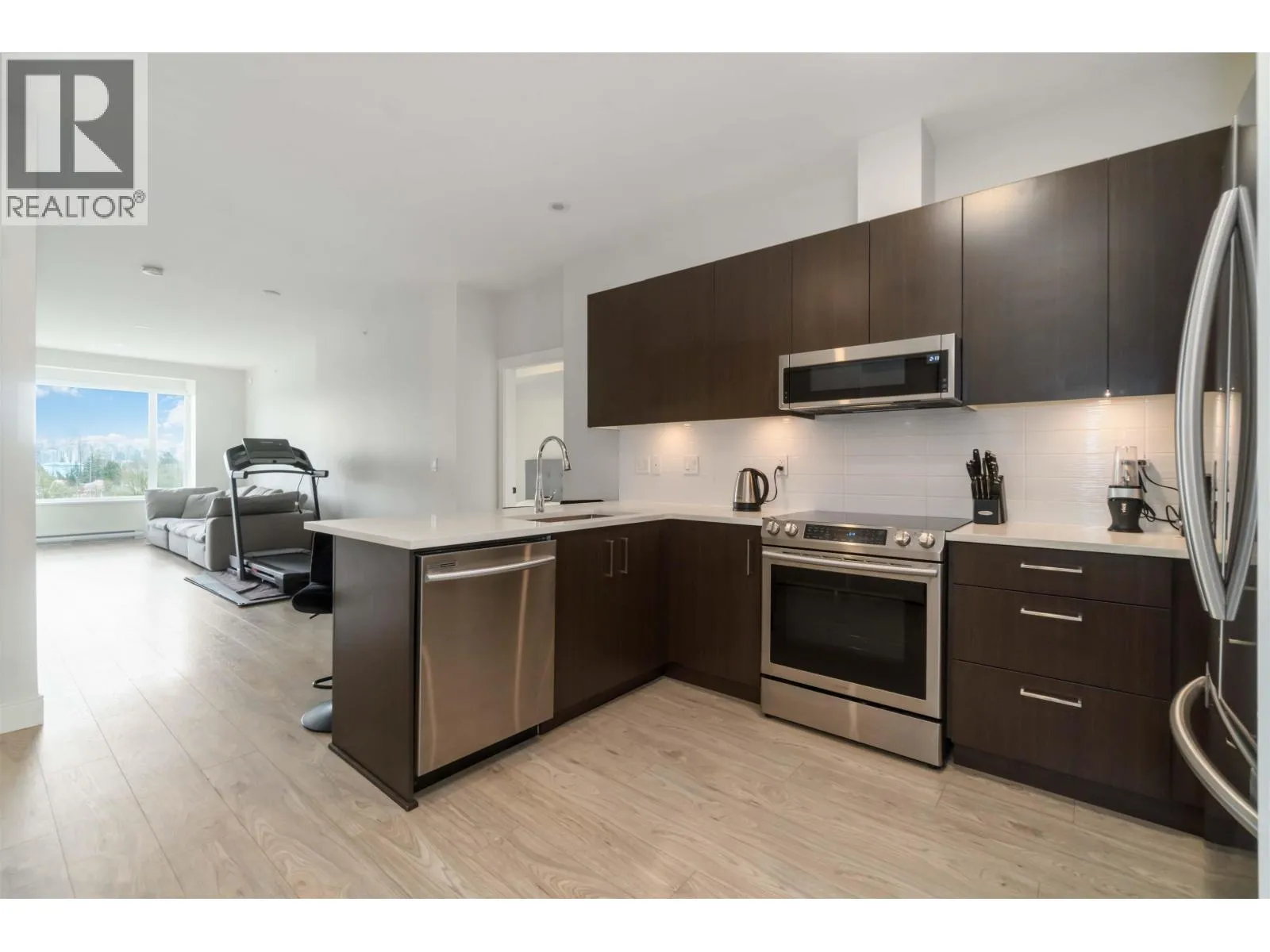 Tatlow Homes! Don't miss this PENTHOUSE beautifully designed 2 bed + large den, 2 bath in Lion's Gate Village area. This spacious home is appointed with laminate flooring, quartz counters, full-sized stainless appliances, and roller shades. Enjoy natural light streaming through large bay windows & step out onto one of TWO private balconies taking in views of Downtown Vancouver. The large primary bedroom features a walk-through closet & an en-suite with a tub, frameless glass shower, & dual-vanity countertop. This home even has a perfect office-sized den for a work from home setup. The building features guest parking, a gym, and a lobby lounge. Located near Park Royal, Ambleside Beach, & Lions Gate Village. 1 parking + 1 locker included! (id:27476)