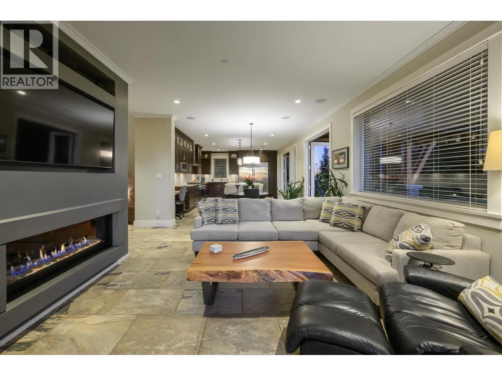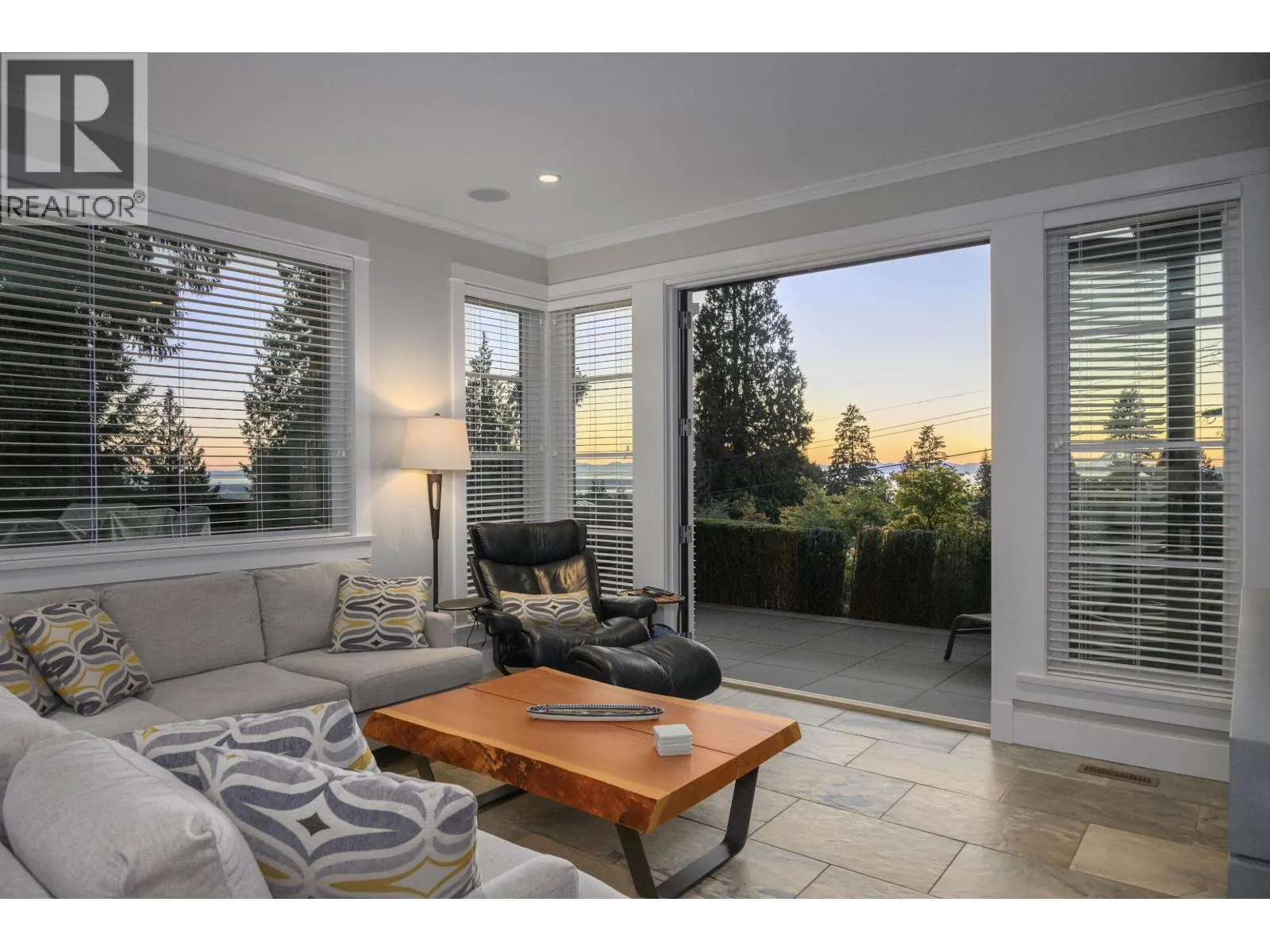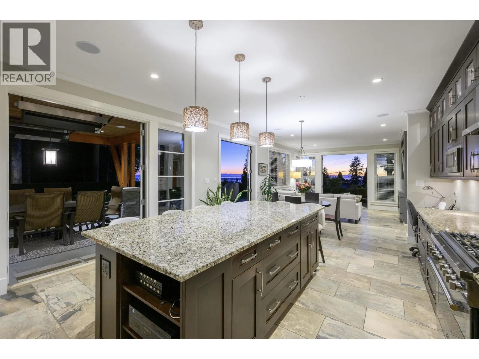 Custom-built West Coast contemporary home with expansive views from Downtown to Vancouver Island. Situated on a 7,480 sqft flat lot with no neighbours, this well-designed, 5 bed, 5 bath, 4,847 sqft home exudes quality & attention to detail. The main showcases an open concept kitchen & living space on the west side featuring a chef´s kitchen that connects thru 3 sets of French doors to over 1,100 square ft of stone, patio space, 450 sqft that´s covered & heated, with built-in bbq, hot tub, & firepit that looks out to the flat lawn. The main also includes a formal dining & living rm, mud rm with seperate entry for active families, & office/den at the front. Upstairs enjoys 3 beds & 2 full baths, with 5 pc ensuite, large walk-in-closet, & west facing balcony off the primary to take in sunsets. Can't forget the 1 bed legal suite, huge rec/games rm with gas fireplace, & 1 more bed/bath down. Include a 3-car garage, A/C, impressive street appeal, with the home backing onto greenbelt - wow! (id:27476)
