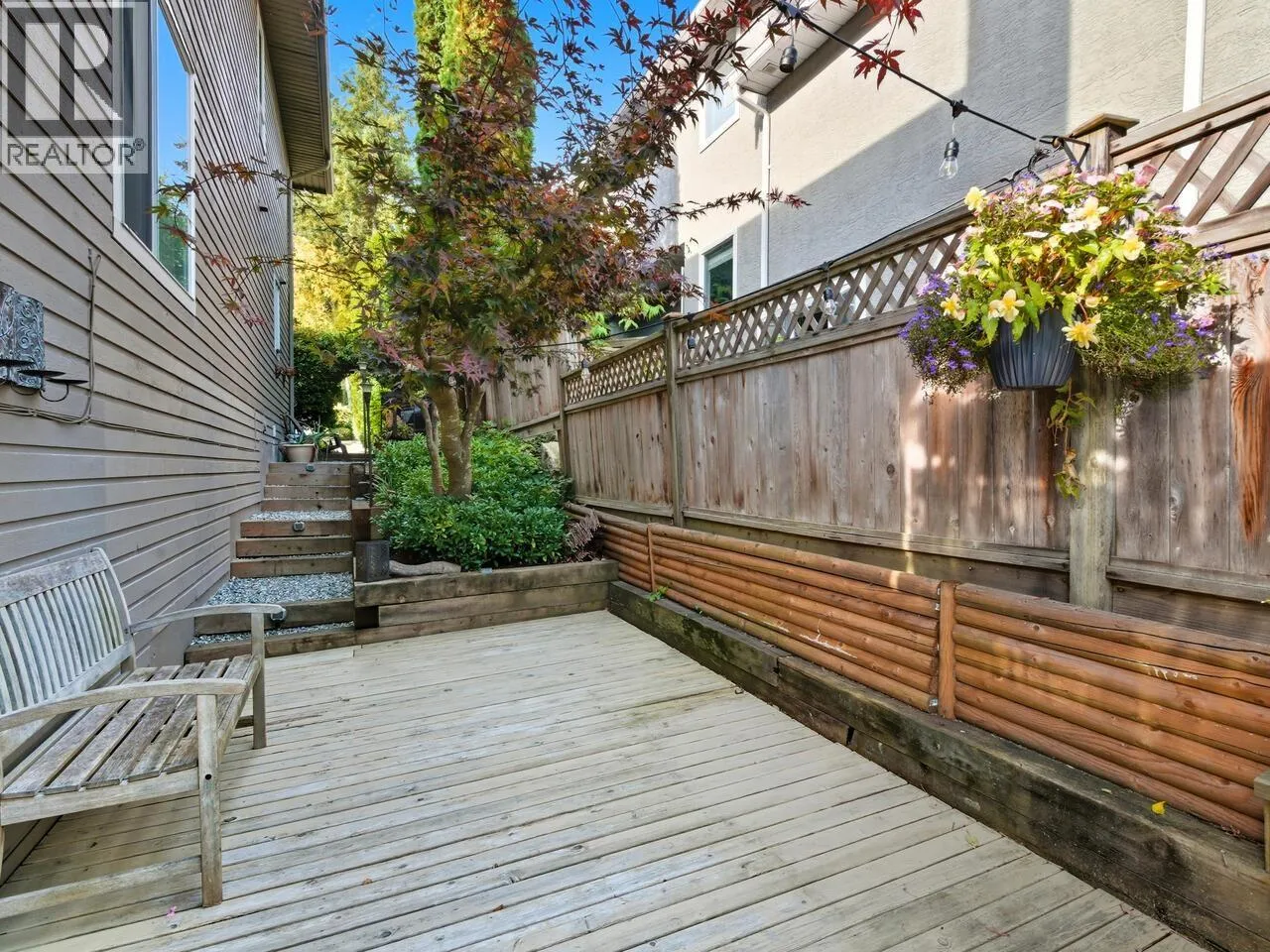 Best suite in complex? Bright end unit gives extra windows, light & much larger yard. Kitchen fully updated w/custom cabinets, stainless steel, glass tile splash, Bosch stove, quartz countertops, & butcher block island. This home flows from entry thru kitchen, w/real maple hardwood floor, to sunken livingroom & balcony above HUGE wrap around wooden sundeck yard. Up offers 3 full beds & 2 full baths incl. ensuite with soaker tub. Down has 4th washroom (can add shower), laundry room, den, and big walk out rec room that can be bed #4. Re-piped 2021, double windows, 1 car garage + 2 more parking. Close to schools, rec centre, Mt Seymour, Cates Park, Deep Cove, Honey's Doughnuts, major trails, the BEACH, Quarry Rock, bus, and more. Call now! (id:27476)