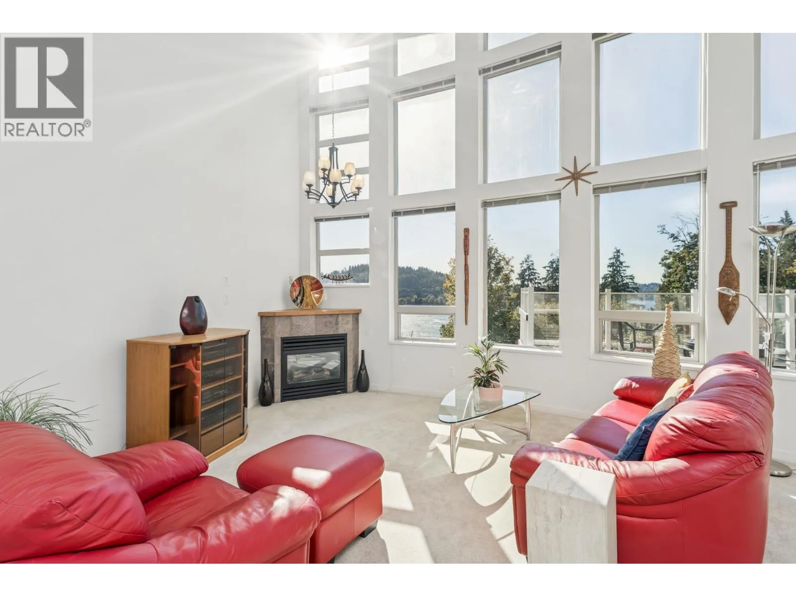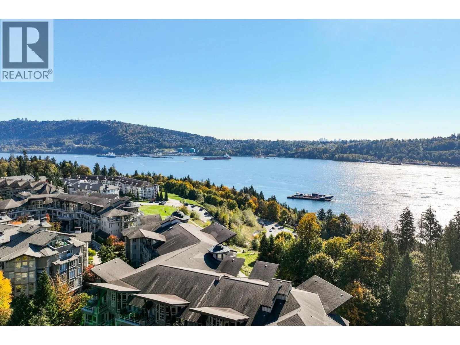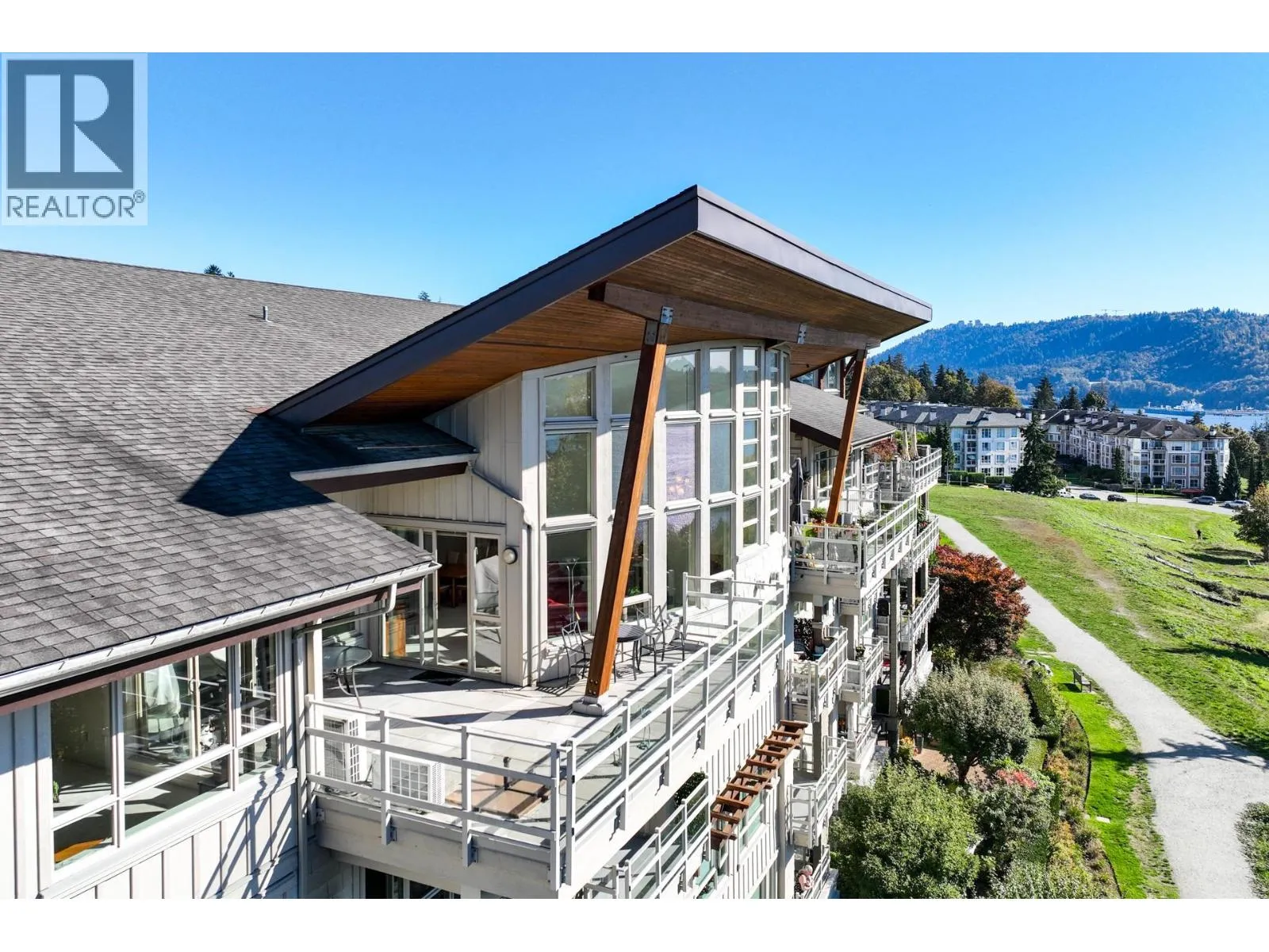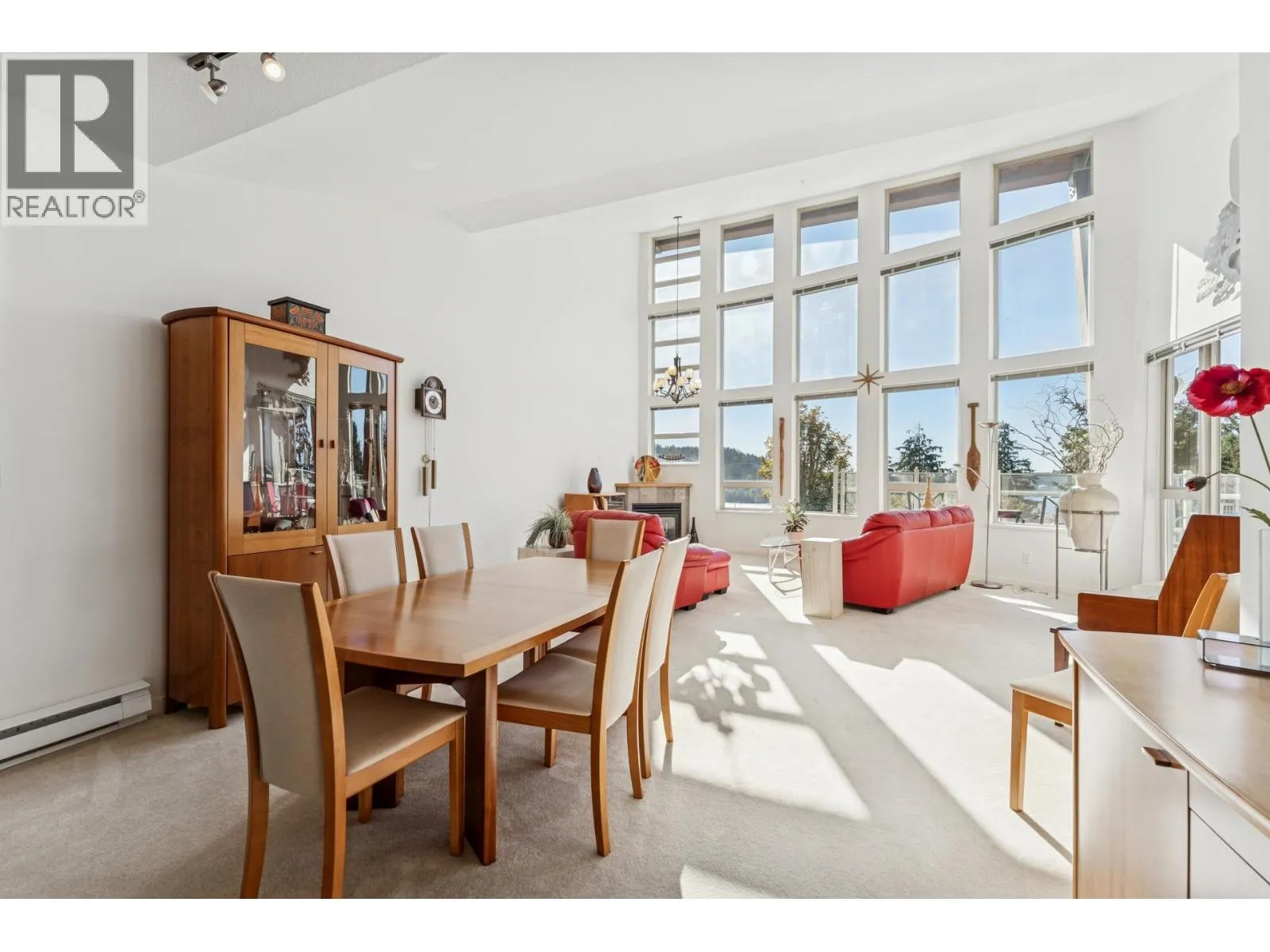 Stunning Ocean View Penthouse at Seasons West. This south-facing 3-bdrm, 2-bath home offers over 1,600 sq. ft. of refined single-level living plus a 300 sq. ft. view deck. Soaring vaulted ceilings and expansive windows frame sweeping ocean and forest vistas, while the open-concept design allows for house-sized furniture and effortless entertaining. The chef´s kitchen features granite counters, stainless steel appliances, and bar seating, and opens to a versatile family room-perfect as a lounge, playroom, or home office. The primary suite enjoys lie-in-bed views, deck access, a walk-through closet, & a 5-pce ensuite. With A/C, two parking stalls, and access to resort-style amenities, all just minutes from Deep Cove, Cates Park, & Mount Seymour, this home defines elevated coastal living. (id:27476)