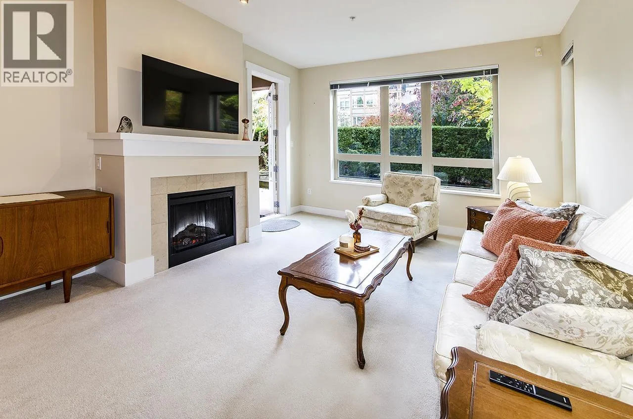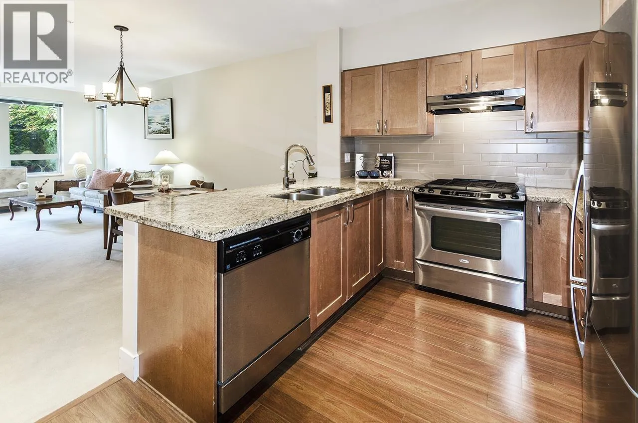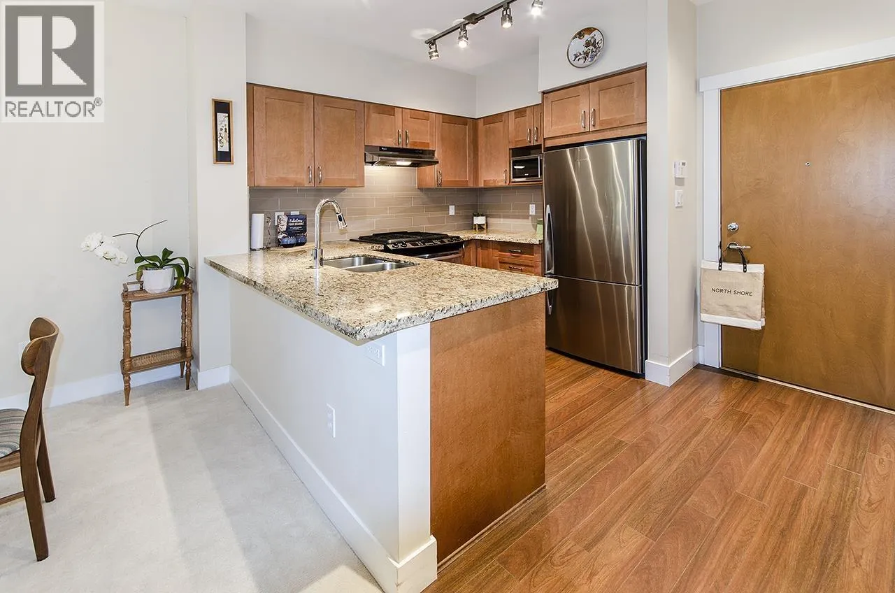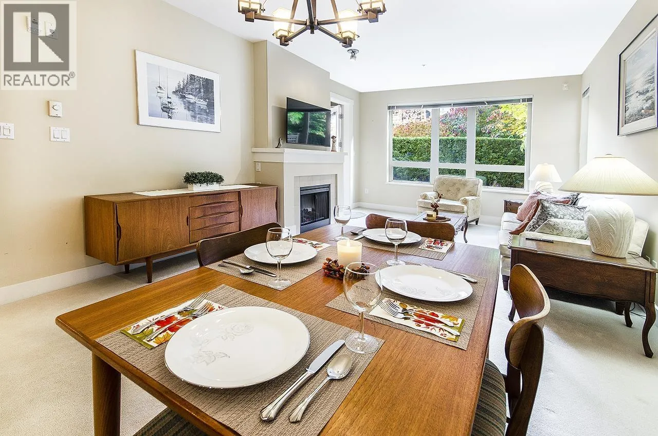 Discover this beautifully maintained ground-floor home offering one-level living with privacy. Features include a private gated entrance, lush gardens, and a spacious outdoor patio-perfect for relaxation and entertaining. Bright and open plan, offers 2 beds, 2 baths, granite countertops, stainless steel appliances, and a cozy fireplace. The primary suite has a walk-in closet and large ensuite with garden views. Additional benefits include in-suite laundry, prime location for underground parking spot, pet-friendly amenities, fitness studio, guest suite, bike room, and a private courtyard. Conveniently located near trails, Lynn Valley Centre, parks, and recreation. A rare, house-like feel in a vibrant community! (id:27476)