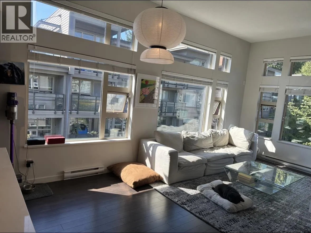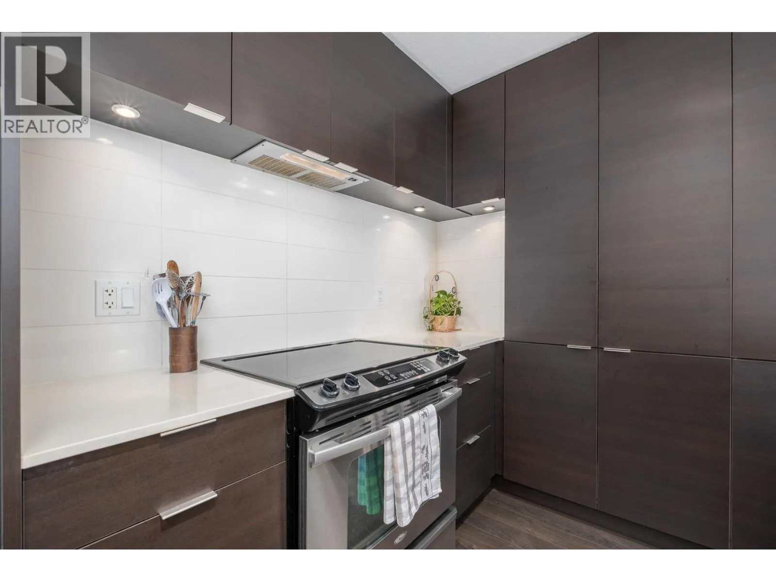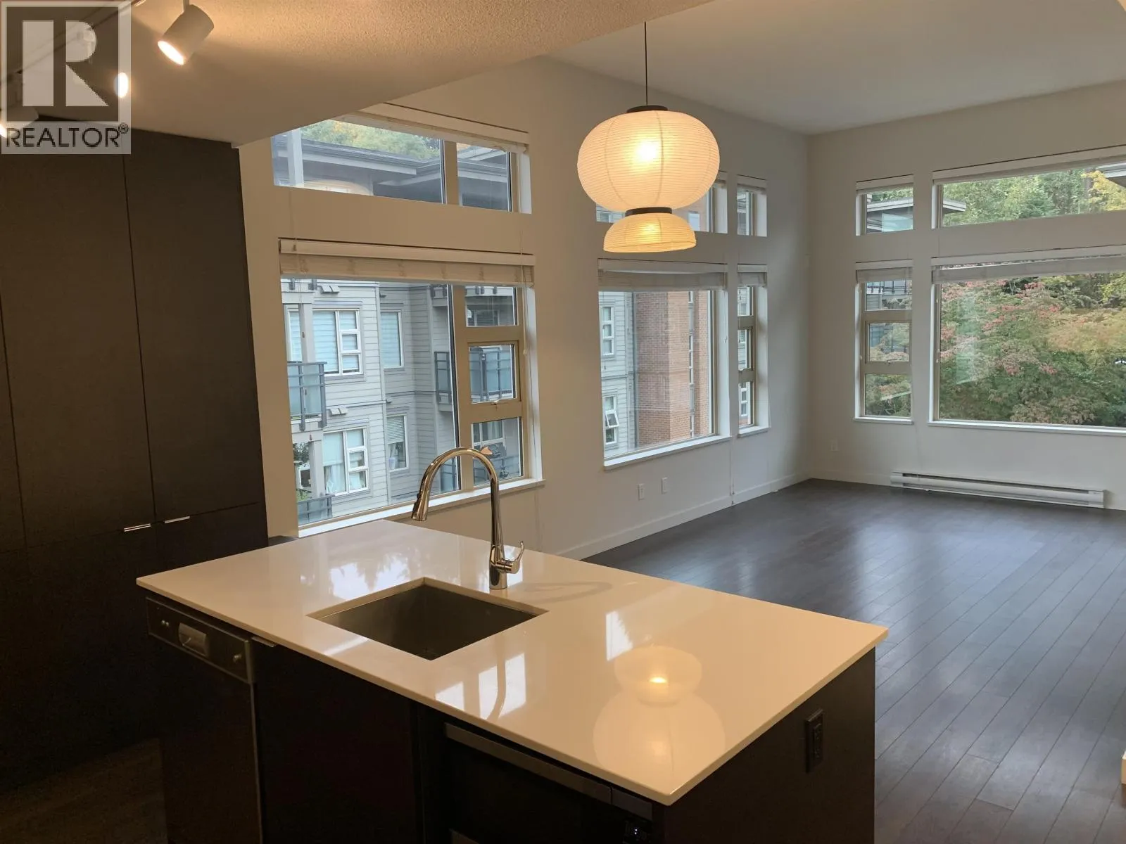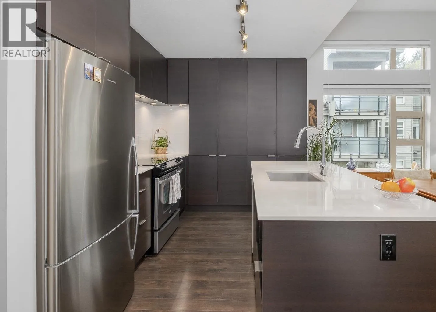 One of the nicest units in whole complex at the popular District Crossing by award winning Qualex Landmark. This 1 bedroom+den penthouse is a corner suite facing north/west on the quiet side of the building off Marine Drive. The layout features a covered patio, generous sized den & a creative office nook in the main living space. The living space is open & flowing boasting nearly 11 foot ceilings, large windows with two outlooks maximizing the home's natural light. Modern kitchen features a large island, stainless steel appliances, quartz countertops & ample cabinet space. 1 Parking -1 Storage locker. Rentals & pets welcome. Centrally located walking distance to great hiking trails, restaurants, shopping, groceries & Capilano Mall. All the necessities at your doorstep! (id:27476)