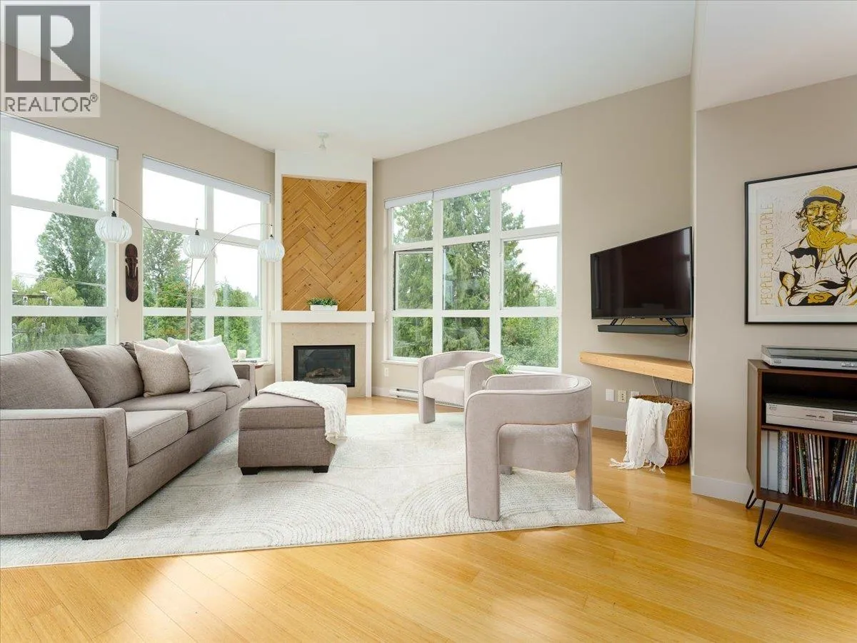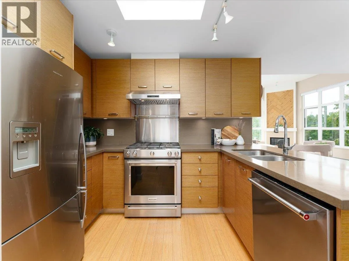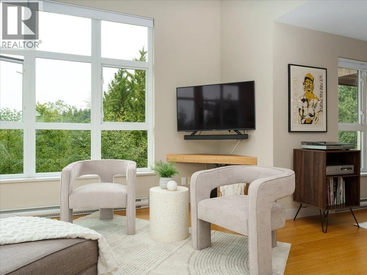 Live where adventure begins at your door. Catch the Mt. Seymour shuttle across the street for ski days, stroll with your clubs to Seymour Golf Club, or hit the Old Buck trailhead and North Shore mountain bike networks just minutes away. Deep Cove´s kayaking and paddleboarding are a quick drive-this is true North Shore living. This southwest corner penthouse is flooded with light thanks to vaulted ceilings, floor-to-ceiling windows, and skylights. Relax on the sunny south-facing balcony with gas hookup, or unwind in front of a cozy gas fireplace. Enjoy two spacious bedrooms, two full baths, and impressive storage, including your own private 8'10" x 6'4" gear room with soaring ceilings. Plus, rare three-car parking. The gourmet kitchen features quartz counters, stainless steel appliances, a pantry, and modern finishes. With fresh paint, updated blinds, and a new washer/dryer, it´s move-in ready. This home is more than a place to live...it´s a North Shore lifestyle! (id:27476)