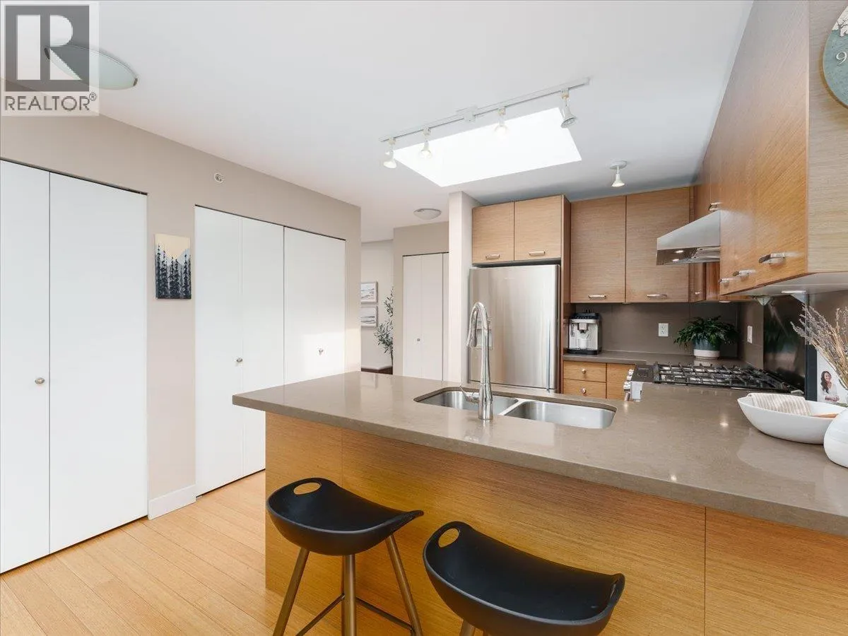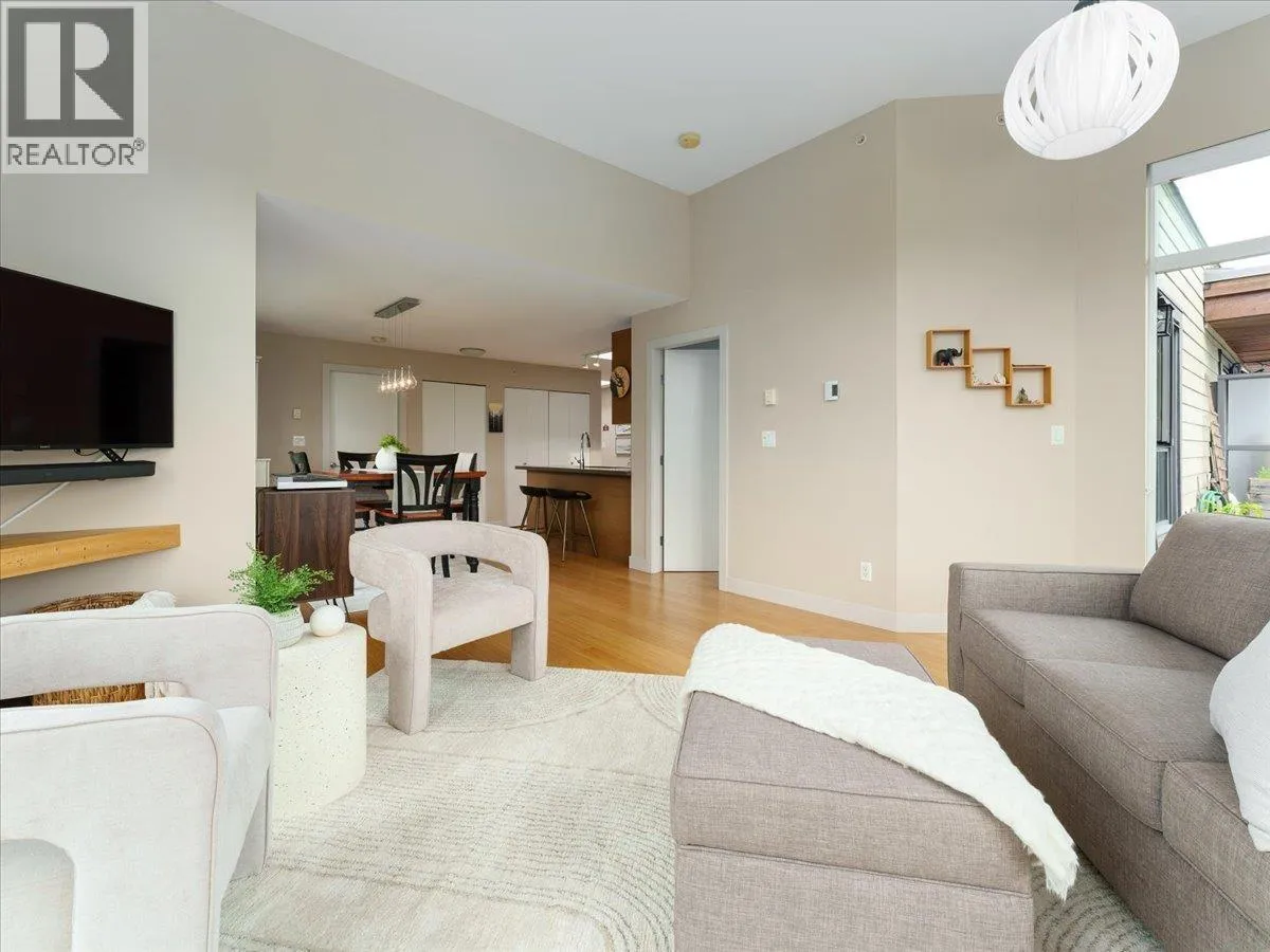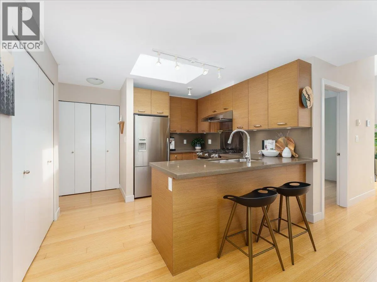 Live where adventure begins at your door. Catch the Mt. Seymour shuttle across the street for ski days, stroll with your clubs to Seymour Golf Club, or hit the Old Buck trailhead and North Shore mountain bike networks just minutes away. Deep Cove´s kayaking and paddleboarding are a quick drive-this is true North Shore living. This southwest corner penthouse is flooded with light thanks to vaulted ceilings, floor-to-ceiling windows, and skylights. Relax on the sunny south-facing balcony with gas hookup, or unwind in front of a cozy gas fireplace. Enjoy two spacious bedrooms, two full baths, and impressive storage, including your own private 8'10" x 6'4" gear room with soaring ceilings. Plus, rare three-car parking. The gourmet kitchen features quartz counters, stainless steel appliances, a pantry, and modern finishes. With fresh paint, updated blinds, and a new washer/dryer, it´s move-in ready. This home is more than a place to live...it´s a North Shore lifestyle! (id:27476)
