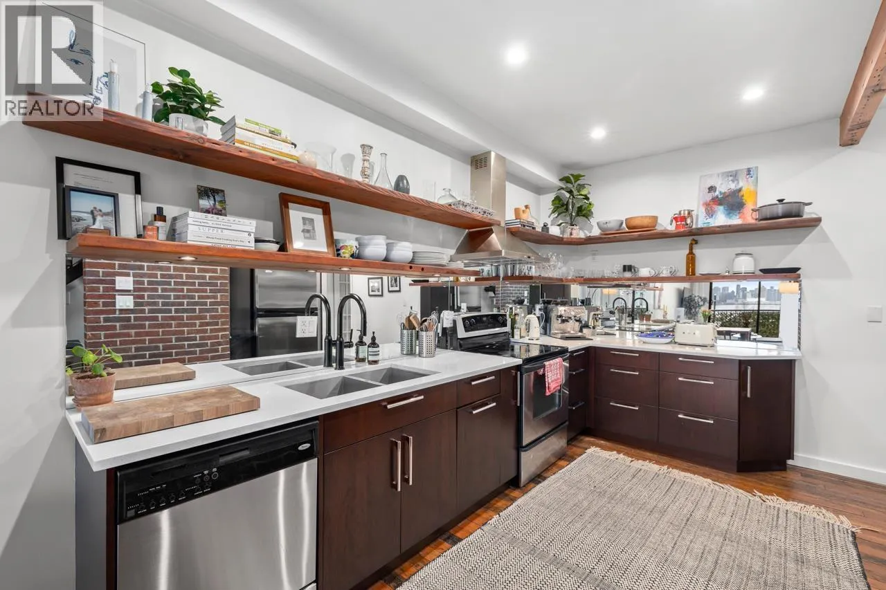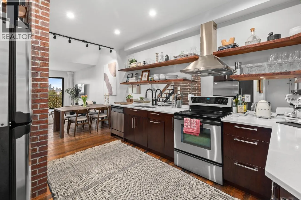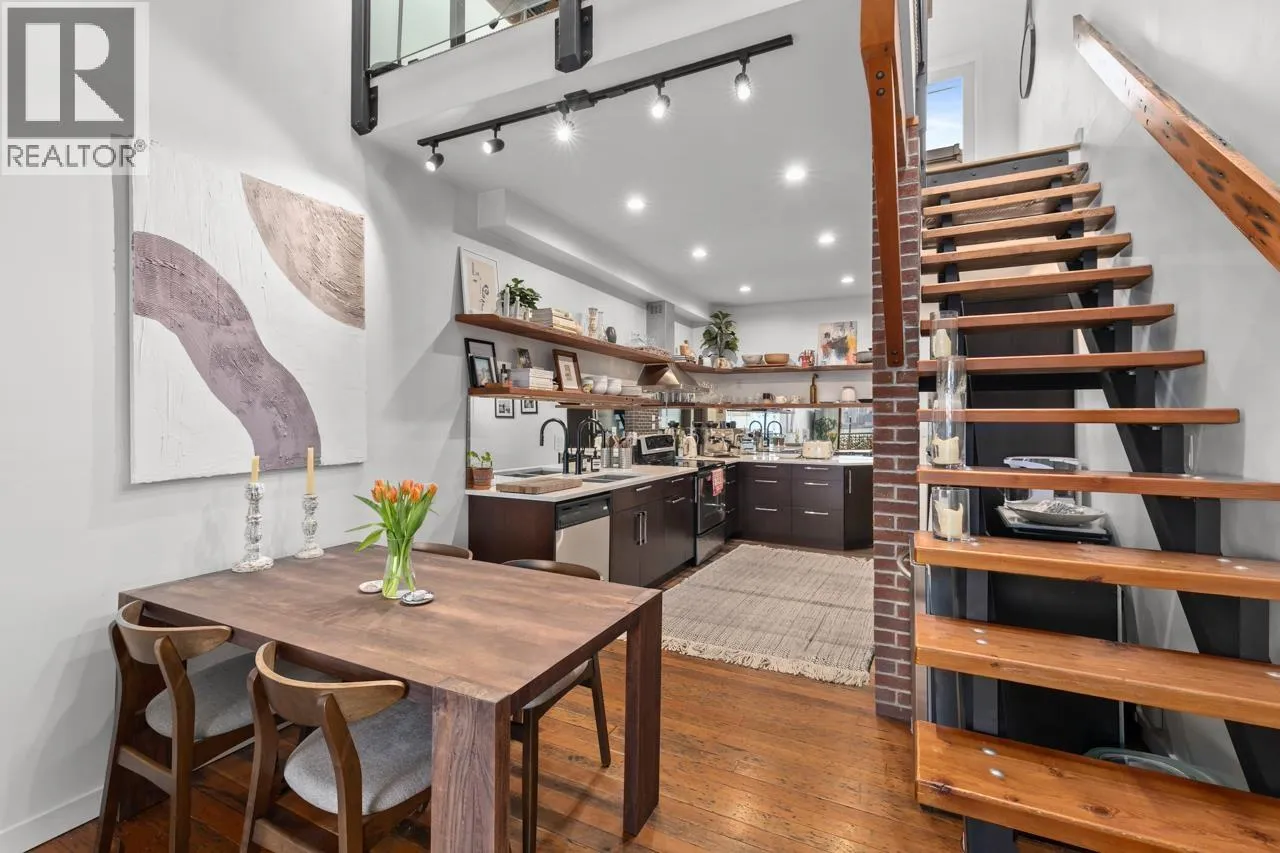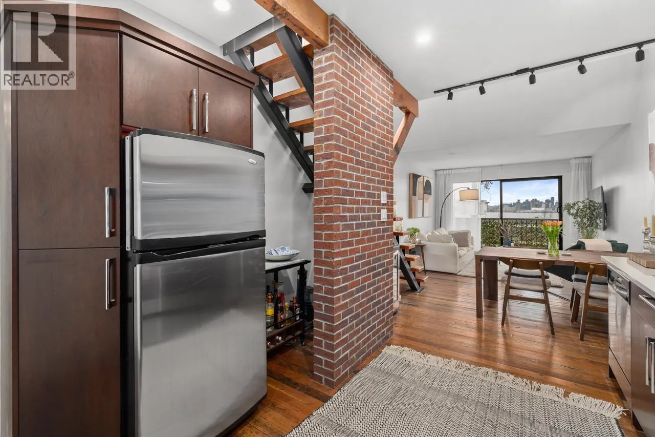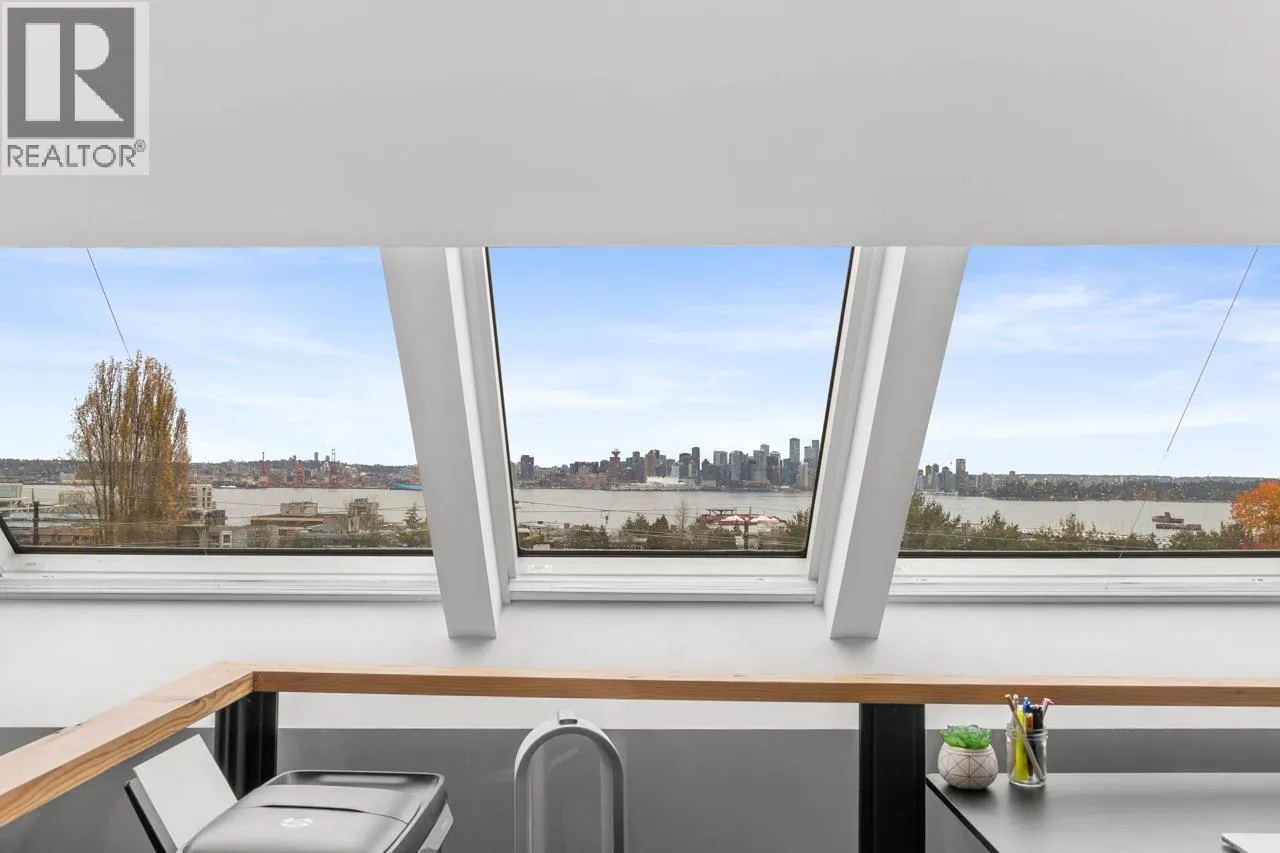 Character-filled 2-bedroom penthouse loft in the heart of Lower Lonsdale with unobstructed ocean and city views. This bright 2-level, 886 square ft home features vaulted ceilings, skylights, exposed brick, and wood beams for a true New York-loft feel. The main level includes reclaimed fir floors from the North Shore Shipyards, an updated kitchen with custom cabinetry and stainless steel appliances, open dining/living space, a spacious bedroom, a brand-new bathroom, and a south-facing balcony. Upstairs, the loft bedroom offers sweeping skyline views and opens onto a large private rooftop deck with west-facing mountain and sunset views-perfect for relaxing or entertaining. Steps to The Shipyards, SeaBus, shops, and restaurants. This home is truly one-of-a-kind. (id:27476)