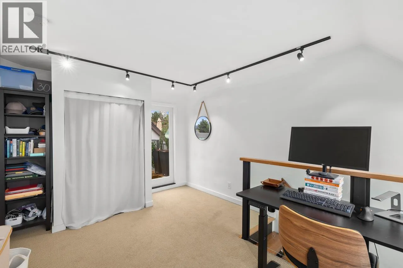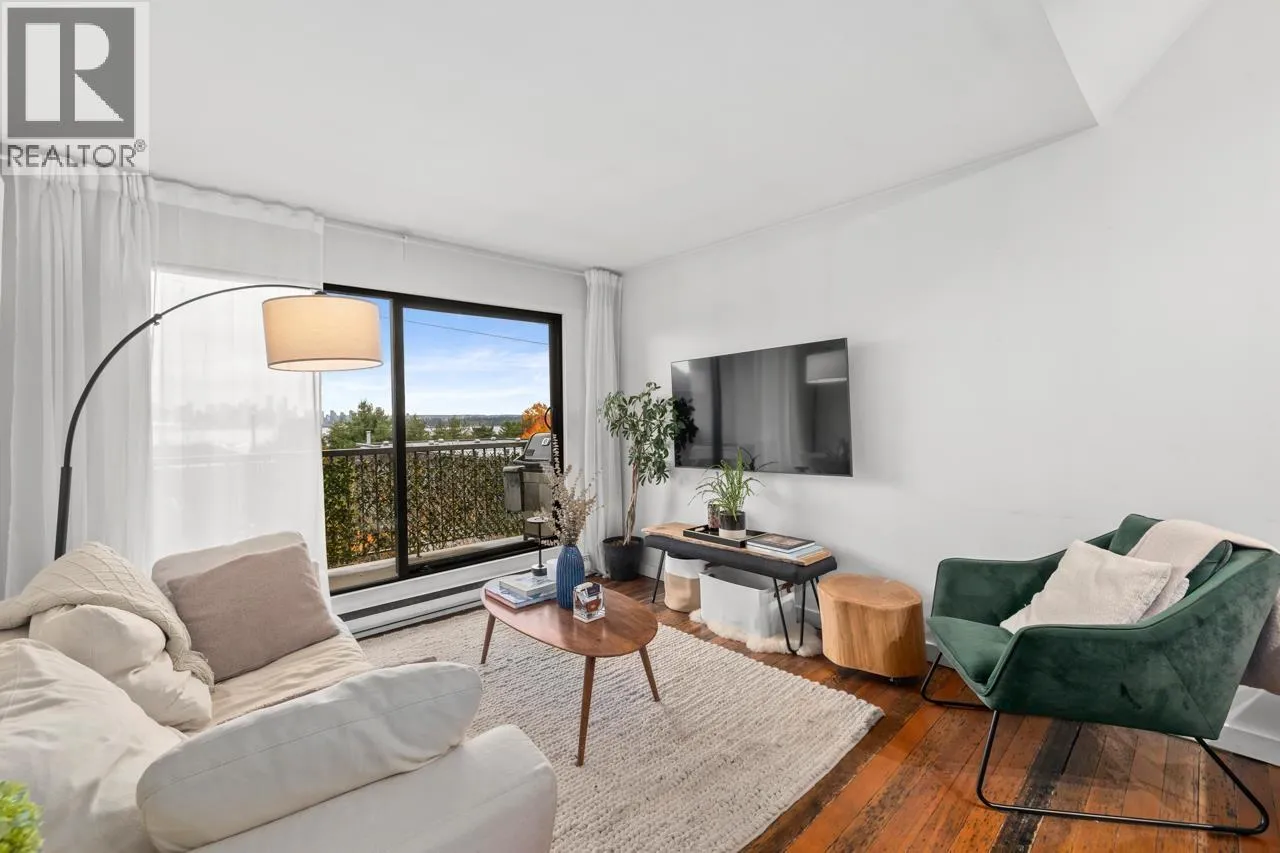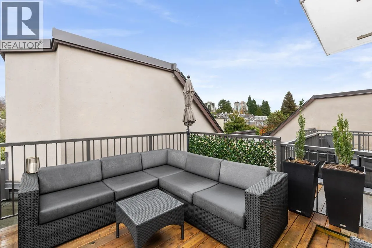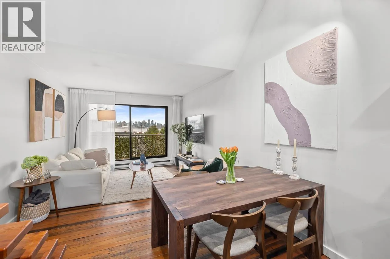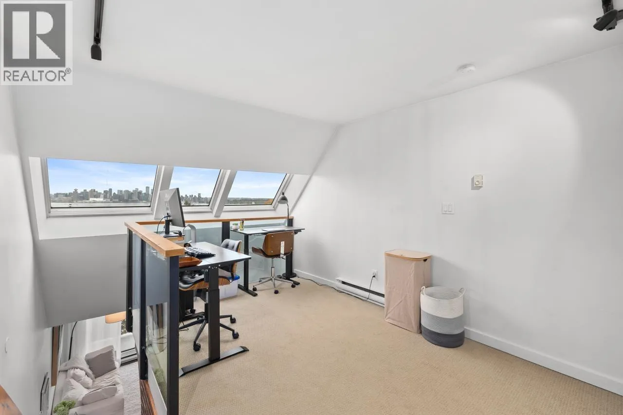 Character-filled 2-bedroom penthouse loft in the heart of Lower Lonsdale with unobstructed ocean and city views. This bright 2-level, 886 square ft home features vaulted ceilings, skylights, exposed brick, and wood beams for a true New York-loft feel. The main level includes reclaimed fir floors from the North Shore Shipyards, an updated kitchen with custom cabinetry and stainless steel appliances, open dining/living space, a spacious bedroom, a brand-new bathroom, and a south-facing balcony. Upstairs, the loft bedroom offers sweeping skyline views and opens onto a large private rooftop deck with west-facing mountain and sunset views-perfect for relaxing or entertaining. Steps to The Shipyards, SeaBus, shops, and restaurants. This home is truly one-of-a-kind. (id:27476)