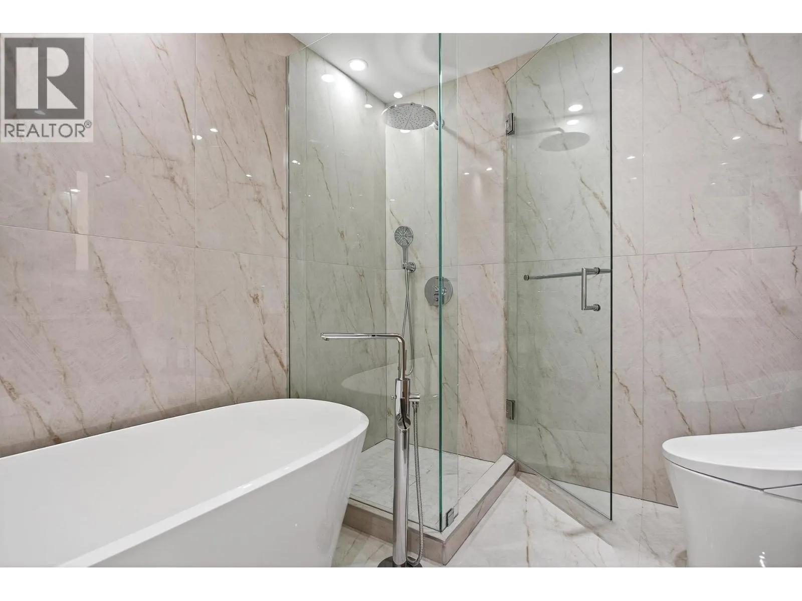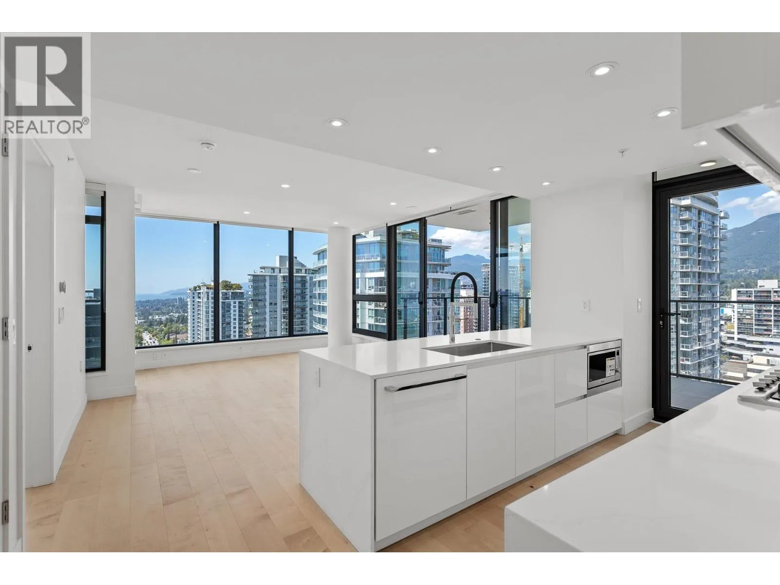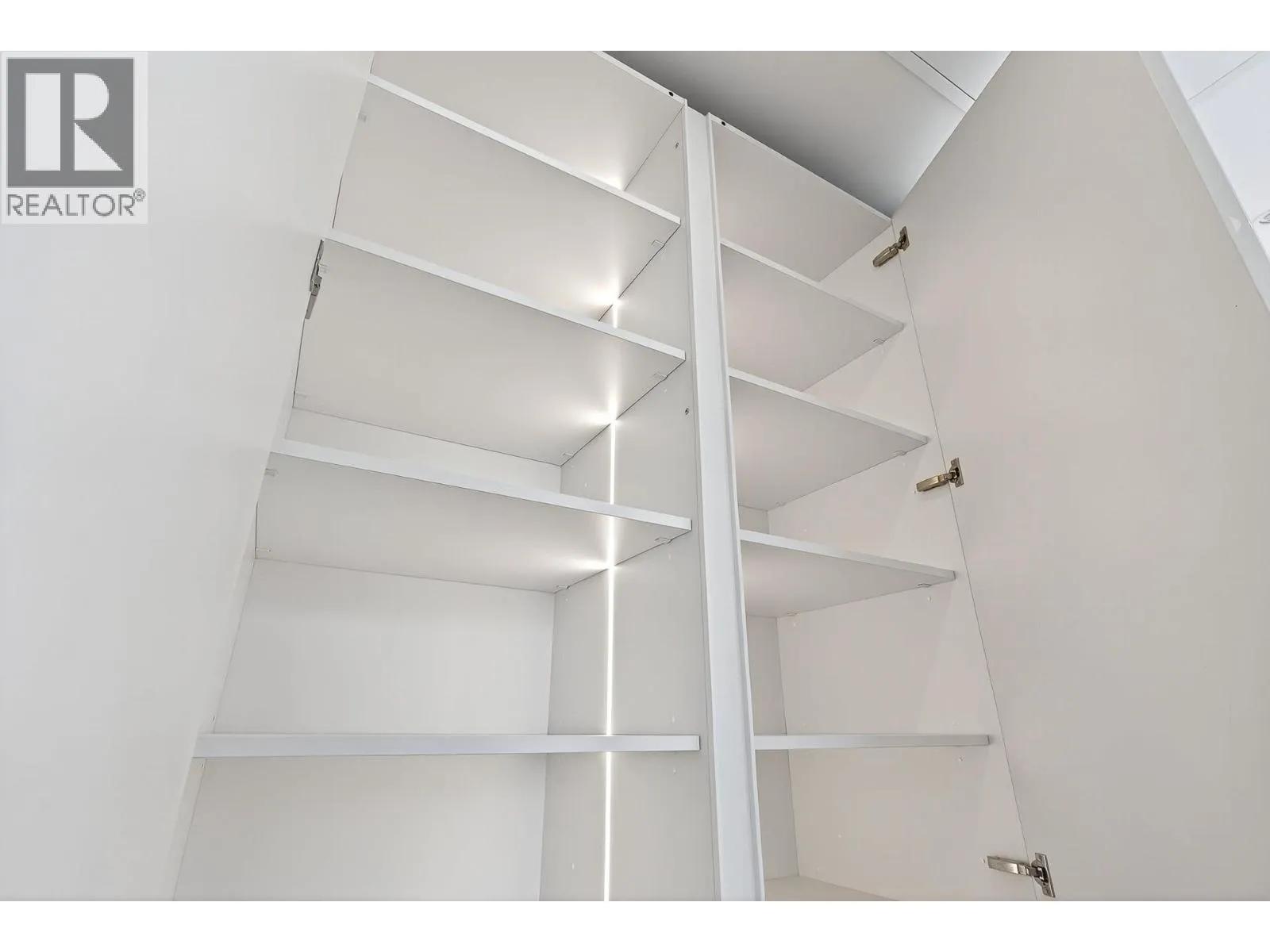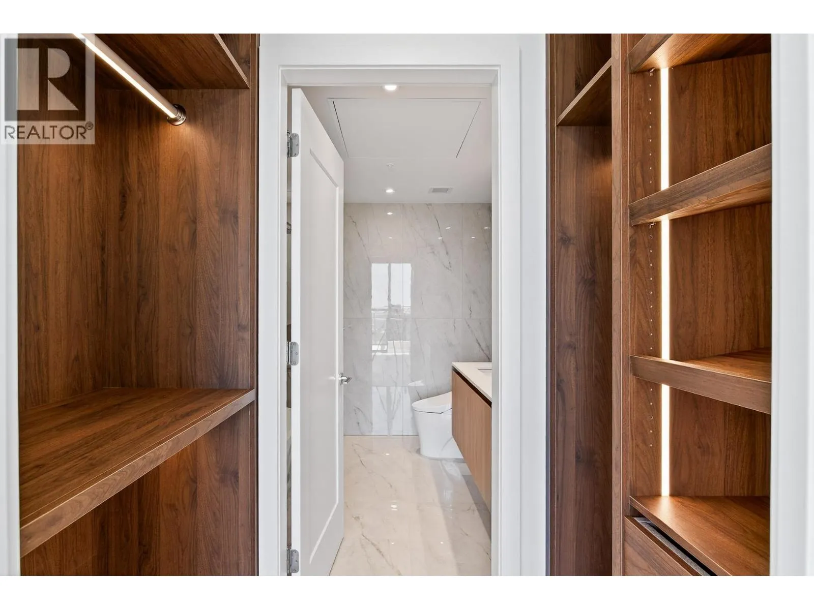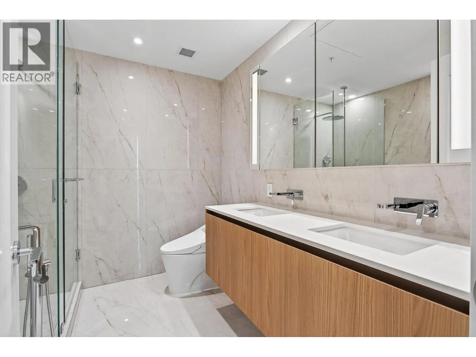 1506 captures the North Shore views: the city skyline, ocean, Lions Gate Bridge, mountains & serene pool view below. This modern 2-bed, 2-bath corner residence offers over 1,000 sqft of refined living with south, west, and north exposures, showcasing breathtaking scenery from every angle plus two spacious balconies. This unit features floor-to-ceiling windows, a chef-inspired kitchen with premium integrated appliances, a gas cooktop, an oversized waterfall quartz island, LED lit cabinets. Luxury upgrades include motorized blinds, high-end custom closet millwork in the ensuite, a built-in wine fridge, pot lights in the bedrooms, and an elevated palette of premium finishes throughout. Parking and bigger storage. Pics, Floorplan, Pics & video are for 1406! Measurement approximate and to be v (id:27476)