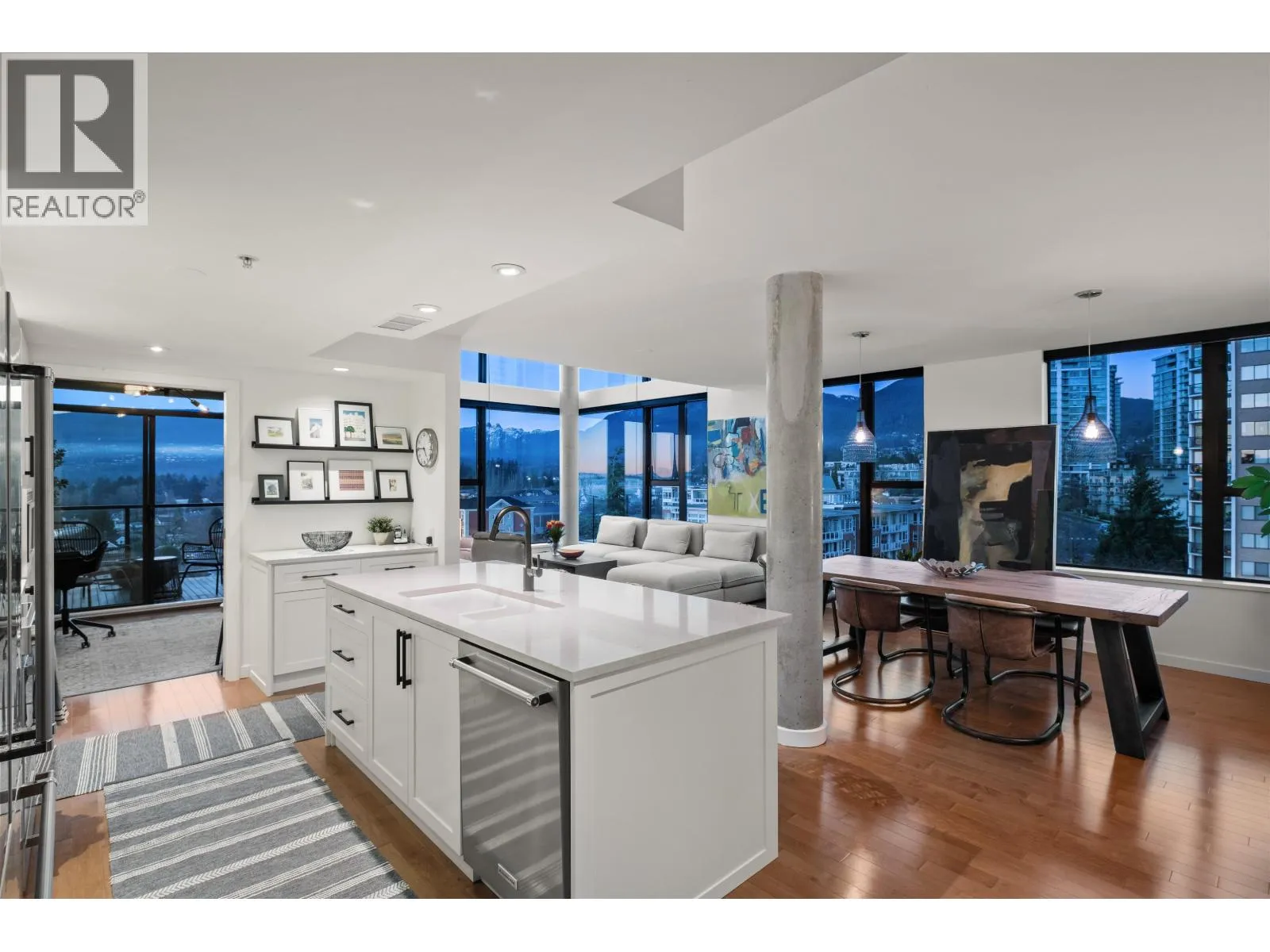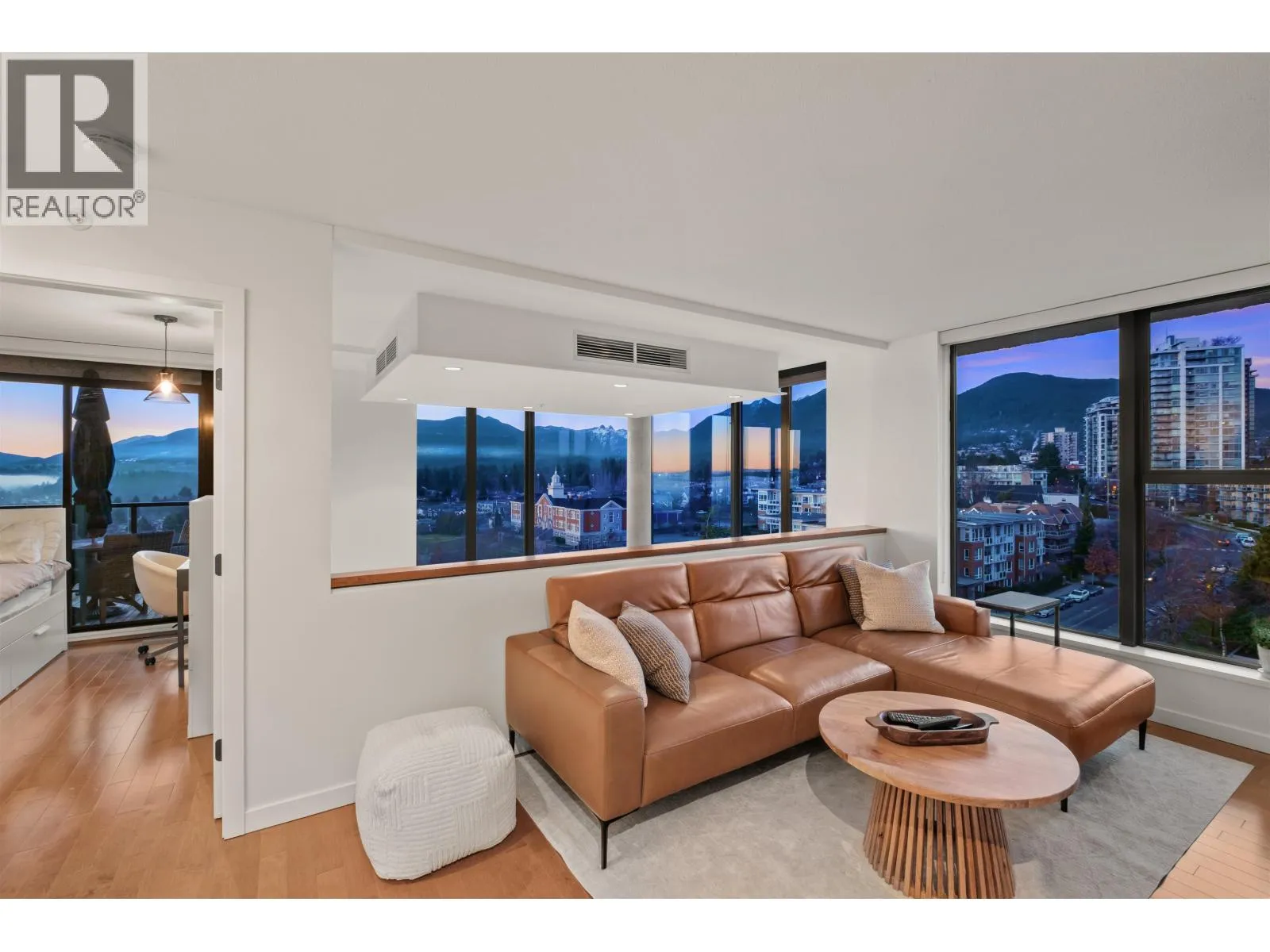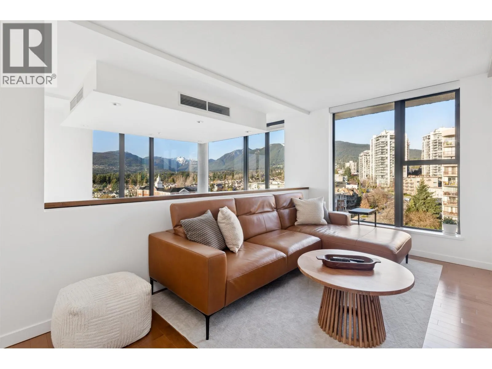 A rare 2,200 sf corner penthouse with stunning panoramic views in every direction. This two-level residence features dramatic double-height windows, renovated interiors & sweeping outlooks of the North Shore Mountains, Victoria Park, the city skyline & incredible sunsets. The main level offers a modern chef´s kitchen with premium appliances & an oversized island, spacious living & dining areas, 200 sf of outdoor terraces & an additional primary bedroom. The upper level features a second primary suite with a spa-inspired ensuite & California closets, plus an additional bedroom, full bath & a sleek media lounge. With expansive corner exposure across two floors, natural light & vistas are unmatched. Perfectly located in the heart of Lower Lonsdale-walk to the SeaBus or Whole Foods in minutes. (id:27476)