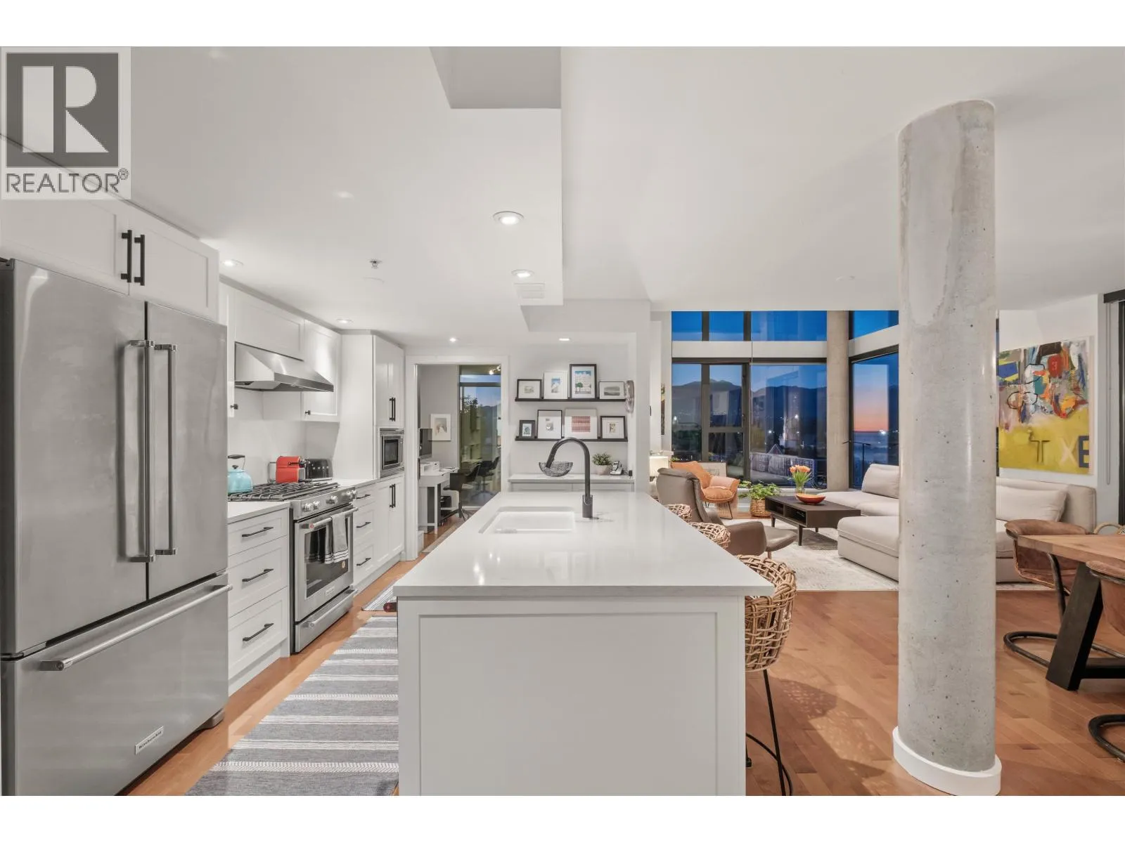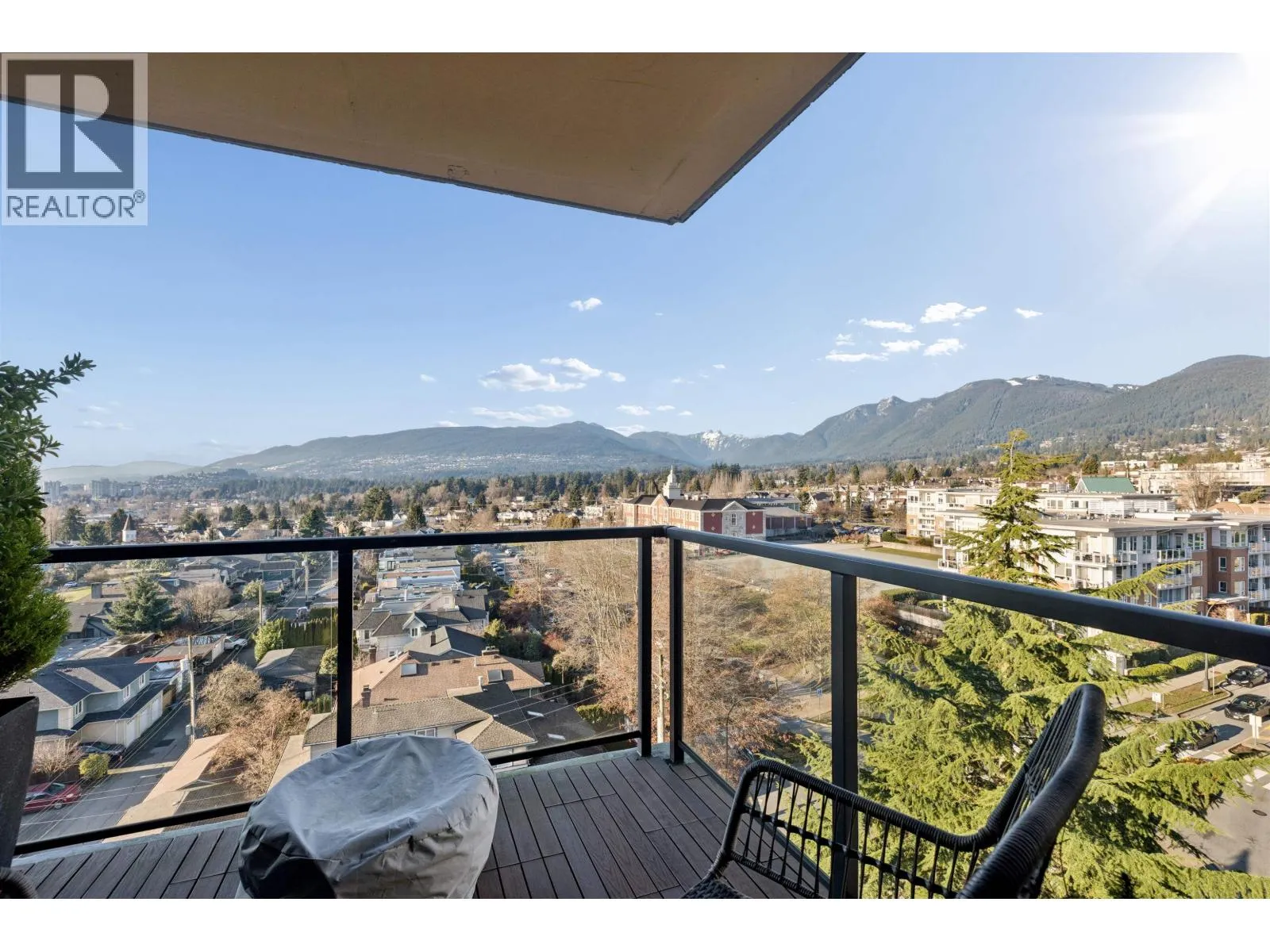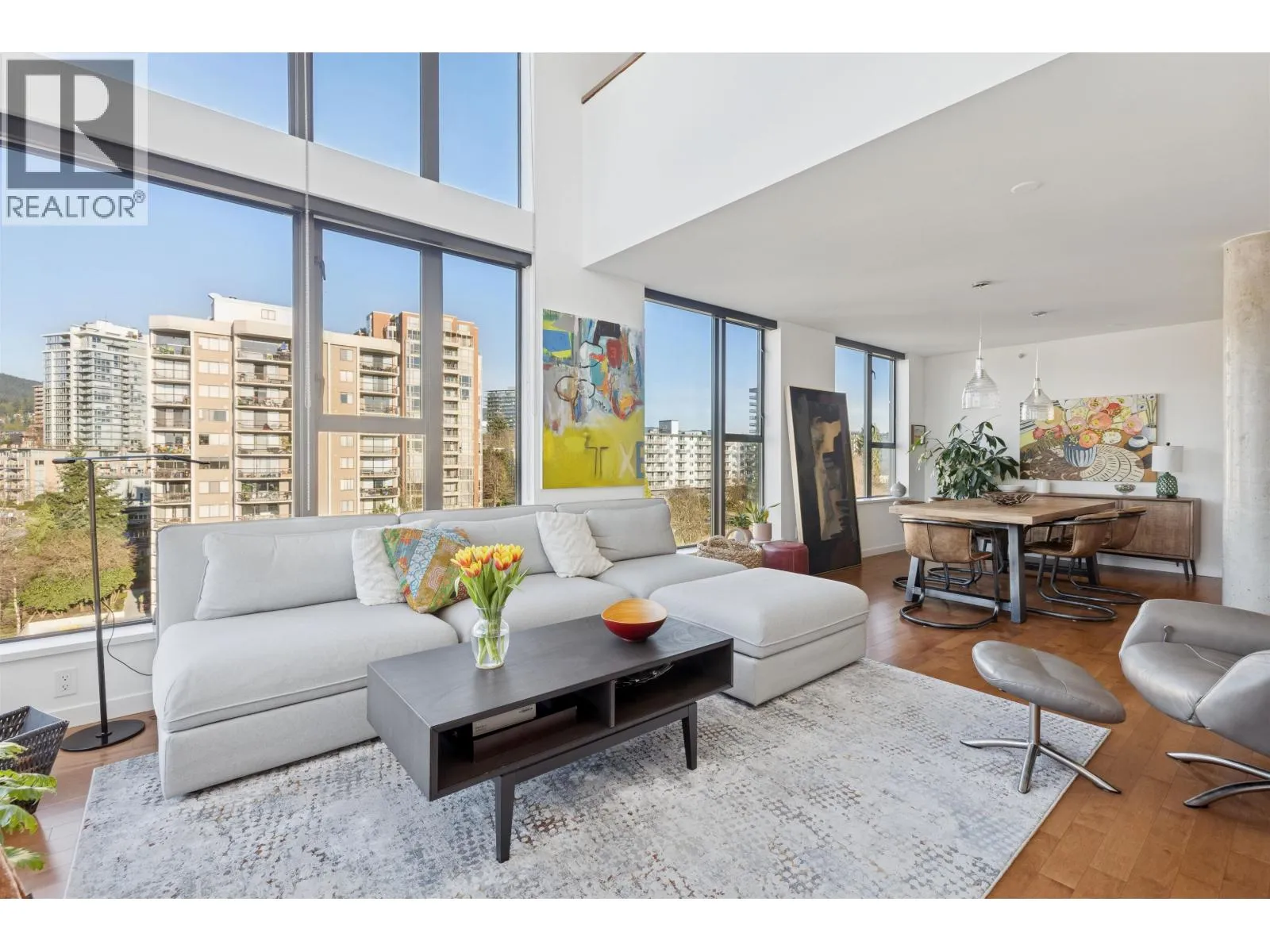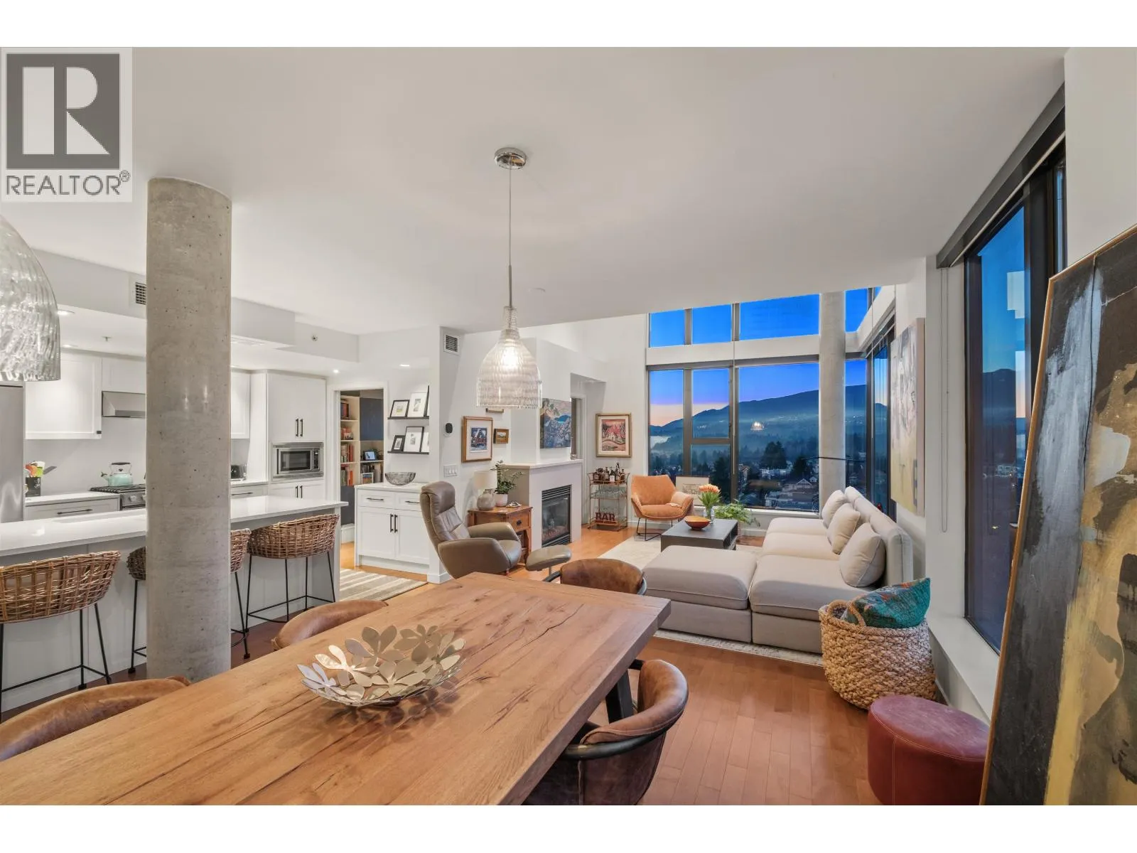 A rare 2,200 sf corner penthouse with stunning panoramic views in every direction. This two-level residence features dramatic double-height windows, renovated interiors & sweeping outlooks of the North Shore Mountains, Victoria Park, the city skyline & incredible sunsets. The main level offers a modern chef´s kitchen with premium appliances & an oversized island, spacious living & dining areas, 200 sf of outdoor terraces & an additional primary bedroom. The upper level features a second primary suite with a spa-inspired ensuite & California closets, plus an additional bedroom, full bath & a sleek media lounge. With expansive corner exposure across two floors, natural light & vistas are unmatched. Perfectly located in the heart of Lower Lonsdale-walk to the SeaBus or Whole Foods in minutes. (id:27476)