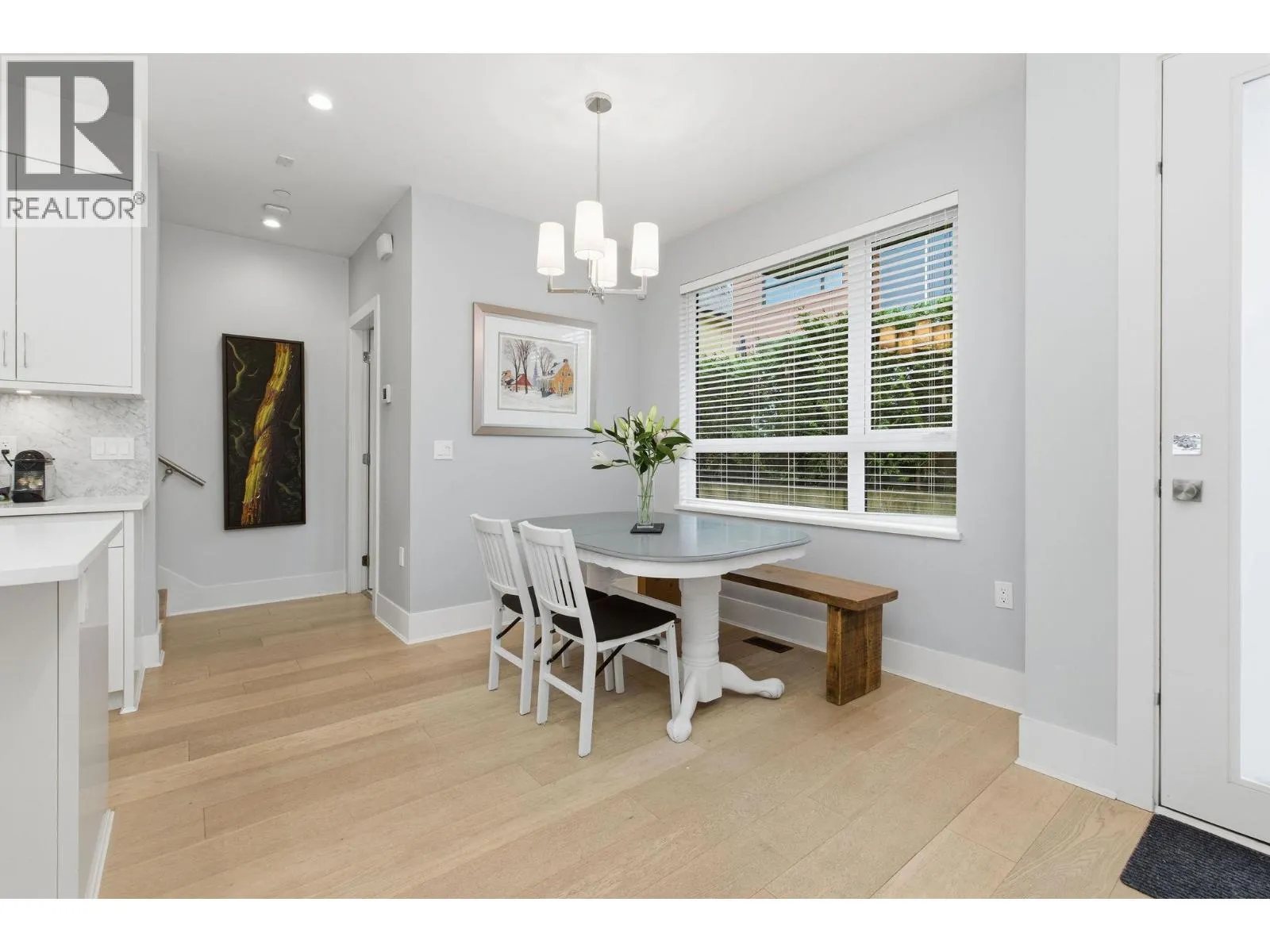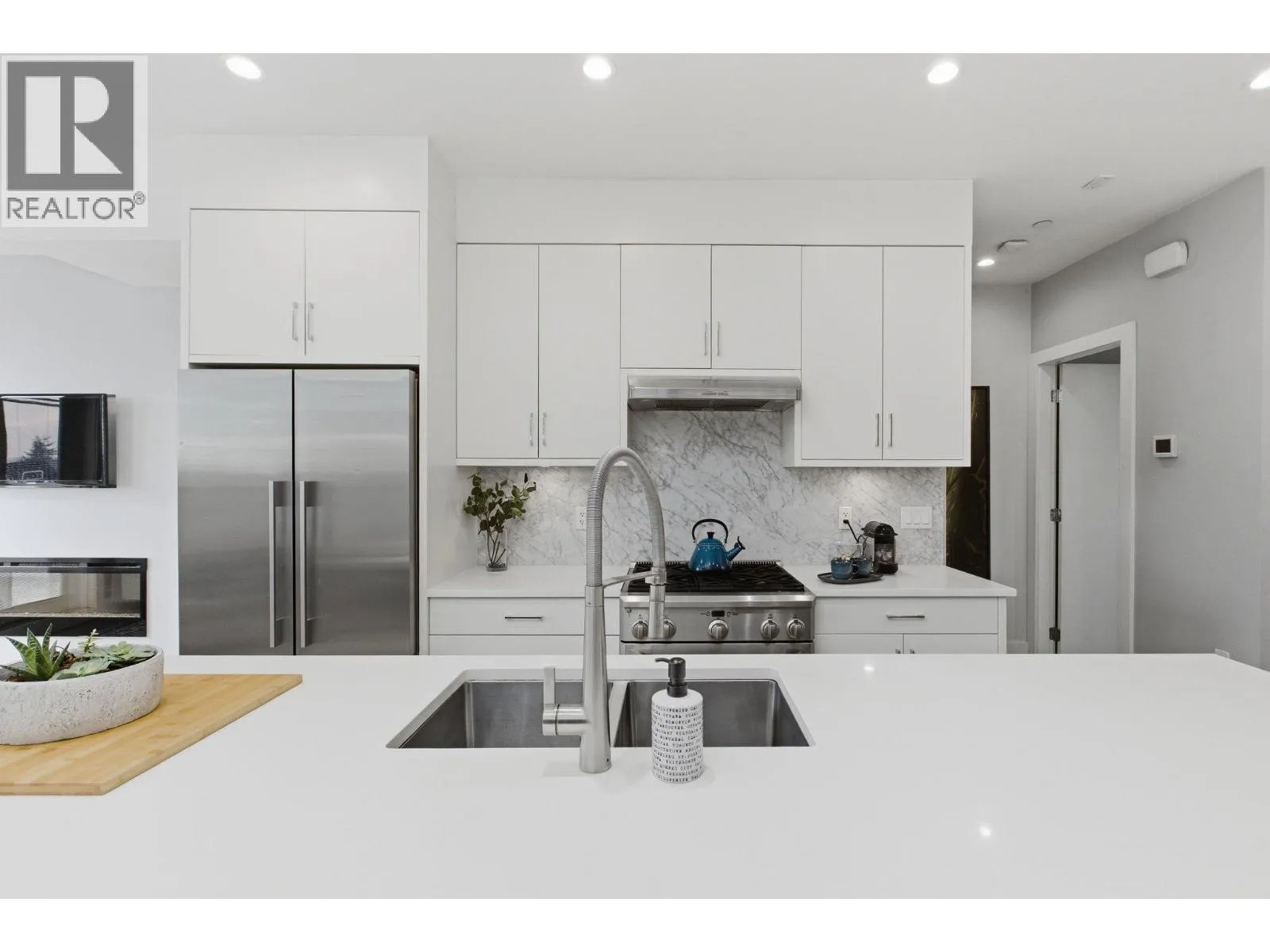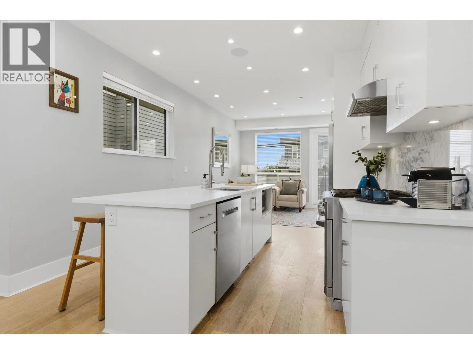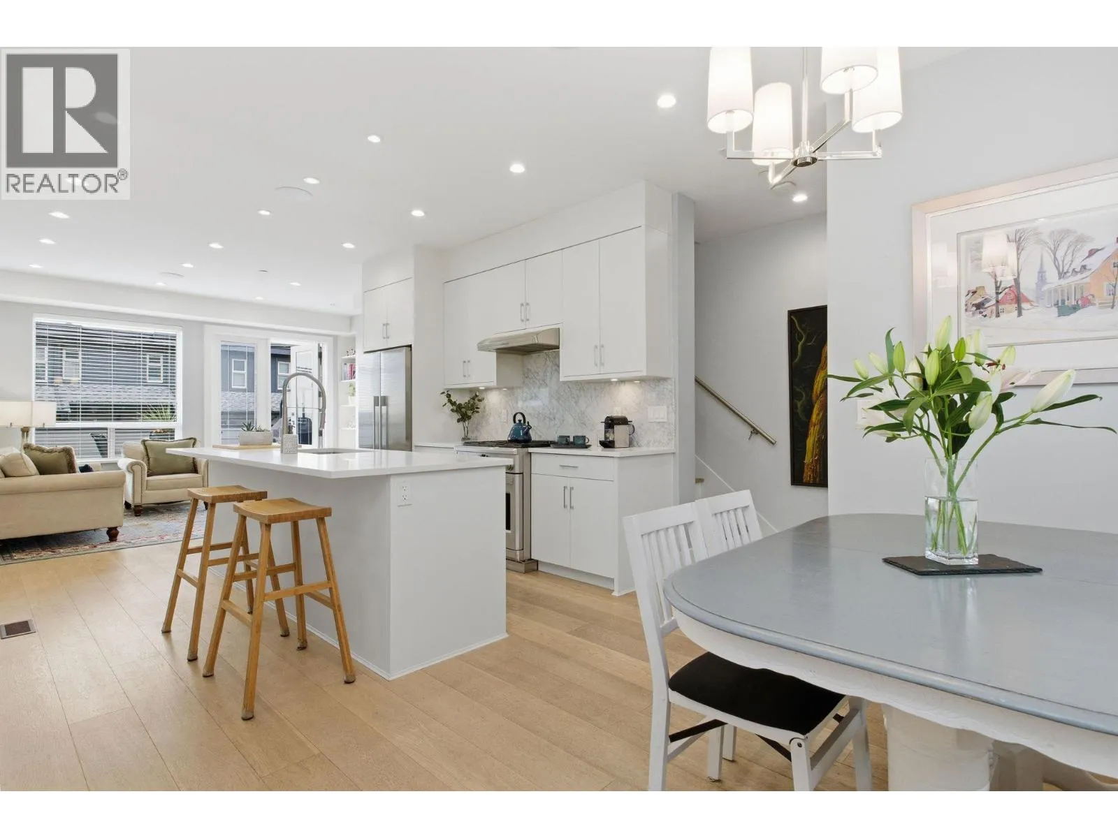Welcome to a refined boutique residence that balances thoughtful design with everyday livability. Just moments from vibrant Lower Lonsdale, this distinctive 4-level half-duplex offers an exceptional blend of urban convenience and modern comfort. The main level features a bright, open layout with hardwood floors, crisp white cabinetry, and an oversized island that anchors both daily life and entertaining. A generous patio extends the living space outdoors, while spa-inspired bathrooms add a calm, polished feel throughout. Upstairs are three well-proportioned bedrooms suited for family, guests, or a home office. The top floor offers a cozy loft with wet bar and access to a southeast-facing rooftop deck with city and water views. Additional highlights include glass railings, heat pump air conditioning, and a self-contained nanny or guest suite below. Built by Cobblestone Homes & so well maintained, the home also includes a single-car garage - a rare asset in this highly walkable location near shops, dining & rec! (id:27476)