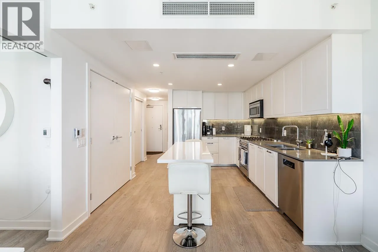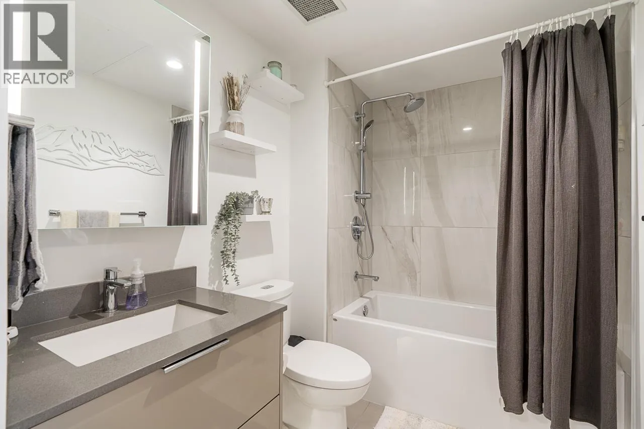 PANORAMIC VIEWS | LUXURY LIVING - Welcome to Hunter at Lynn Creek! This stunning 1 Bedroom home offers breathtaking south/south west facing water, mountain and city views, a spacious 112 sq. ft. covered balcony, and air conditioning for year-round comfort. The sleek open-concept kitchen boasts quartz countertops, modern cabinetry, stainless steel appliances, and a gas stove-perfect for home chefs. Wide plank laminate flooring adds a touch of elegance. Enjoy resort-style amenities; a gym, sauna, steam room, party lounge, BBQ area, kid's p[lay zone, and more! Steps to Seylenn Park, rec centre, shops, pharmacy, nail salon, and transit. 2 pets welcome! 1 Parking & Storage. (id:27476)