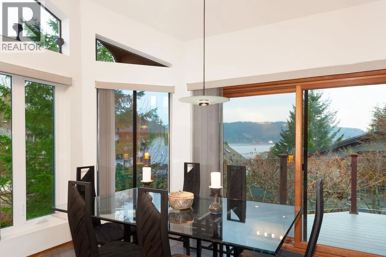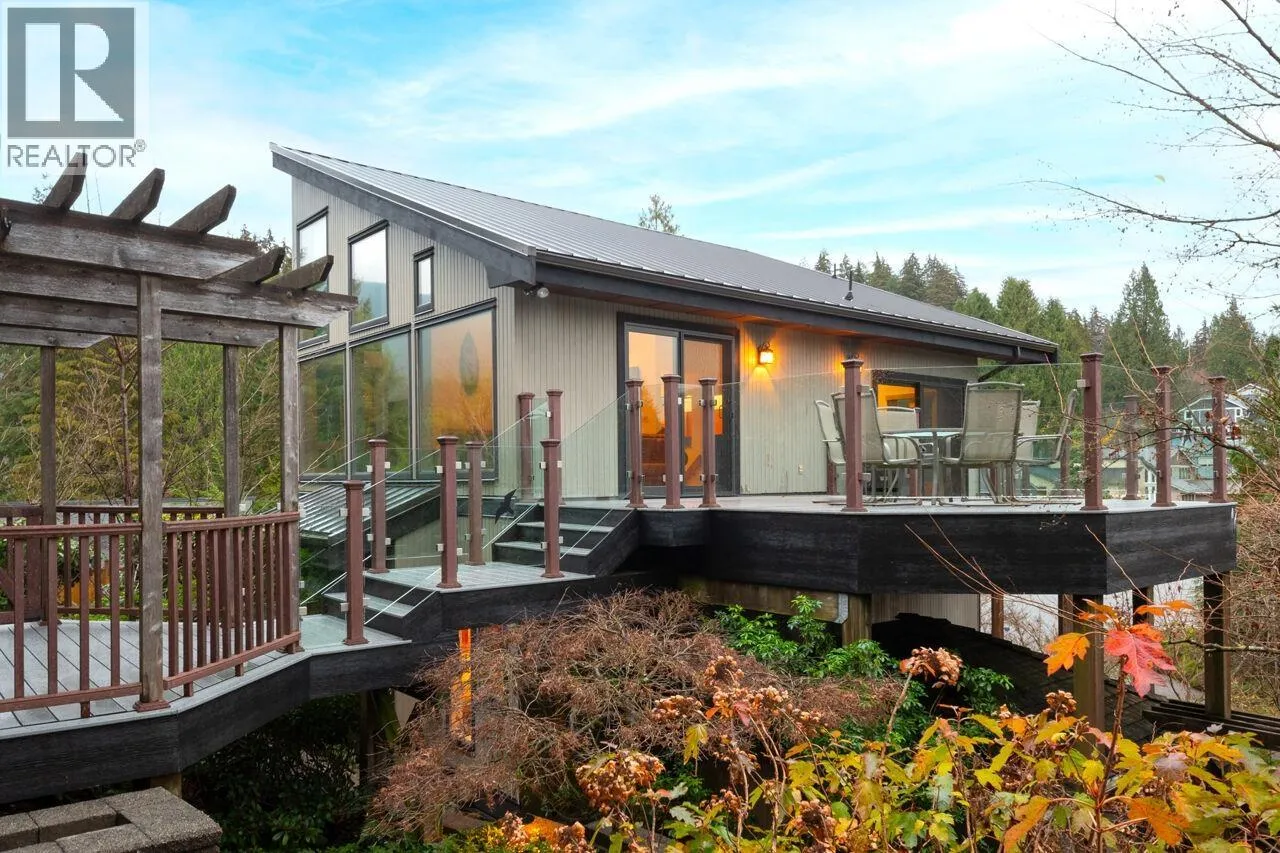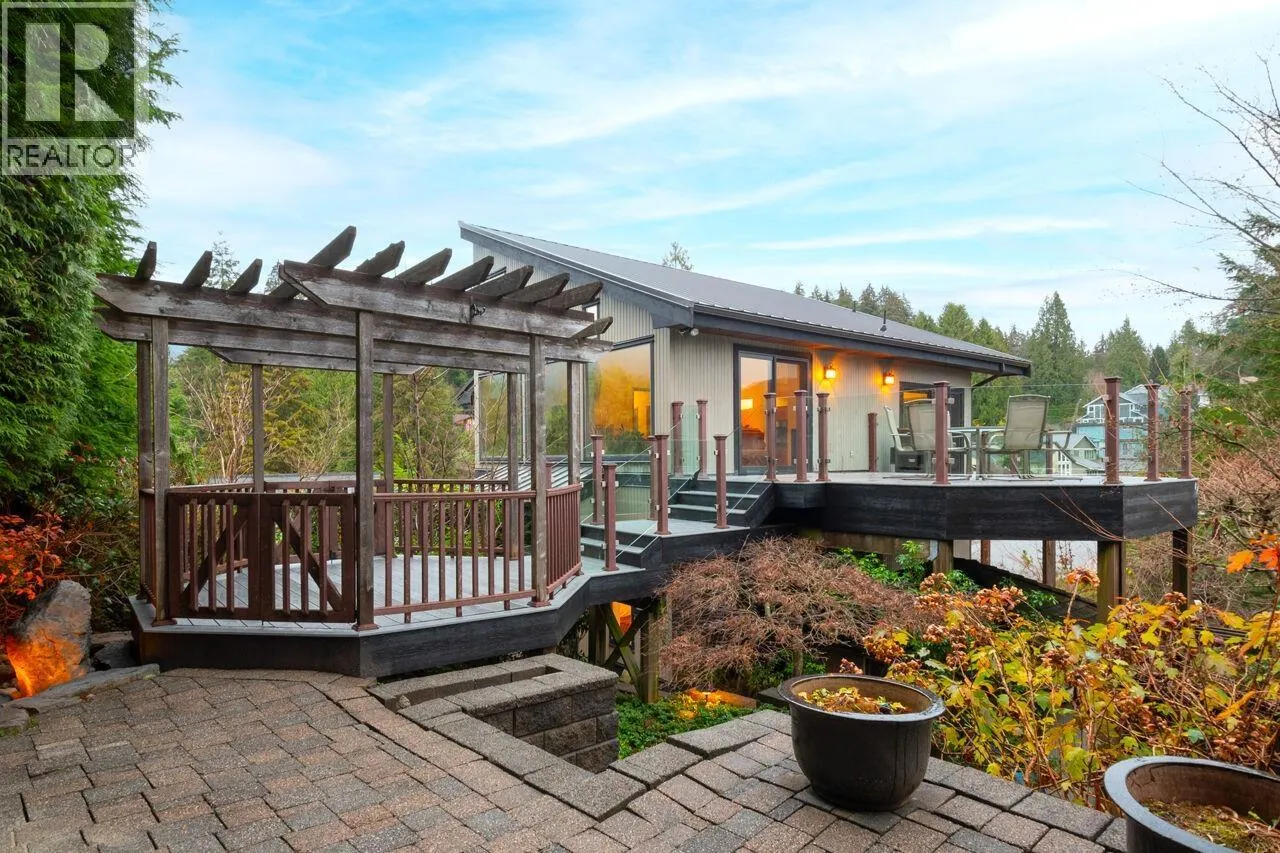 Don´t miss this exceptional West Coast contemporary, perfectly positioned on one of Deep Cove´s most coveted streets. Thoughtfully designed with a reverse living plan to capture sweeping ocean views, this stunning residence offers 4 bedrooms and 4 bathrooms across three beautifully appointed levels. The home features a dedicated office, inviting family room, and abundant storage throughout. Soaring vaulted ceilings, expansive picture windows, and skylights bathe the interiors in natural light, showcasing the surrounding forest and mountain vistas. With over 1,000 sq. ft. of sun-drenched decks and patios, this is truly an entertainer´s dream. A rare, large flat driveway accommodates up to six vehicles in addition to a two-car garage. Backing onto a private greenbelt and just a short stroll to parks and beaches, this home offers the perfect blend of tranquility and coastal convenience. (id:27476)