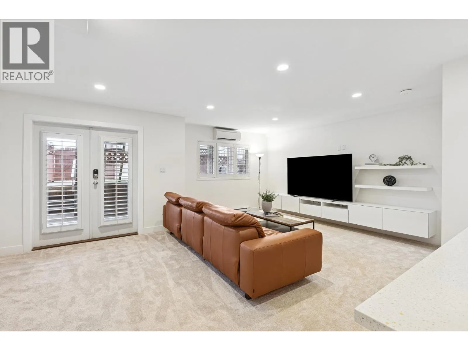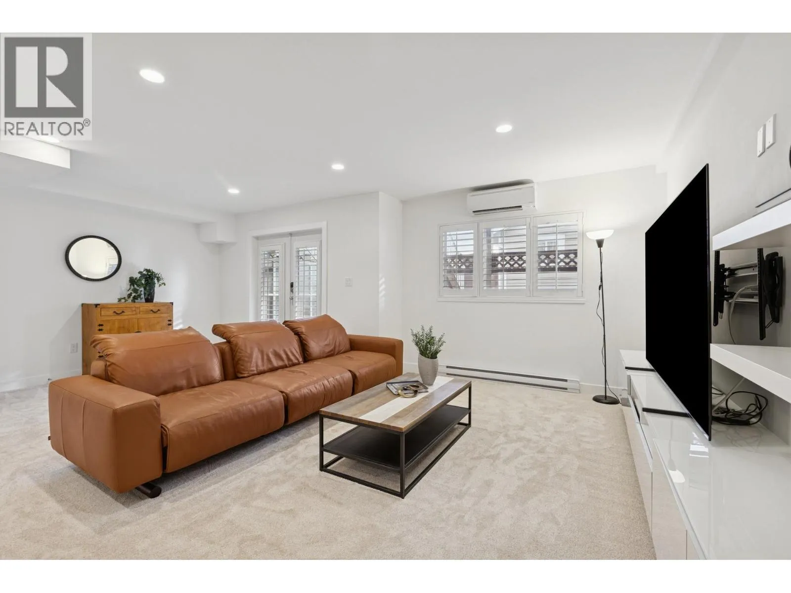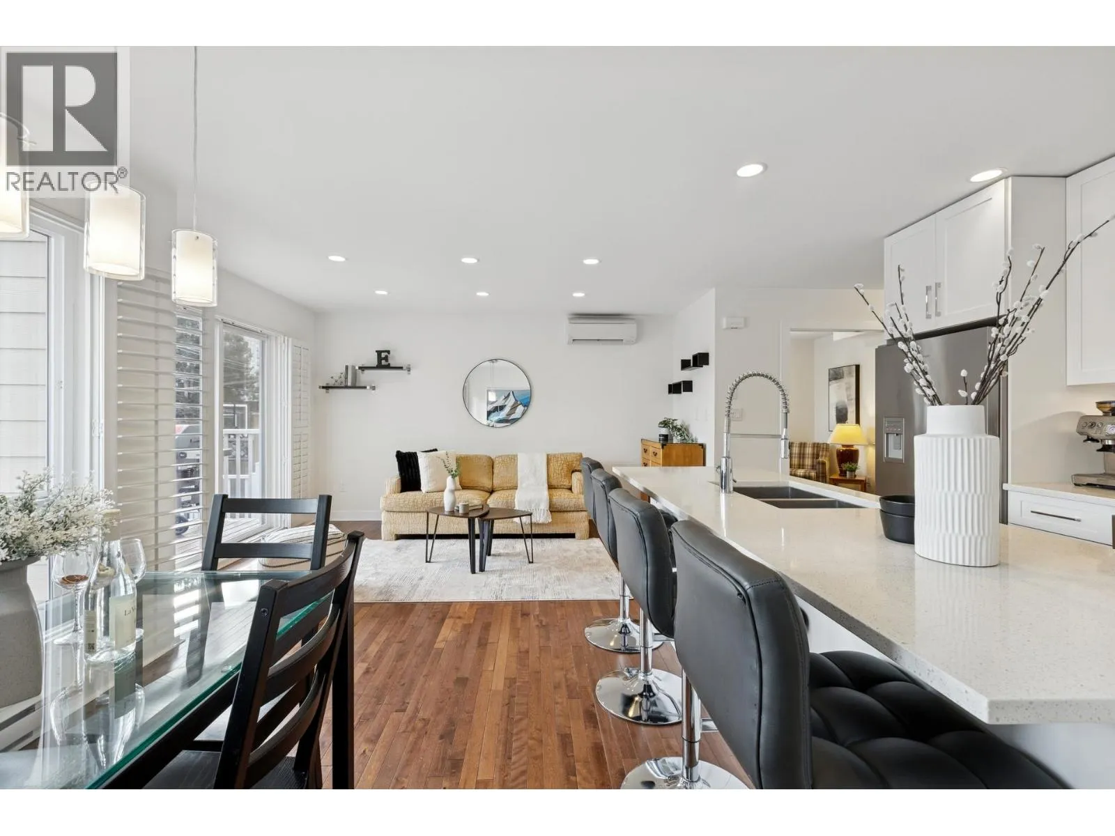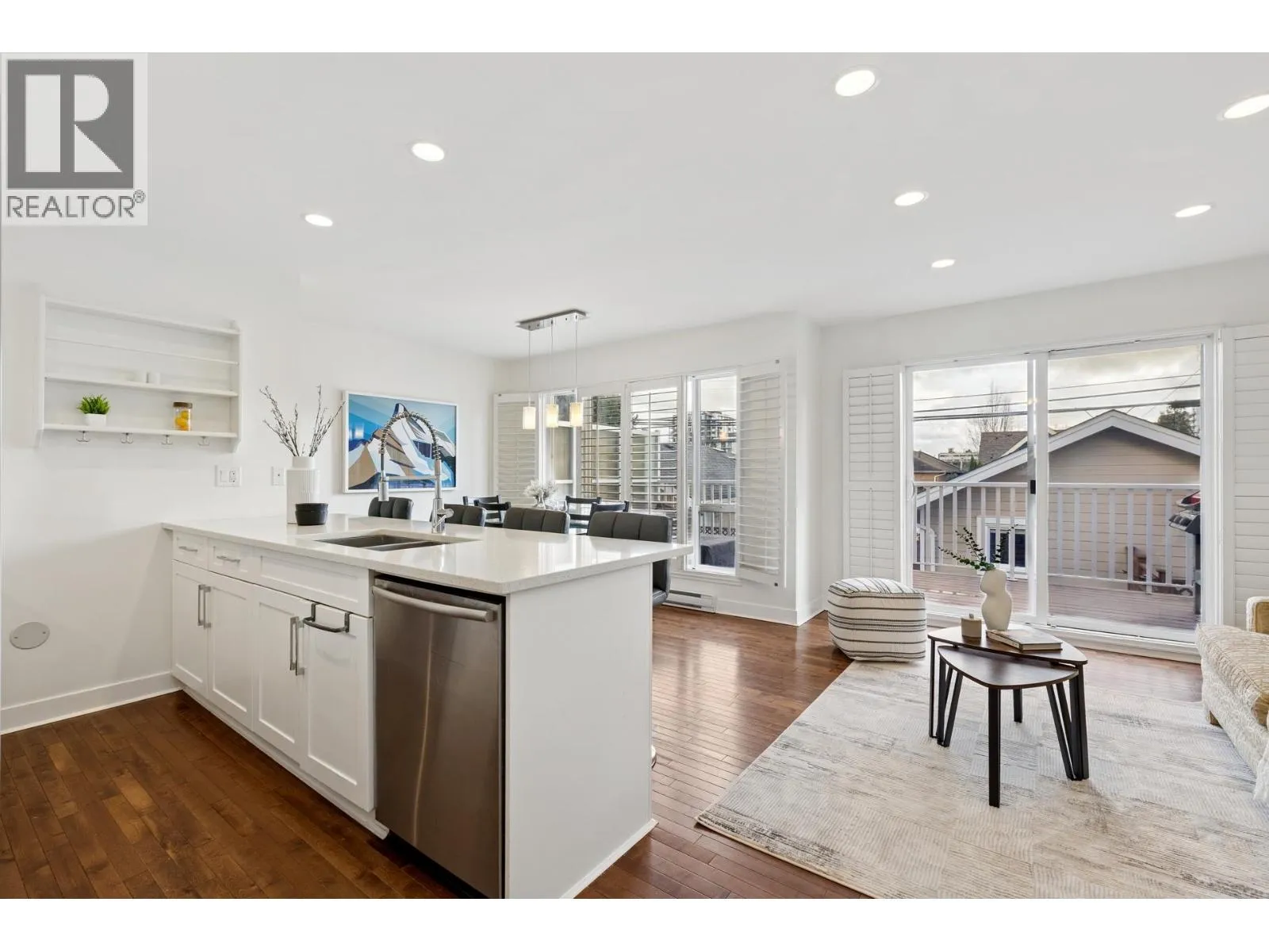 South-facing fourplex offering nearly 2,000 sq/ft of turn-key living in Central Lonsdale. This 3-bed + den home offers a detached-scale layout across 3 levels. The main floor features a designer kitchen with shaker cabinetry, quartz counters, gas cooktop, and bar seating. Open living and dining areas lead to an expansive south-facing deck and private fenced yard with low-maintenance artificial turf. Unique to this floor plan is a main-floor office with French doors and a full bathroom. Upstairs features a spacious primary suite with a walk-in closet and private SW balcony, plus a 2nd bedroom and spa-style bath with double vanity. The lower level offers a separate entrance, bedroom, and bath - perfect as a nanny suite or future rental (kitchenette ready). Recent upgrades include a high-efficiency heat pump (A/C on all floors), fresh paint, and new carpets. 2 parking (1 garage). Just off the Green Necklace trail, steps to Lonsdale shops and the new Harry Jerome Rec Centre. Quick Hwy 1 access. (id:27476)