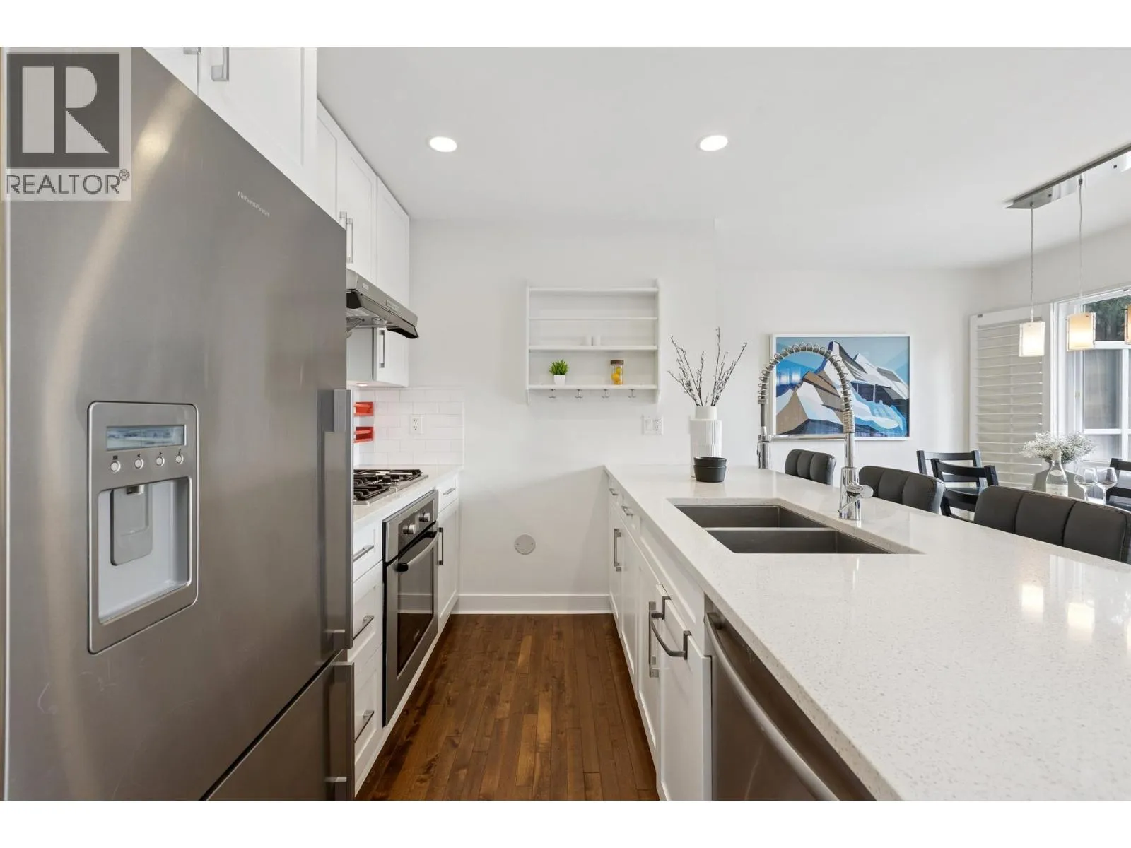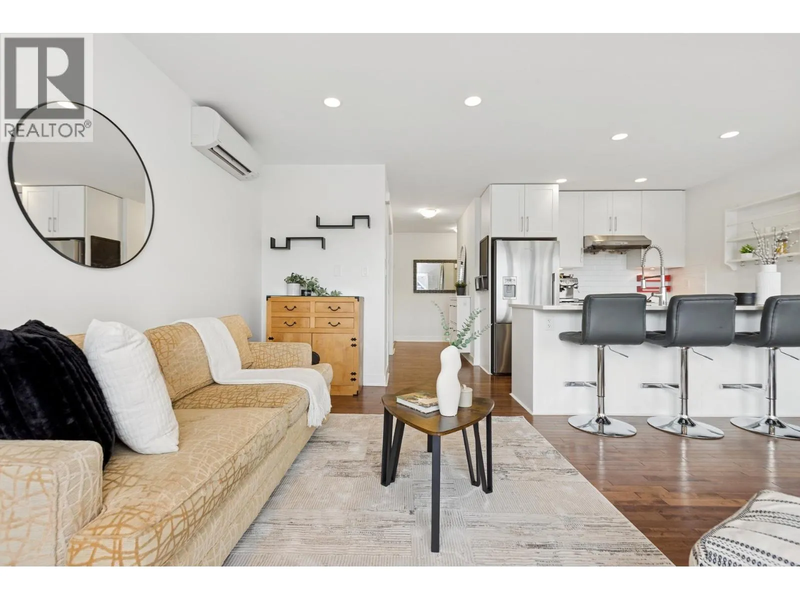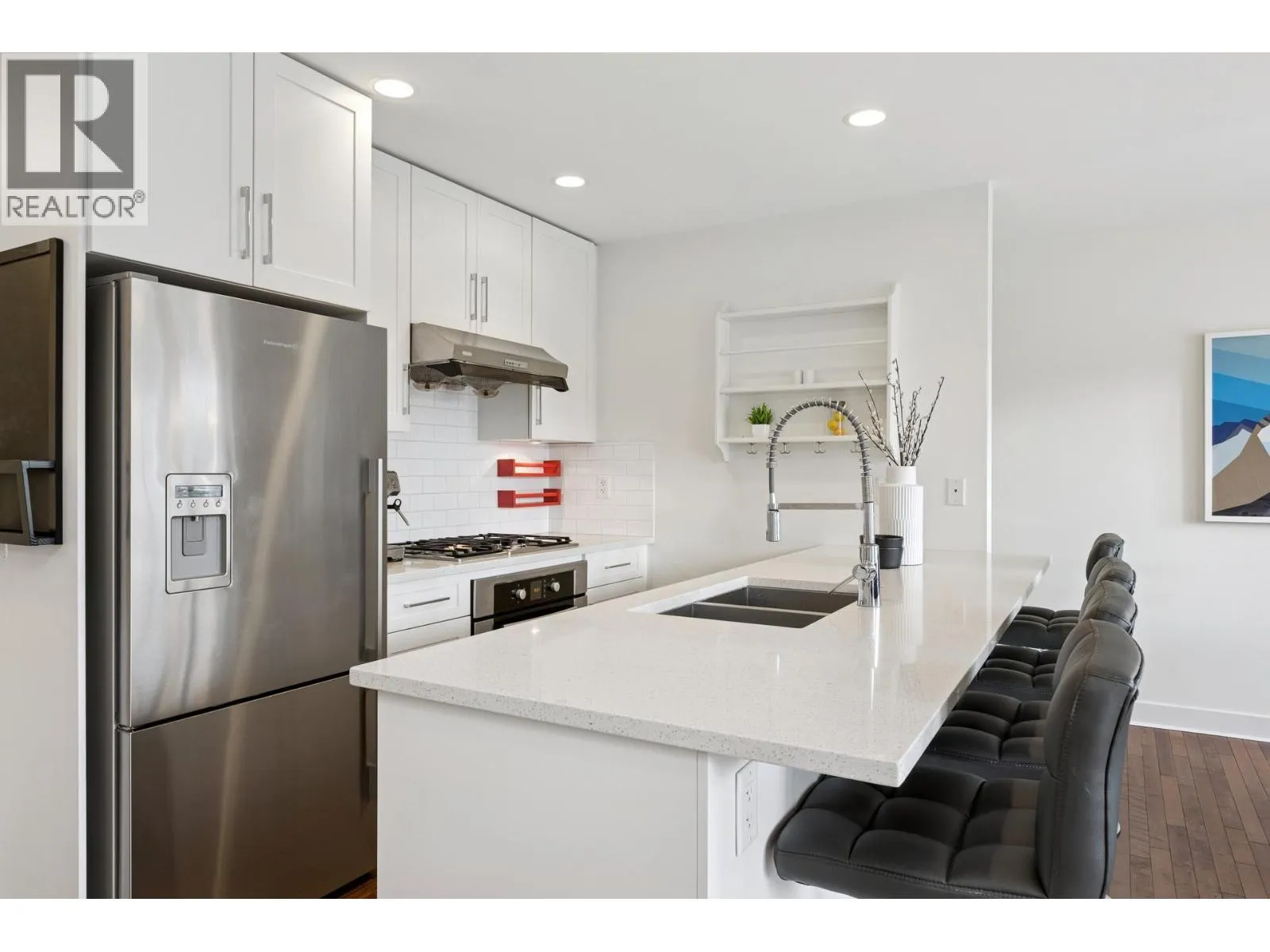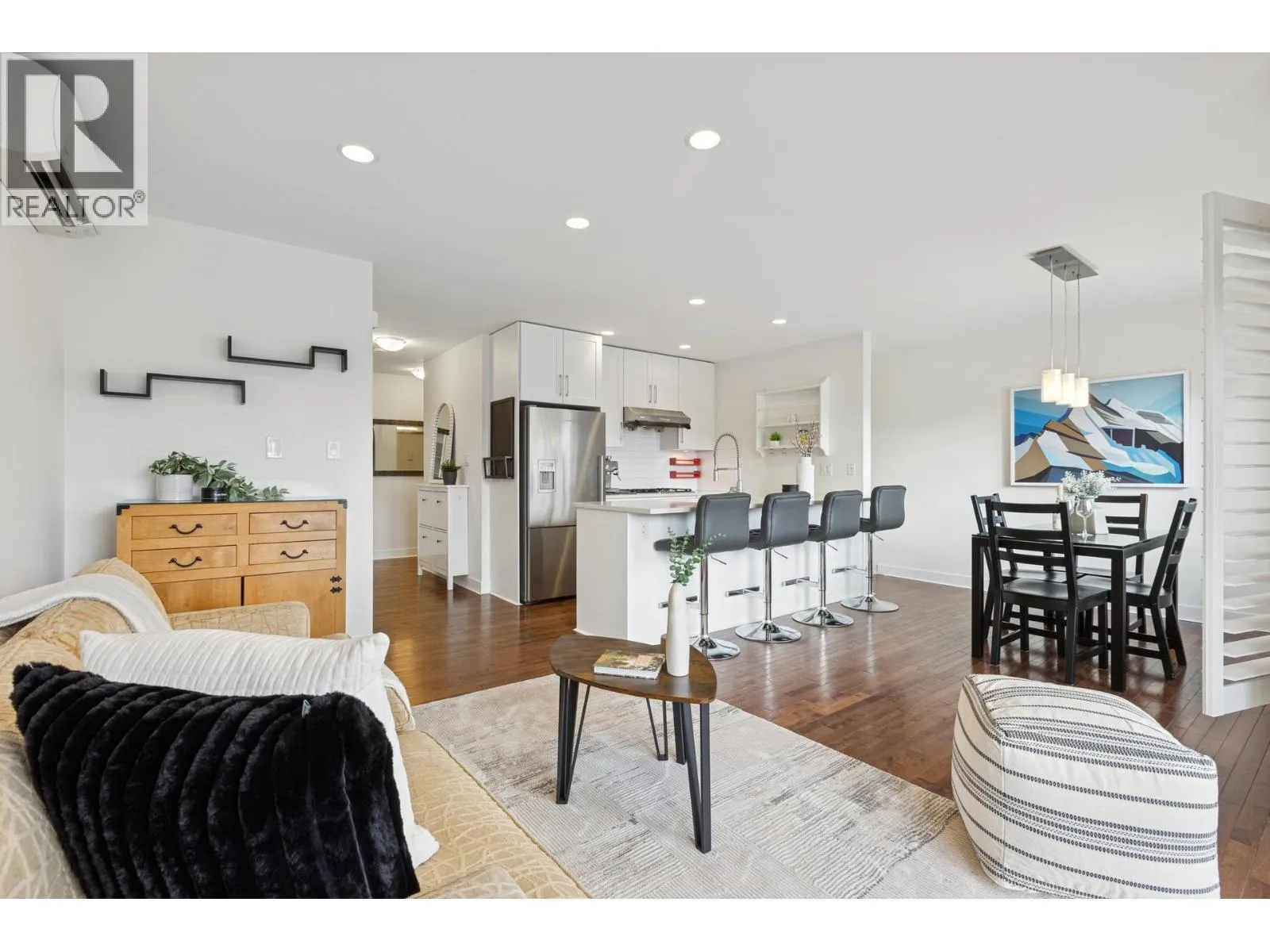 South-facing fourplex offering nearly 2,000 sq/ft of turn-key living in Central Lonsdale. This 3-bed + den home offers a detached-scale layout across 3 levels. The main floor features a designer kitchen with shaker cabinetry, quartz counters, gas cooktop, and bar seating. Open living and dining areas lead to an expansive south-facing deck and private fenced yard with low-maintenance artificial turf. Unique to this floor plan is a main-floor office with French doors and a full bathroom. Upstairs features a spacious primary suite with a walk-in closet and private SW balcony, plus a 2nd bedroom and spa-style bath with double vanity. The lower level offers a separate entrance, bedroom, and bath - perfect as a nanny suite or future rental (kitchenette ready). Recent upgrades include a high-efficiency heat pump (A/C on all floors), fresh paint, and new carpets. 2 parking (1 garage). Just off the Green Necklace trail, steps to Lonsdale shops and the new Harry Jerome Rec Centre. Quick Hwy 1 access. (id:27476)