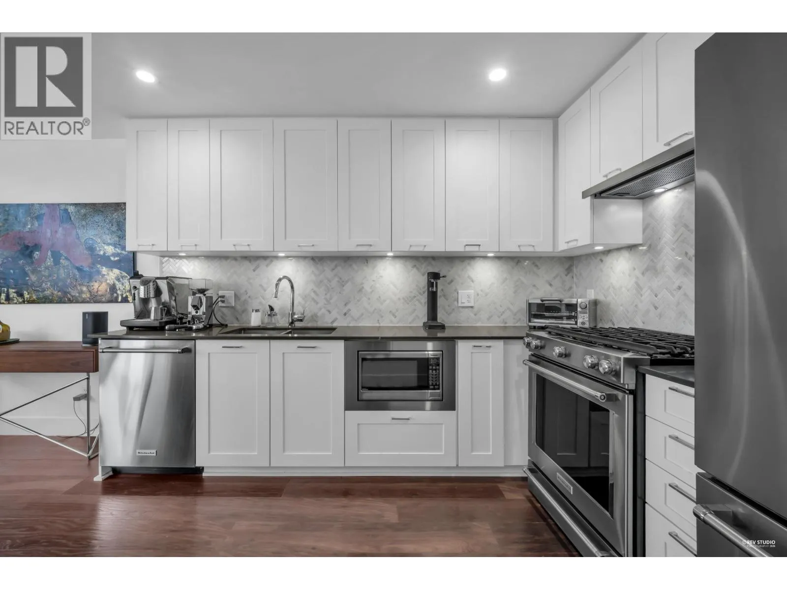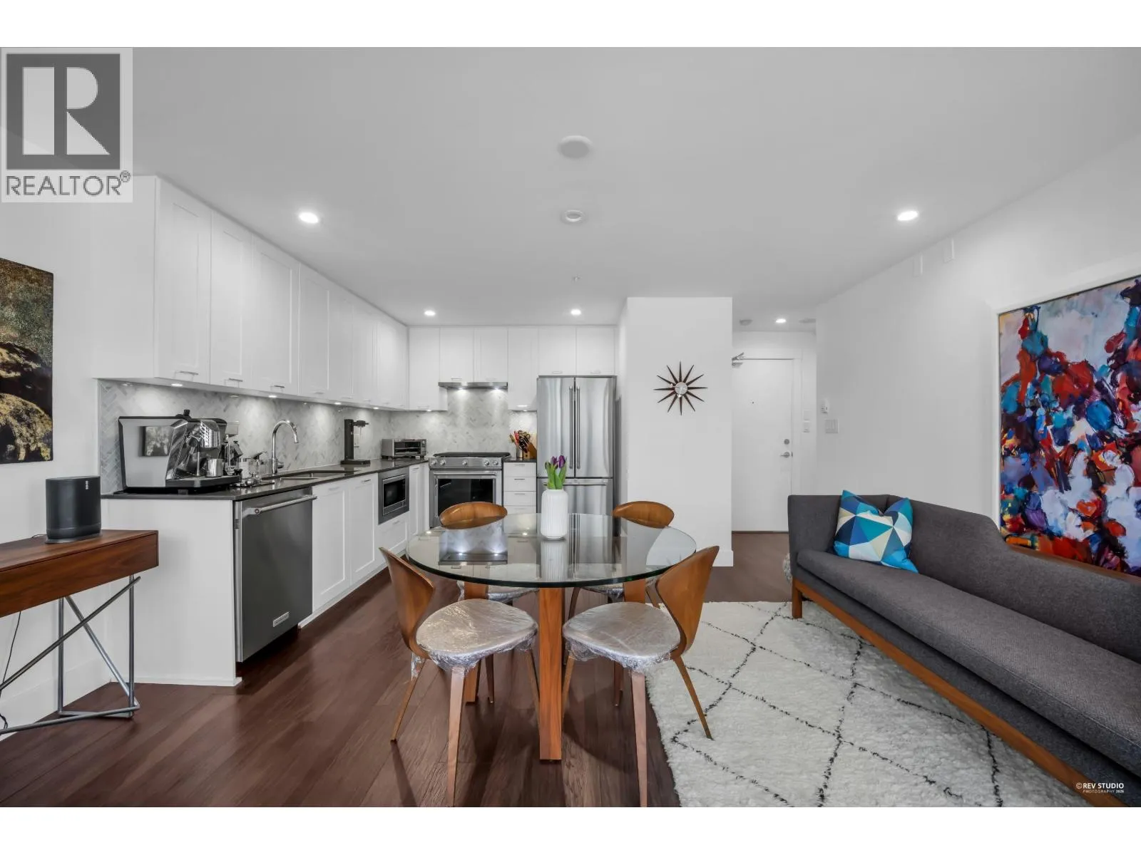 Modern luxury meets an unbeatable location at The Anchor in Lower Lonsdale. This stunning concrete condo features a bright, open floor plan highlighted by rich engineered hardwood and a gourmet kitchen complete with a gas range, quartz counters, and a herringbone marble backsplash. Enjoy breathtaking views of the Lions from your private deck, or relax in the massive king-sized bedroom. The building's crown jewel is the expansive rooftop deck, offering panoramic views, lounge areas, and gas BBQs for the ultimate entertaining space. Situated in a well-managed building with bike storage and ample visitor parking, you are just a short stroll from the Quay, incredible local shops, and a quick 12-minute Seabus ride to the city! (id:27476)