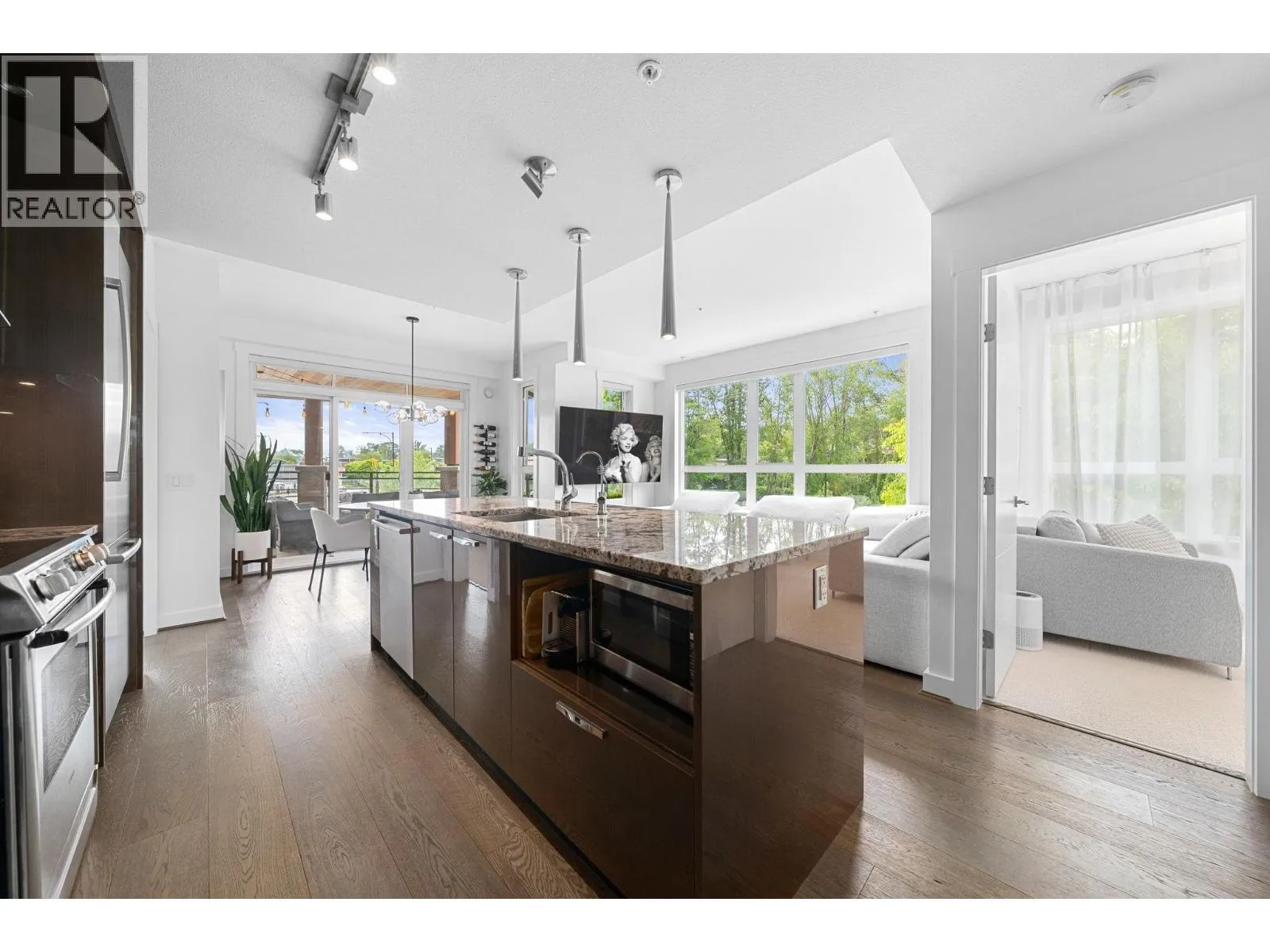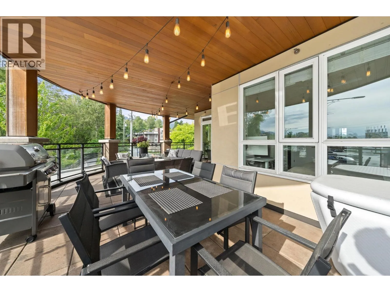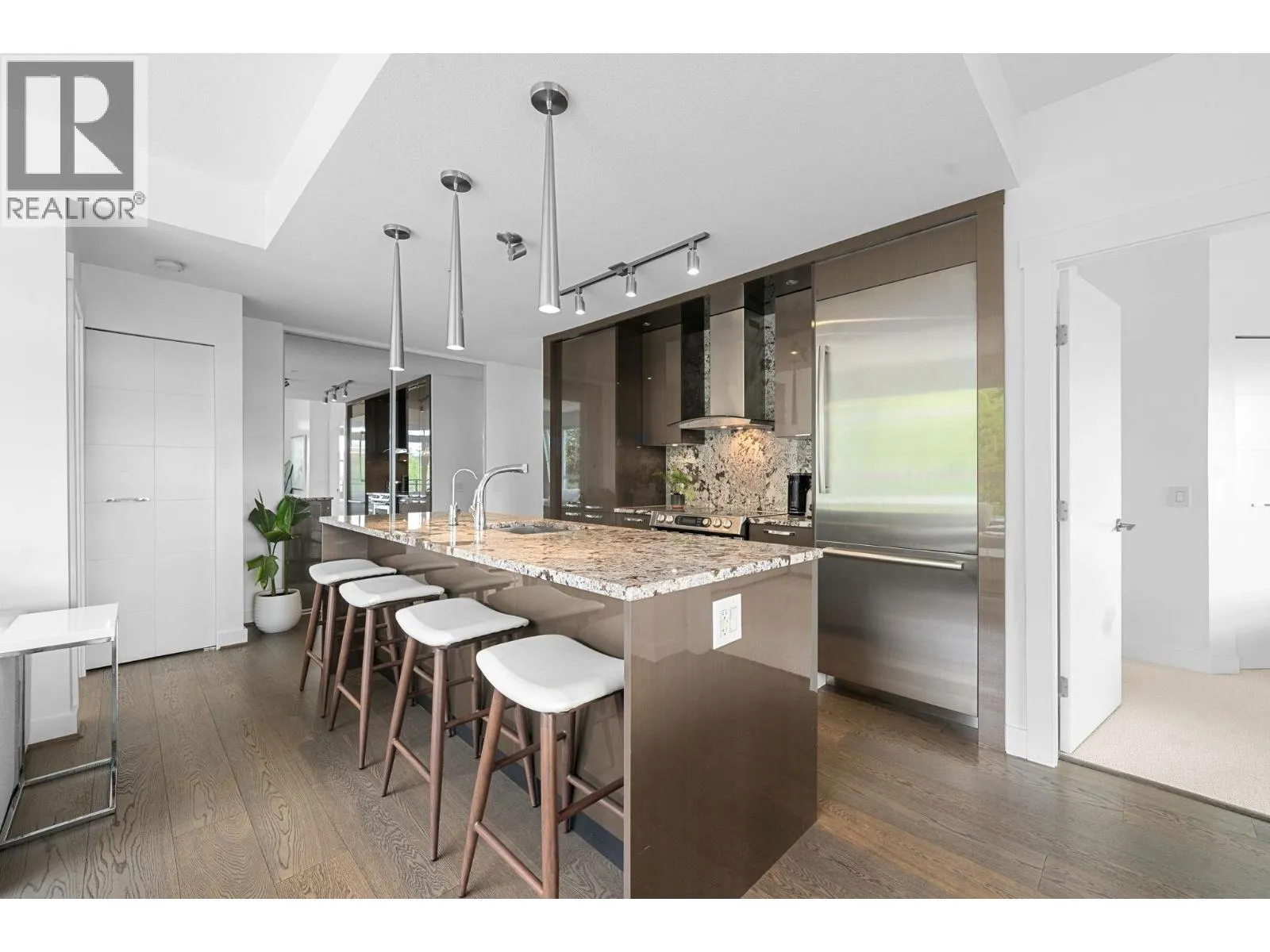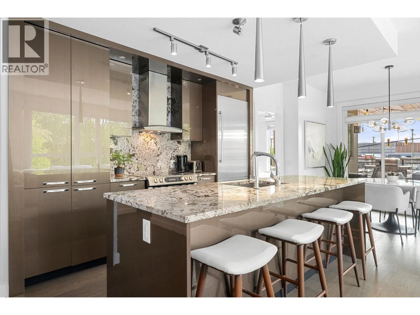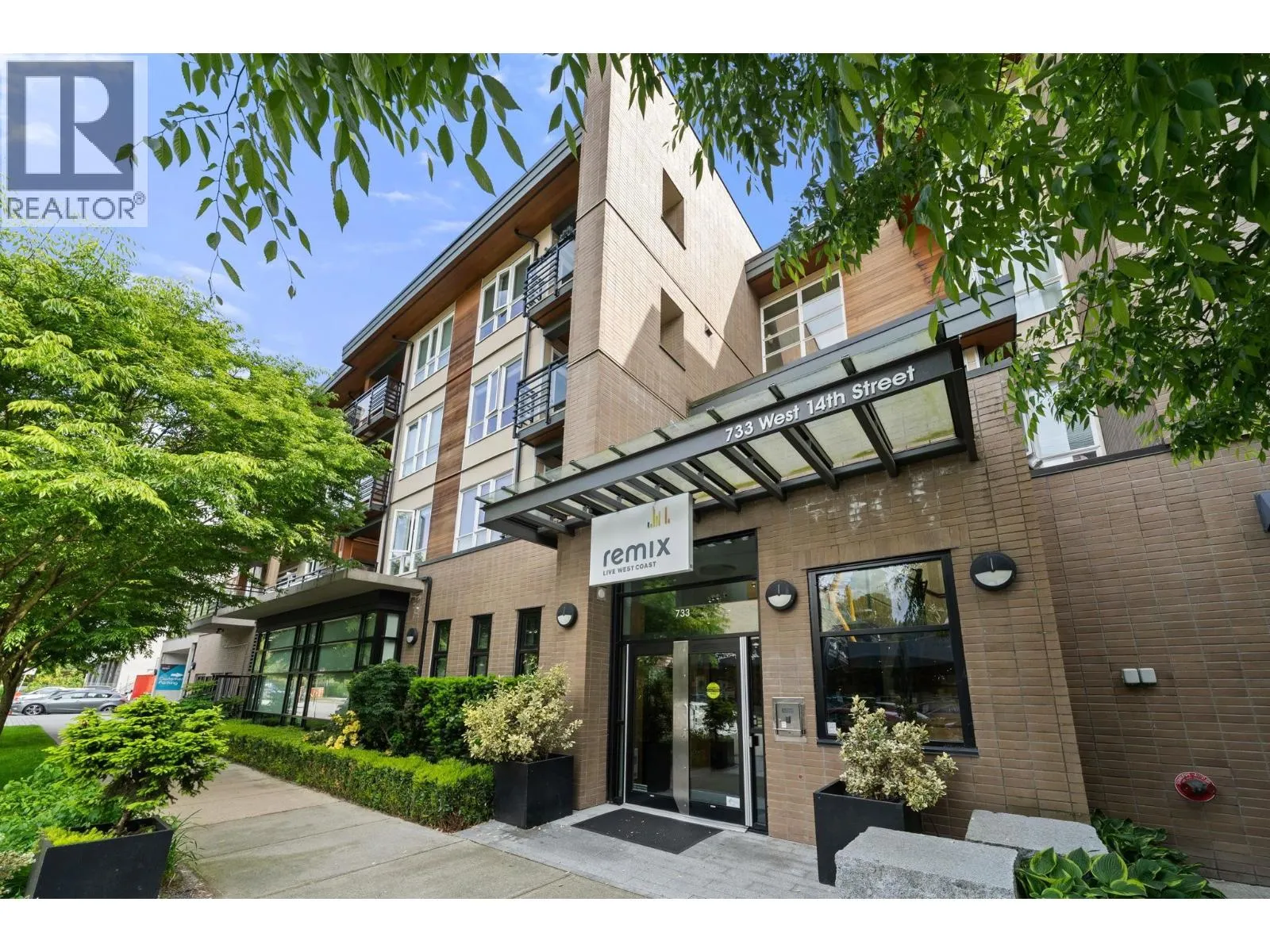 Rare 440 Sqft Private Patio Overlooking Mosquito Creek - A True Outdoor Oasis at Remix. Offering nearly 1,400 sqft of indoor/outdoor living space with massive wraparound patio, this bright 2-bedroom + den, 2-bath corner home features over-height ceilings, expansive windows, and smart layout with separated bedrooms for added privacy. Modern kitchen with granite counters, s/s appliances, and large island with breakfast bar. Flexible den perfect for home office or extra storage space. Tucked away in the pet-friendly Remix building, you're just steps from the Spirit Trail, dog park, shops, cafes, breweries, and transit. Incredible indoor/outdoor living in one of North Vancouver´s most walkable, connected communities. Complete with EV parking and storage. Don´t miss it - call today! (id:27476)