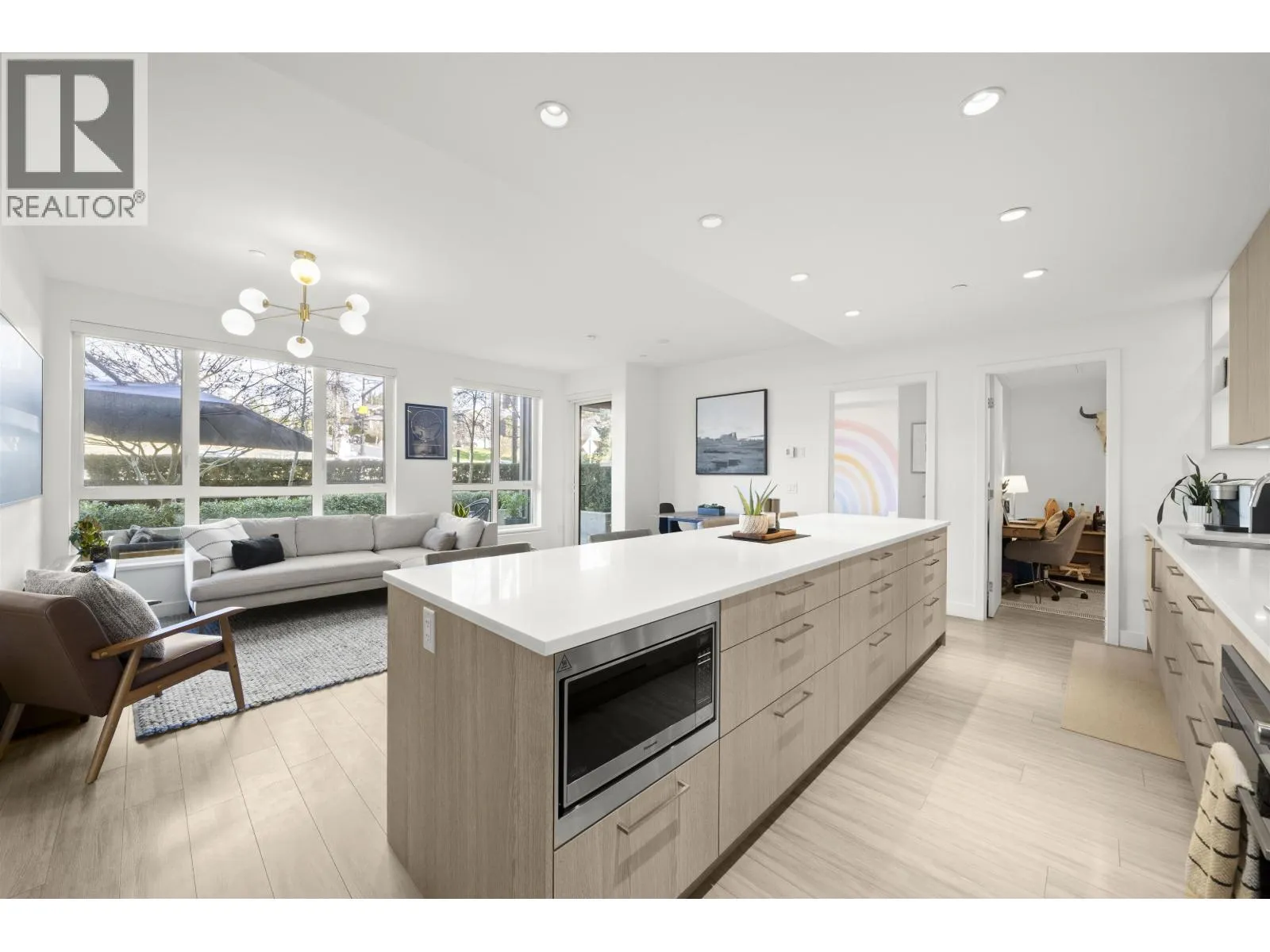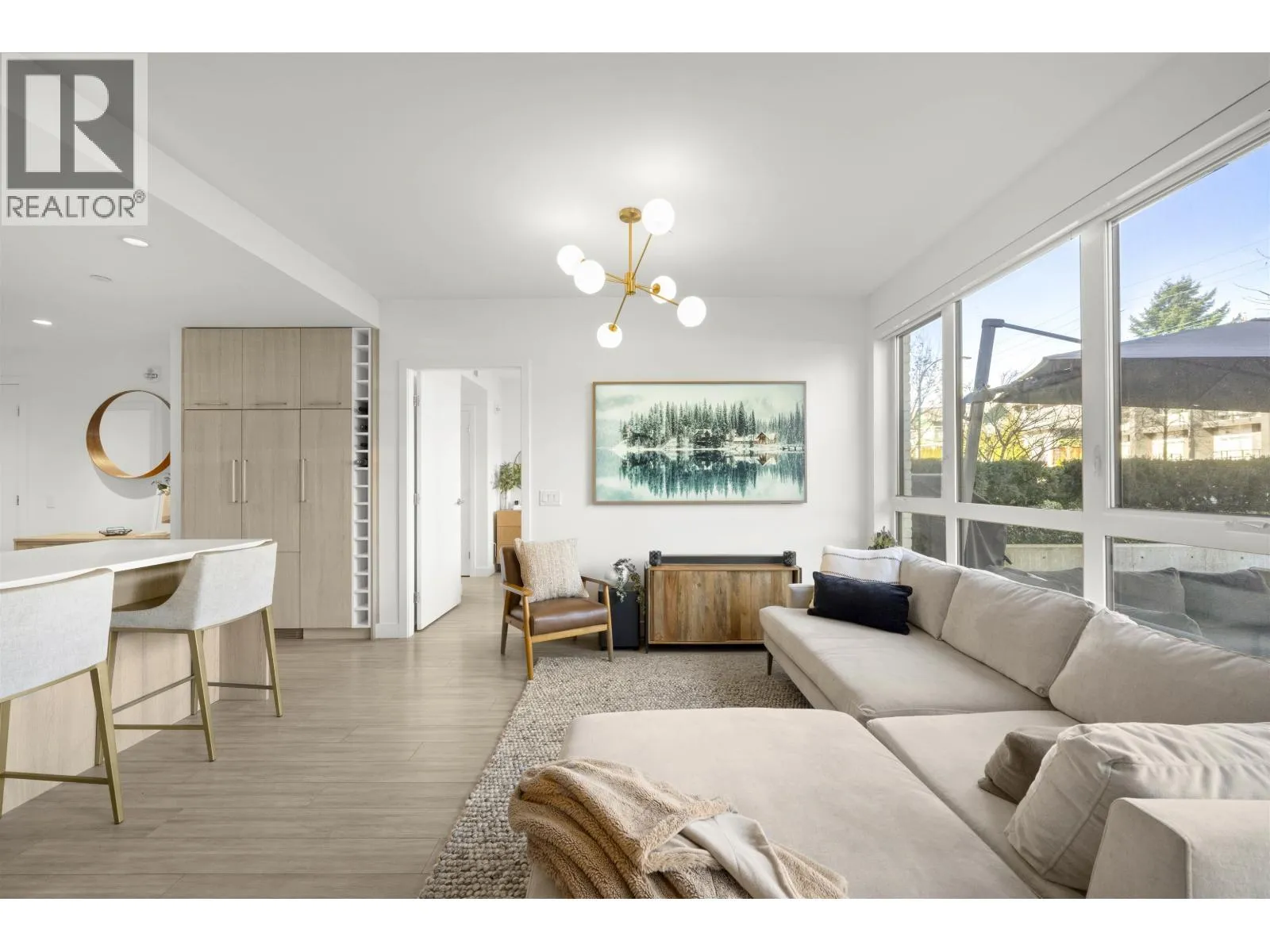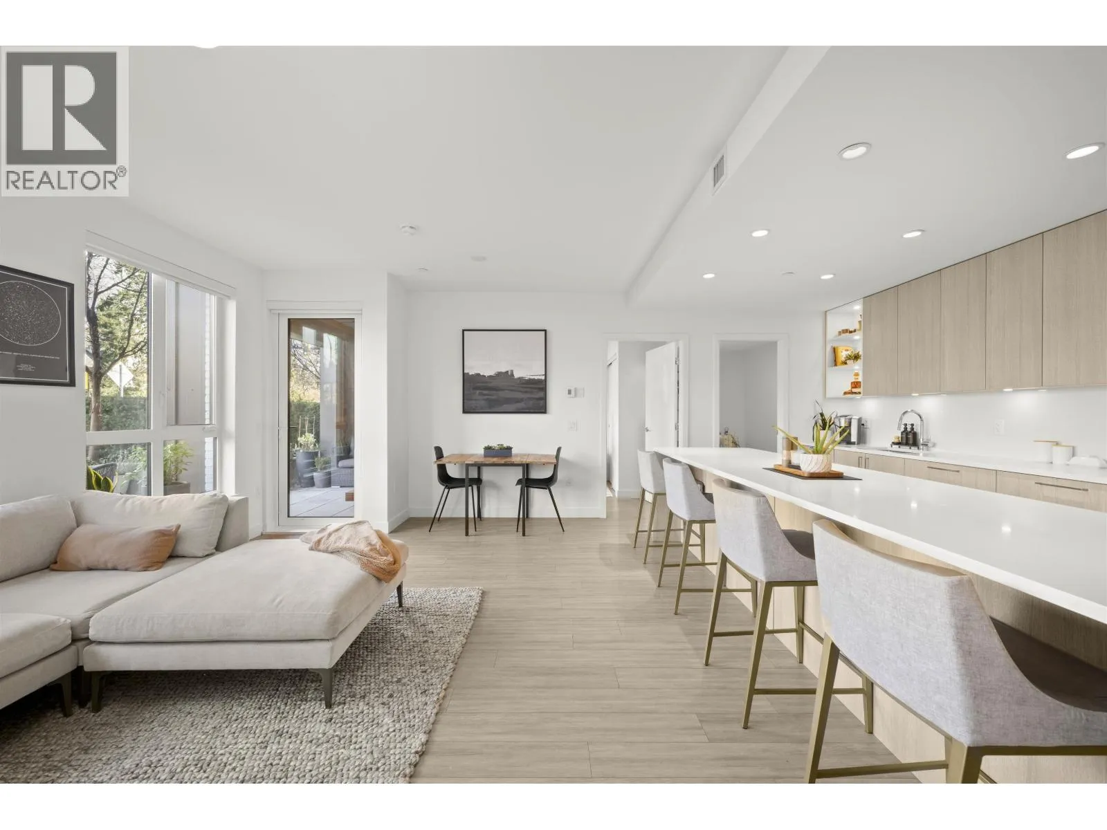 Rarely available ground-level 2 Bed + Den offering over 1,000 square ft of interior living plus an impressive ~500 square ft private patio in the LEED Platinum-certified building. Thoughtfully designed with a spacious, functional open layout anchored by a stunning oversized island that seamlessly connects the kitchen and living area-perfect for everyday living and entertaining. Enjoy walk-out access to an impressive oversized north-facing patio, ideal for pets, kids, or relaxing outdoors. Showroom condition with a high-end integrated kitchen, premium cabinetry and A/C for year-round comfort. Amenities include a fitness centre, lounge, guest suite and EV charging. Steps to Moodyville Park and the Spirit Trail, and just minutes to vibrant Lower Lonsdale. Pet friendly with 2 parking stalls included. OH Mar 14: 2-4PM (id:27476)