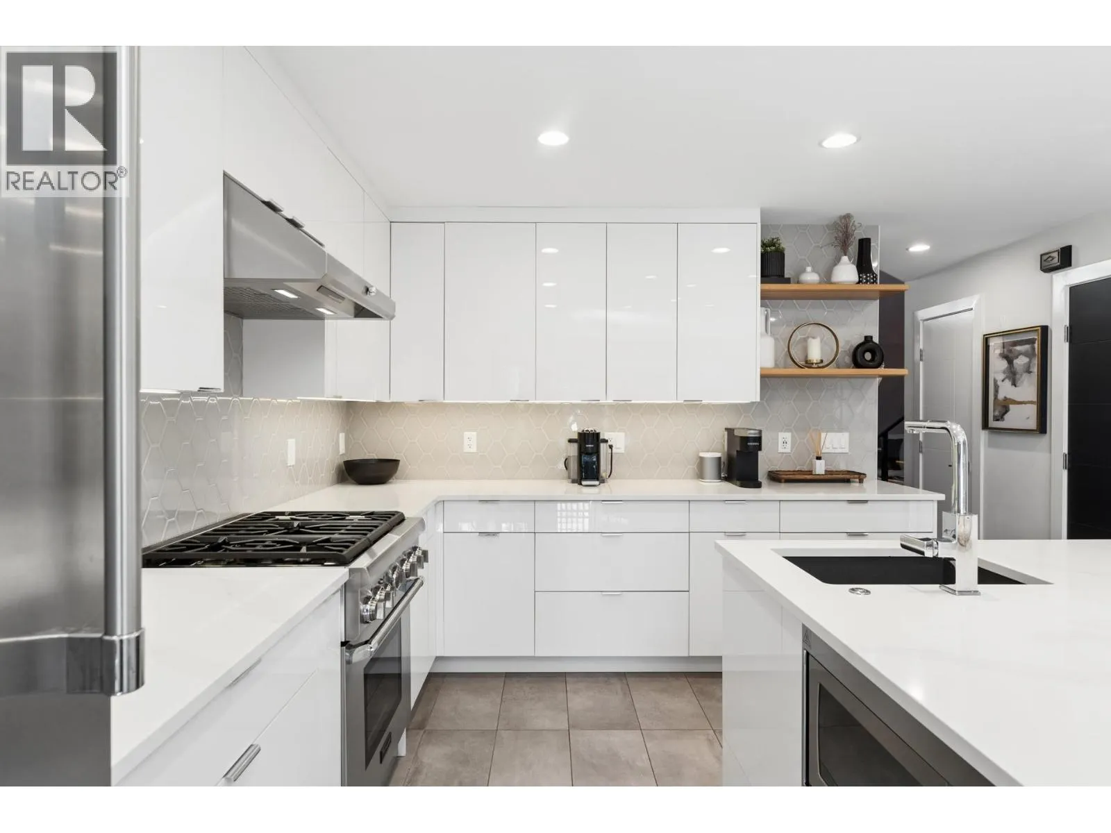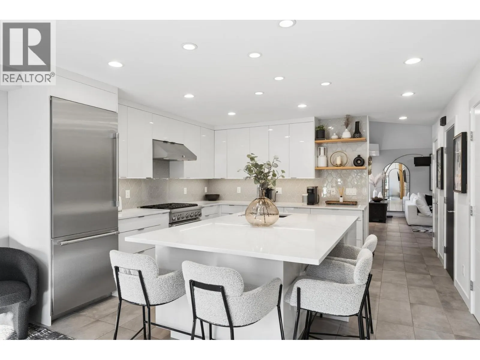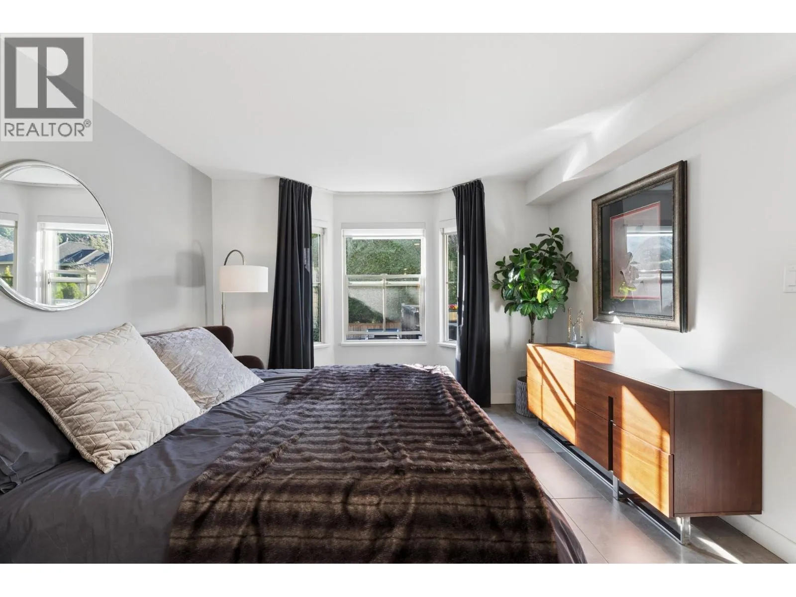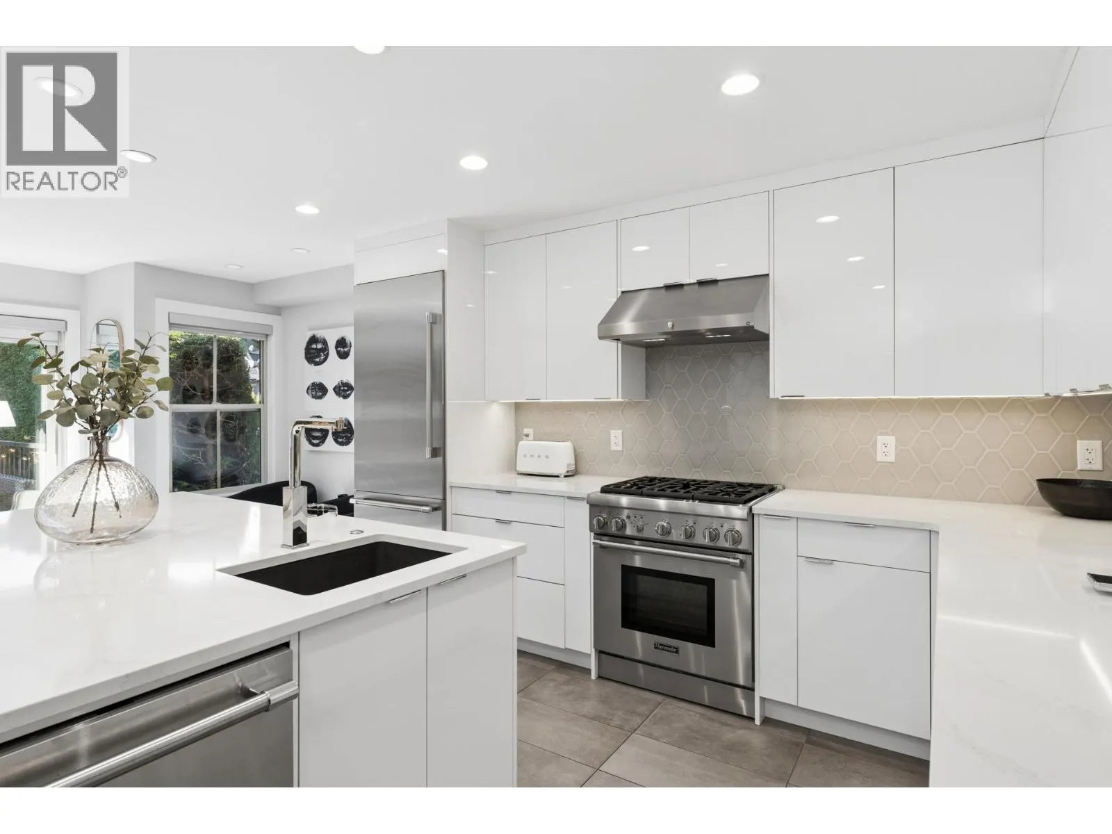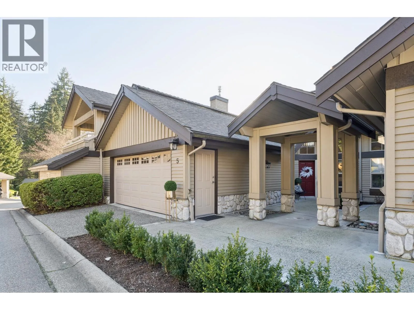 Stunningly renovated townhome in sought-after Nahanee Woods. Offering 3 bedrooms, 3 bathrooms, and over 1,800 square ft on two levels, including a spacious main-floor primary bedroom. The foyer opens to an open-concept living and dining area with vaulted ceilings, gas fp, and white oak stairs with metal and glass railings. Tile flooring with radiant in-floor heating spans the main level, complemented by a recent heat pump and A/C upgrade. The open kitchen features sleek white cabinetry, quartz counters, a large island, and Thermador appliances. A flex space with a second gas fireplace opens to a private west-facing deck. The main-floor primary retreat includes bay windows, walk-in closet, and renovated 5-piece ensuite. Upstairs are two generous bedrooms, a 4-piece bath, and flexible landing. Quietly located near parks, shopping, recreation, schools, and trails. (id:27476)
