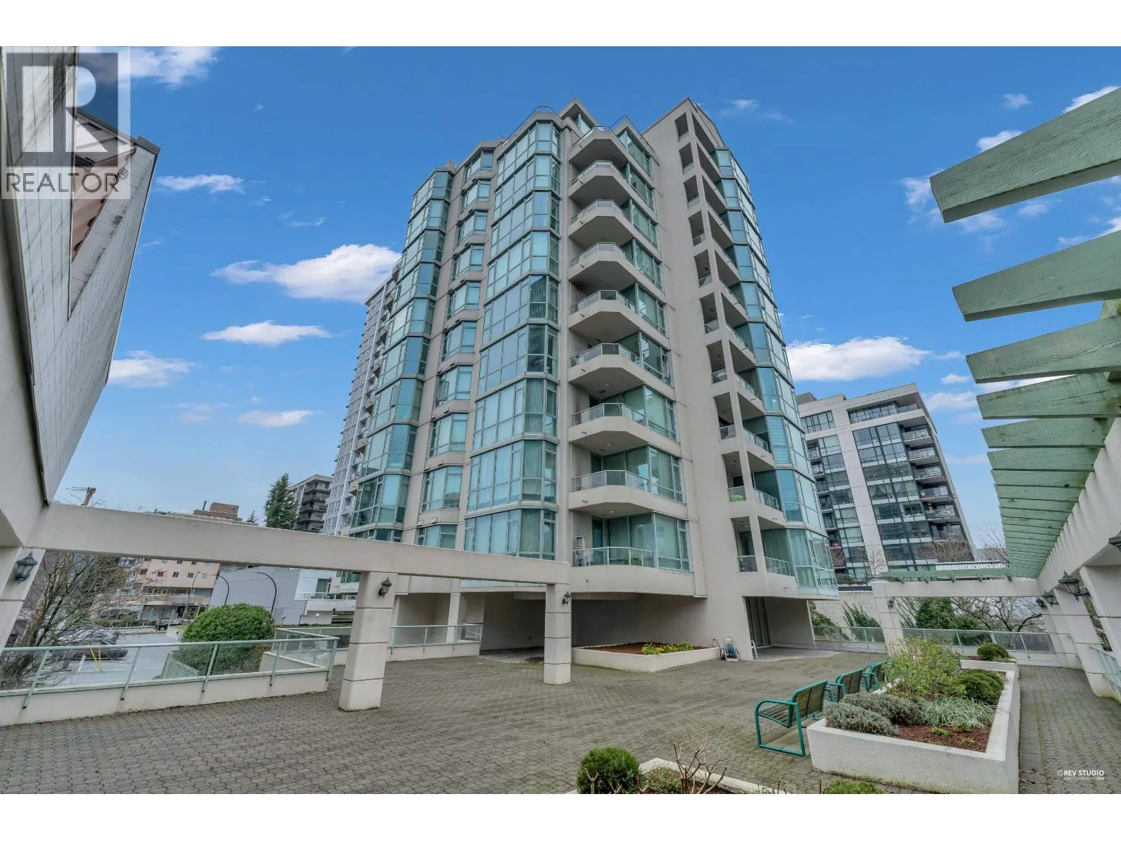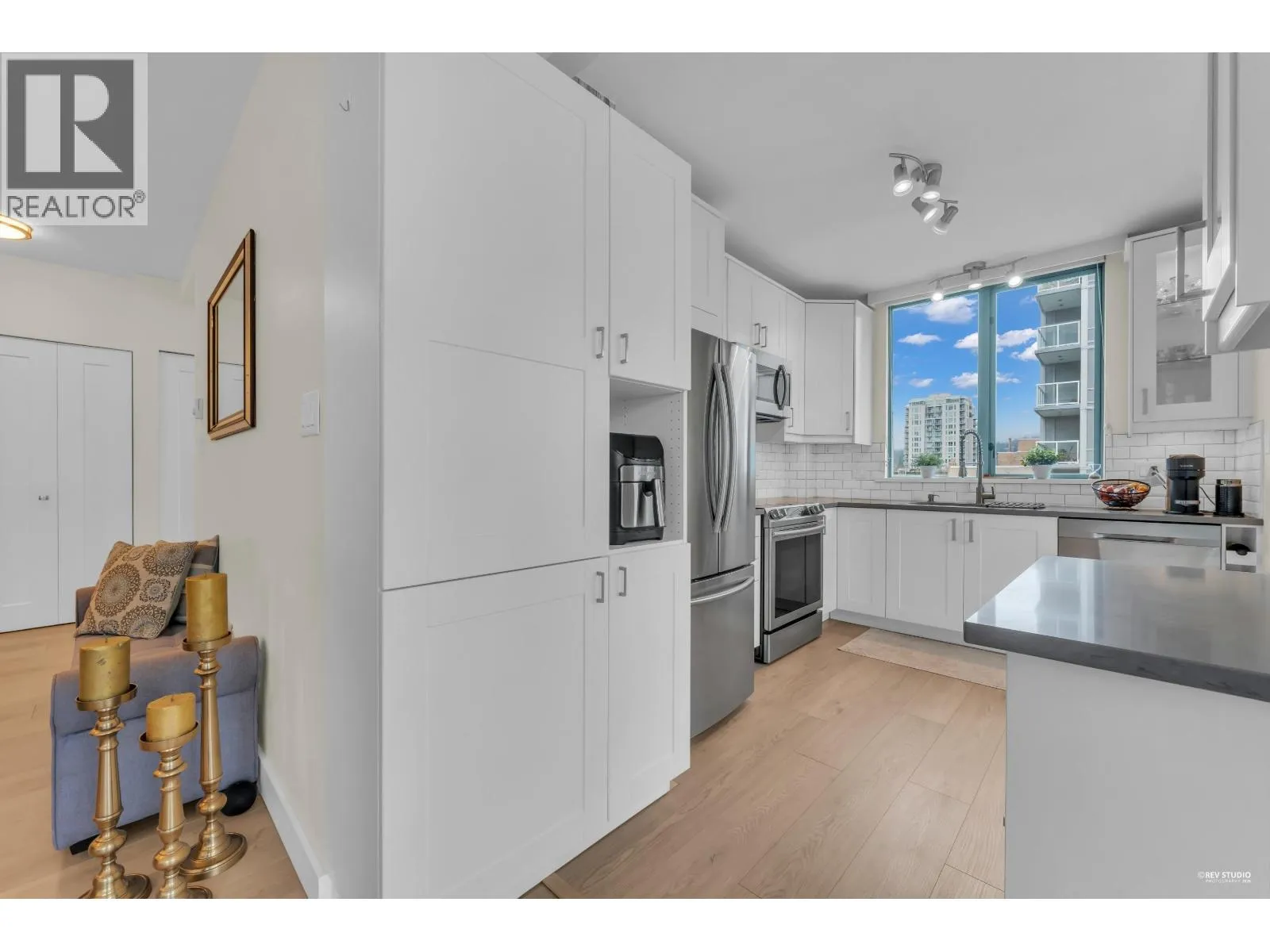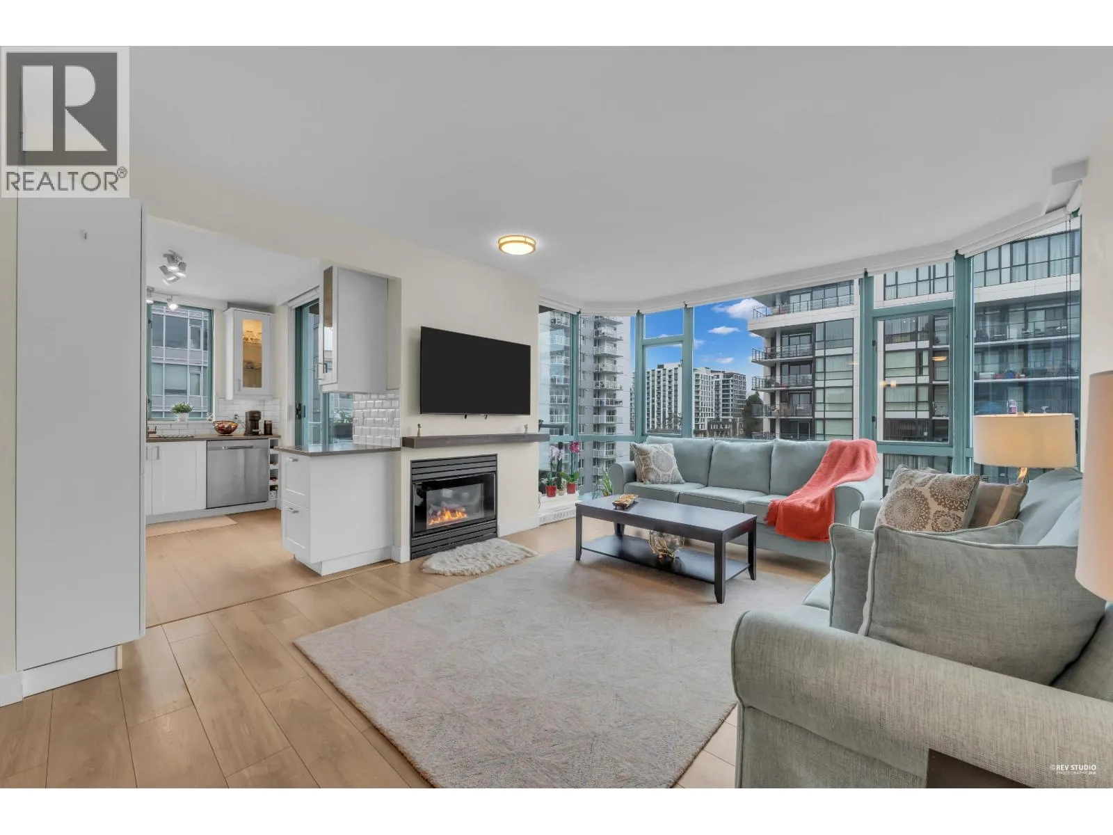 Welcome to this bright corner unit in sought-after Central Lonsdale, offering more than 1,000 sq/ft of comfortable living with 2 bedrooms and 2 bathrooms. Enjoy 9-foot ceilings, large windows, and wide-plank flooring that enhance the airy feel throughout the home. The open living and dining space is flooded with natural light and features a gas fireplace, making it ideal for both relaxing and entertaining. The kitchen includes stainless steel appliances, quartz counters, a pantry, and access to a covered balcony perfect for all-season BBQs. Two spacious bedrooms enjoy mountain views, including a primary bedroom with a spa-style 5-piece ensuite complete with a frameless glass shower, soaker tub, and double sinks. This well-kept concrete building includes secure parking and a storage locker (id:27476)