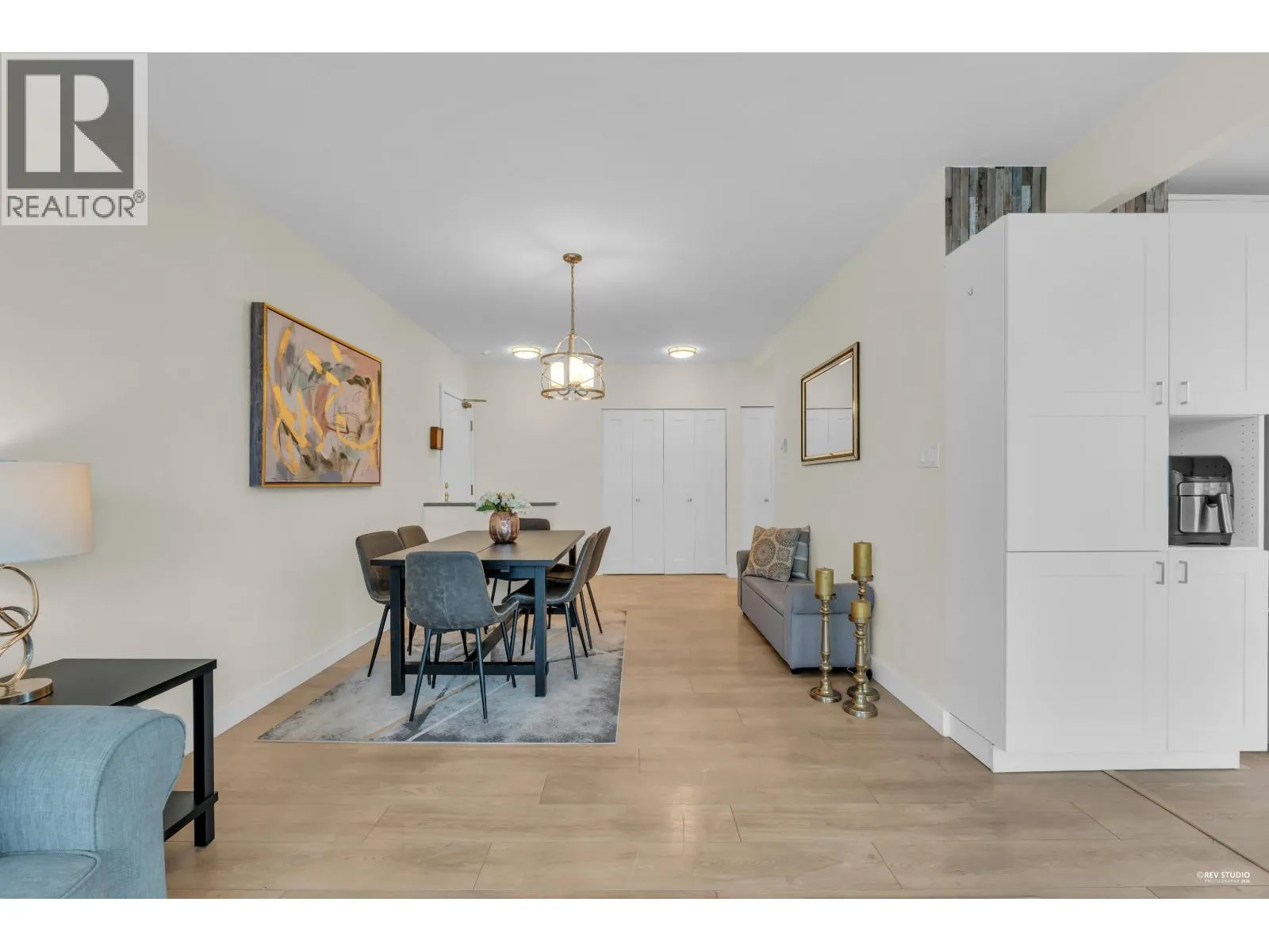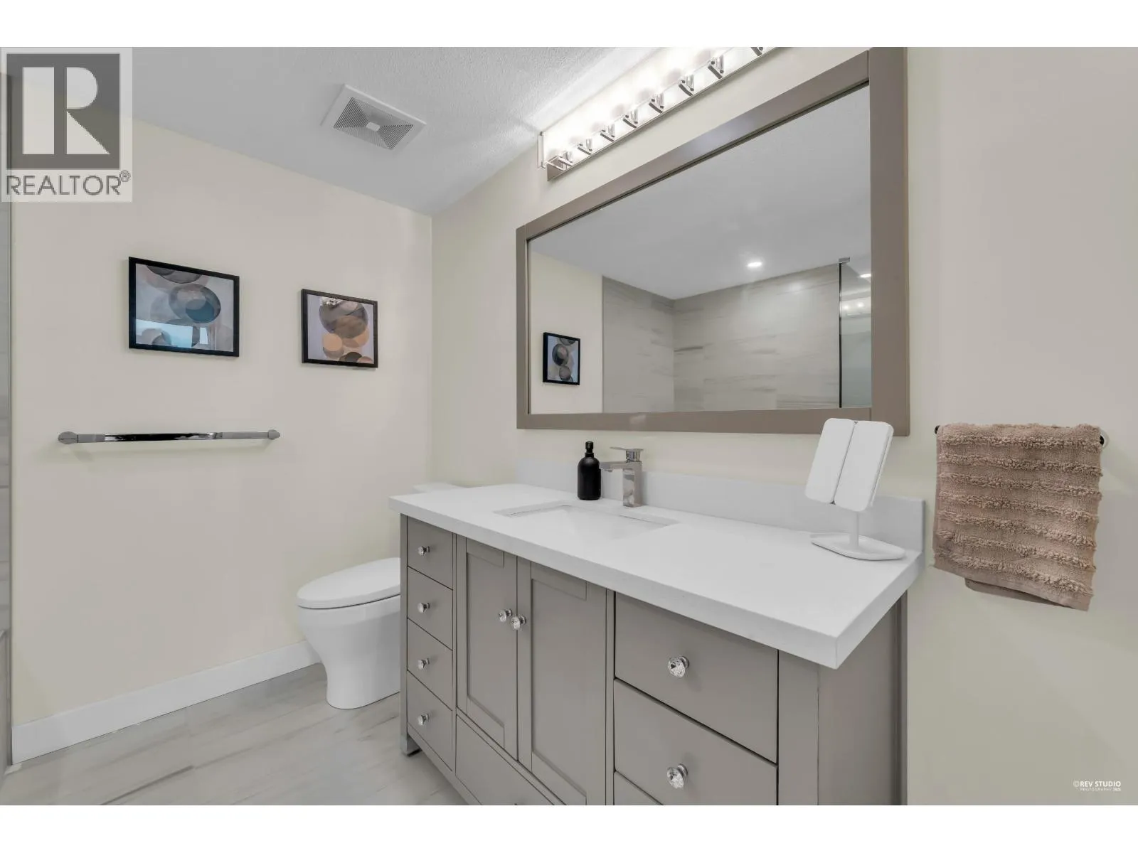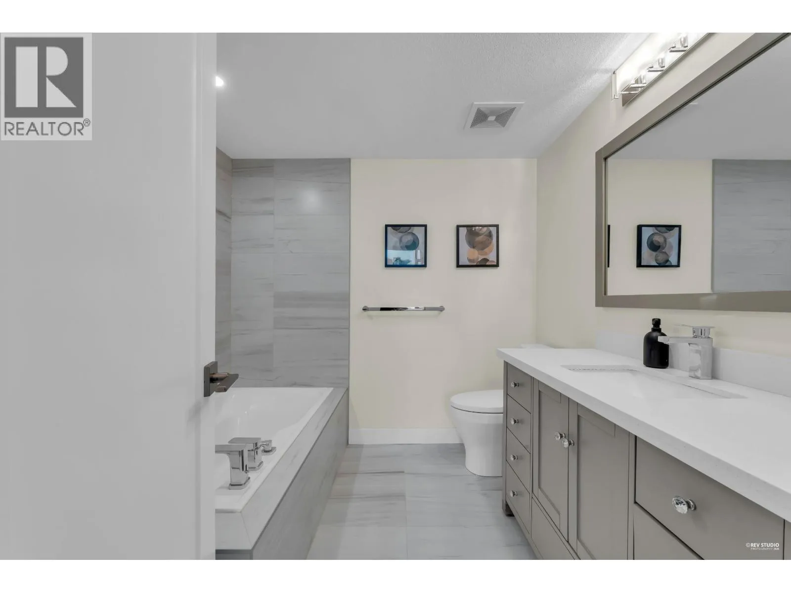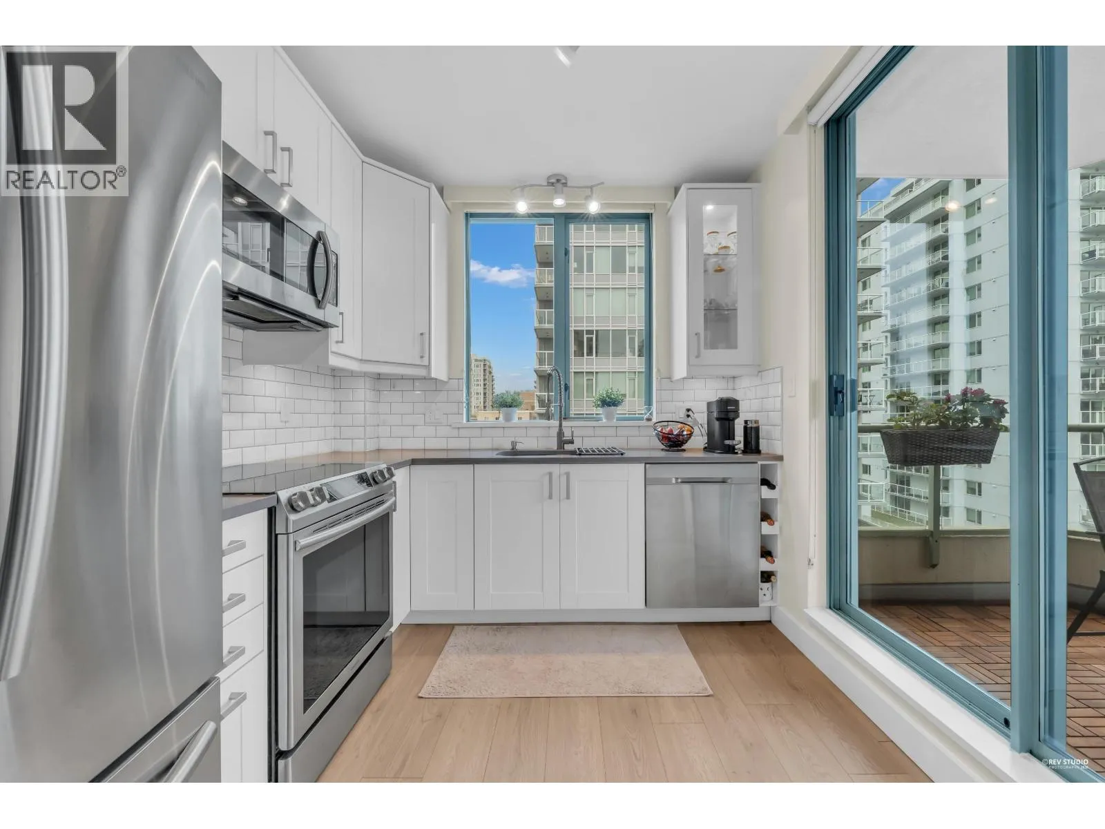 Welcome to this bright corner unit in sought-after Central Lonsdale, offering more than 1,000 sq/ft of comfortable living with 2 bedrooms and 2 bathrooms. Enjoy 9-foot ceilings, large windows, and wide-plank flooring that enhance the airy feel throughout the home. The open living and dining space is flooded with natural light and features a gas fireplace, making it ideal for both relaxing and entertaining. The kitchen includes stainless steel appliances, quartz counters, a pantry, and access to a covered balcony perfect for all-season BBQs. Two spacious bedrooms enjoy mountain views, including a primary bedroom with a spa-style 5-piece ensuite complete with a frameless glass shower, soaker tub, and double sinks. This well-kept concrete building includes secure parking and a storage locker (id:27476)
