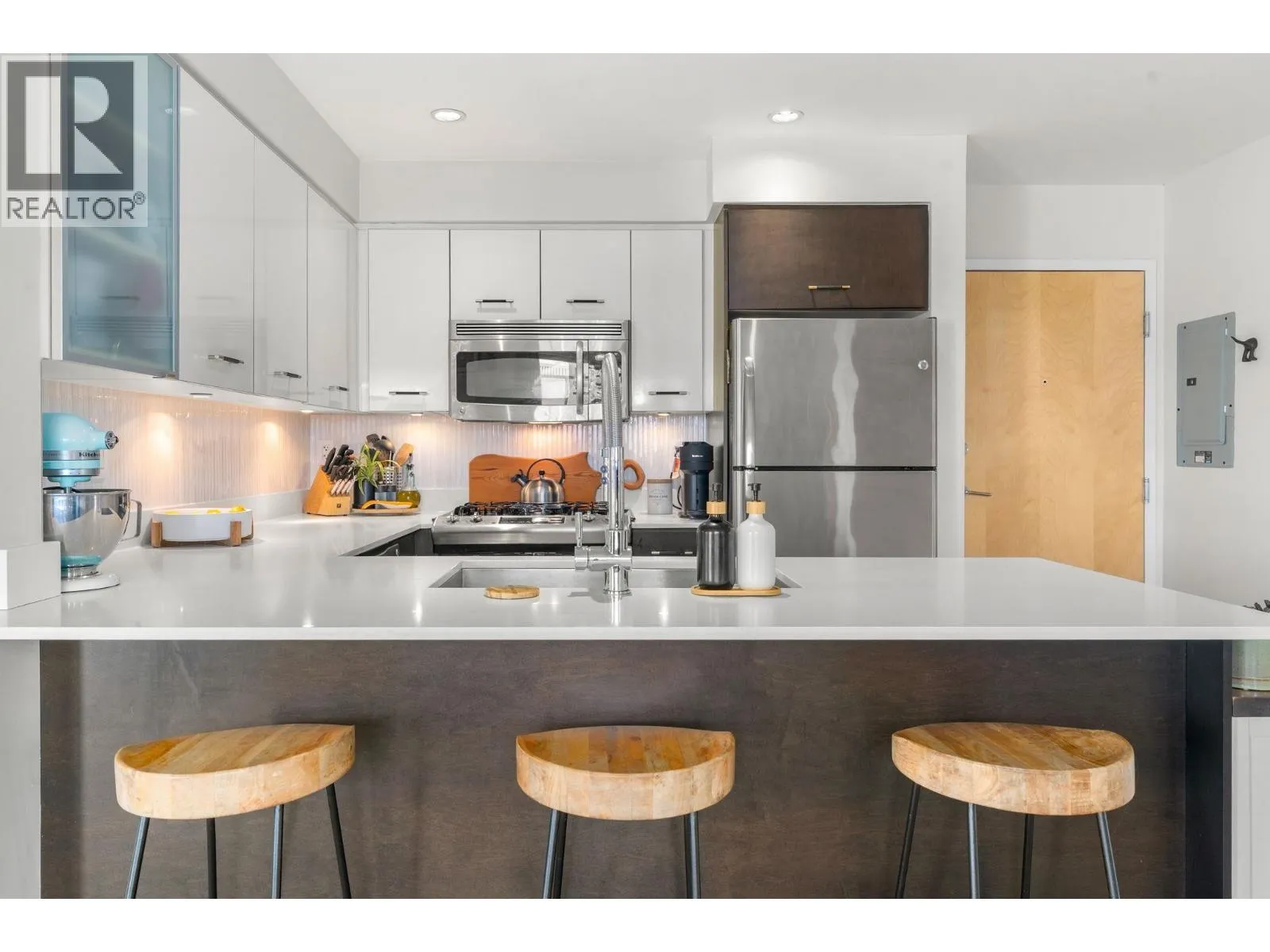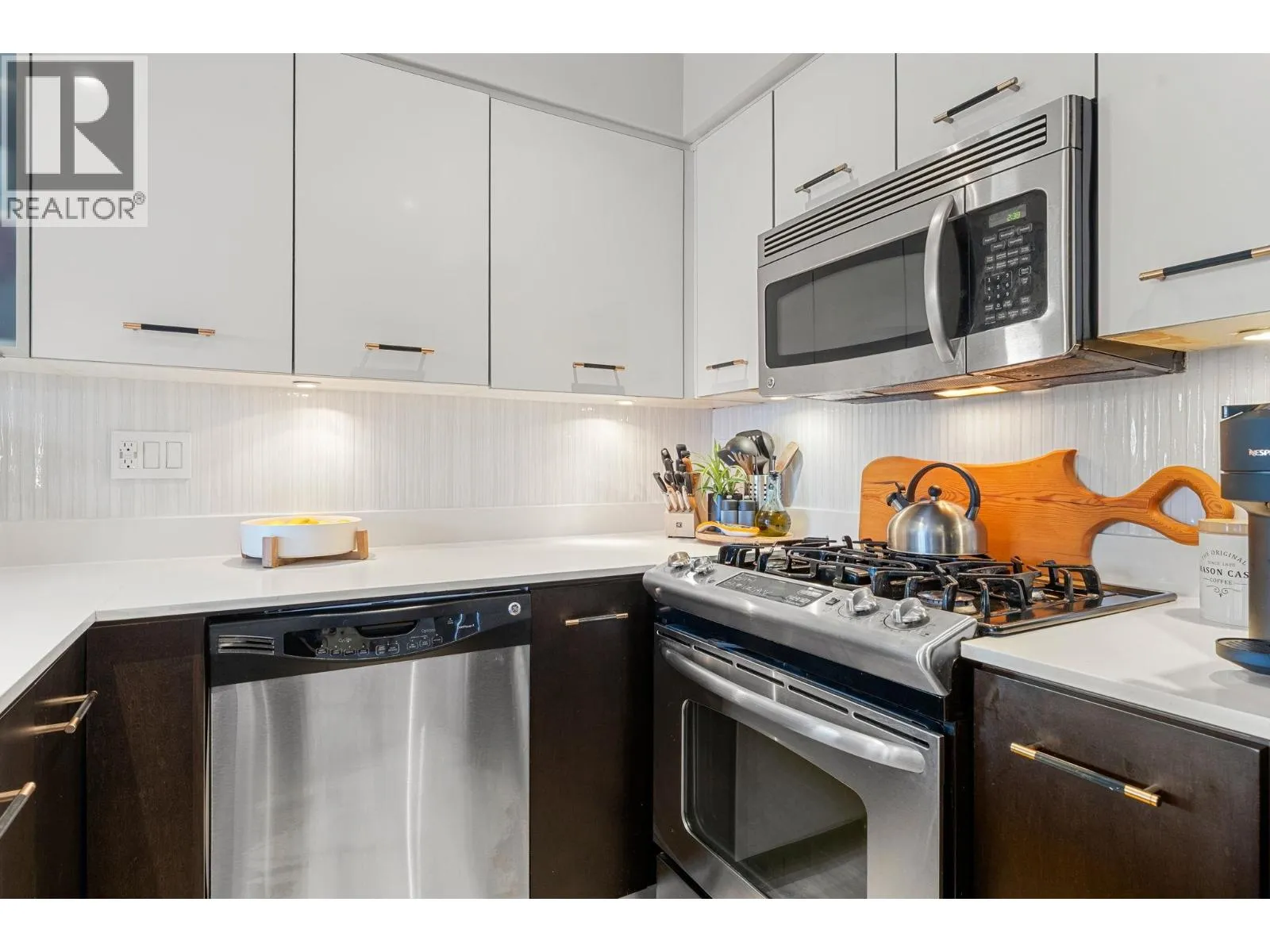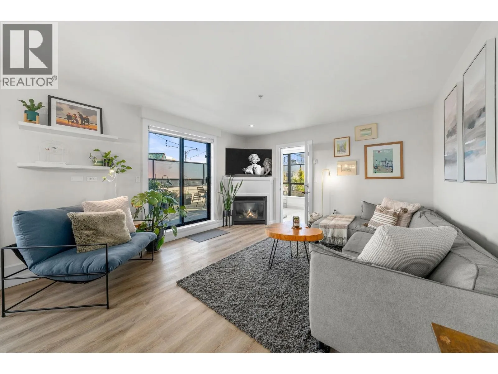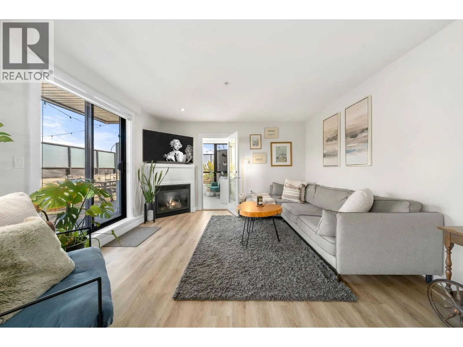 The perfect floorplan, truly one of a kind. This 2 bed + Den (or 3rd bedroom) spans the width of the building with window exposures North, East, and South. An expansive 1,013 sqrft interior and an incredible 999 sqrft private patio provide a townhome feel. Entertainers welcome; the patio boasts a HOT TUB, built-in BBQ and fridge, with bar seating and space for endless plants and gardening. The kitchen features stone counters, stainless steal appliances, new tile backsplash and a gas range. Relax at the fireplace inside or out. No car needed; grocery stores, shopping, parks, restaurants, all within 1 block. Pets and rentals welcome. (id:27476)