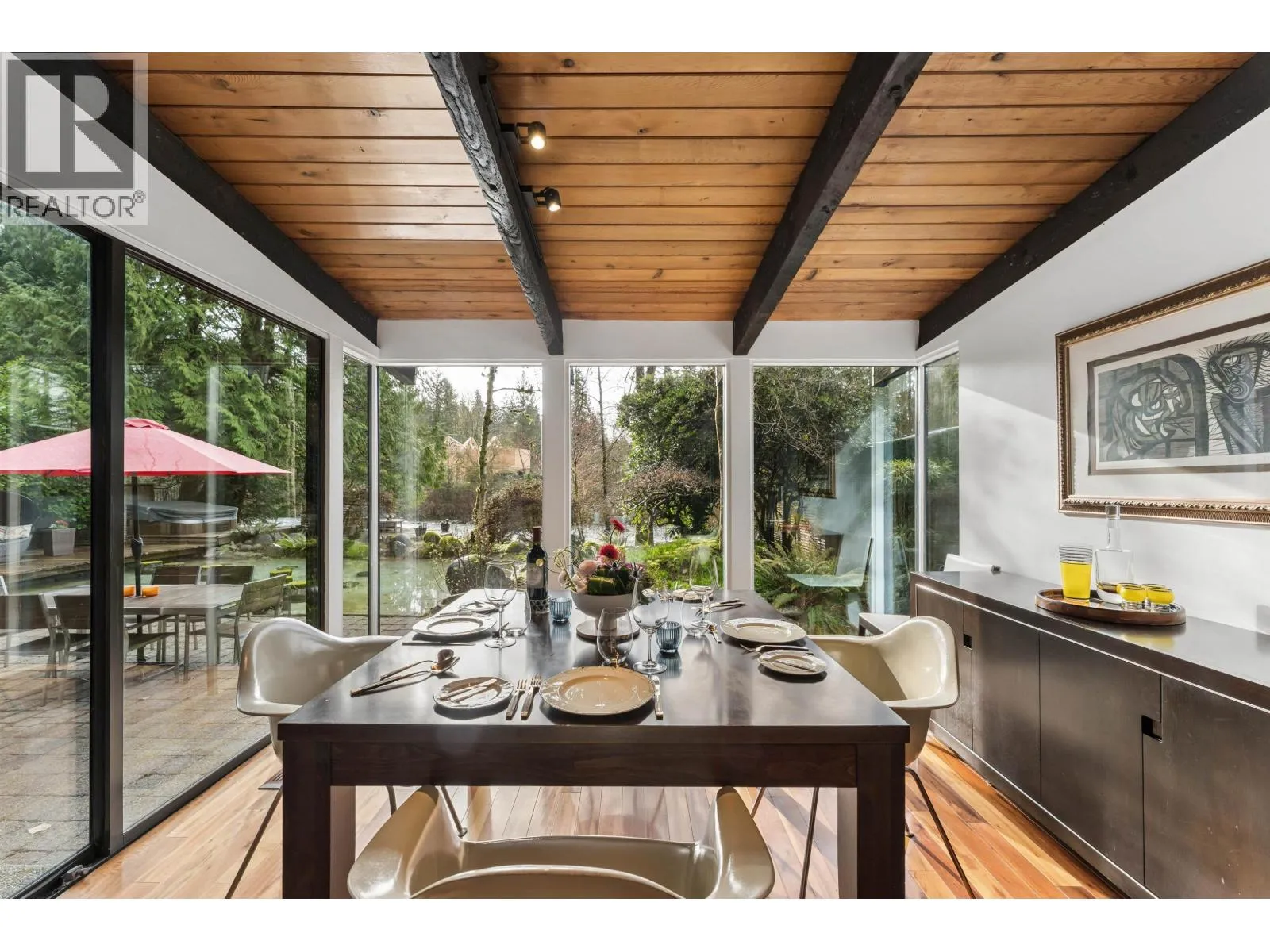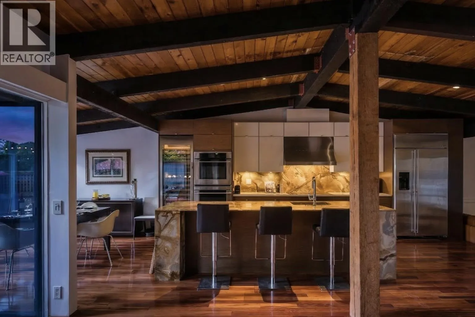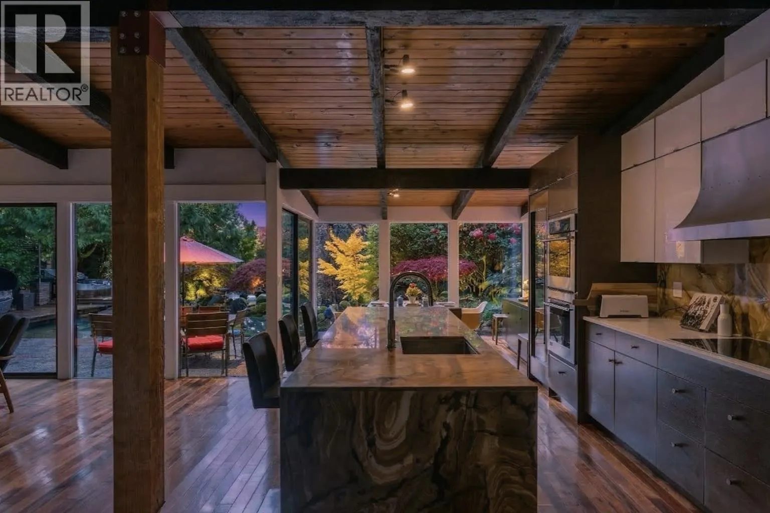 The River Pavilion - Welcome to 808 Seymour Boulevard. A masterclass in Post & Beam architecture, this riverfront sanctuary begins with a private gated entry and Zen garden, setting a tone of profound stillness. Inside, soaring structural timbers and floor-to-ceiling glazing dissolve the boundary between the refined interior and the riparian landscape. The heart of the home is a grand gathering space where wide-plank hardwoods and bespoke millwork frame Seymour river. The transition to the water is deliberate: a tranquil koi pond and starlit hot tub anchor the private outdoor space between the residence and the river´s edge. Featuring 3 bedrooms, a full rec/flex wing, and a dedicated library, 2-car garage, exposed elements throughout - this truly is a special home. (id:27476)