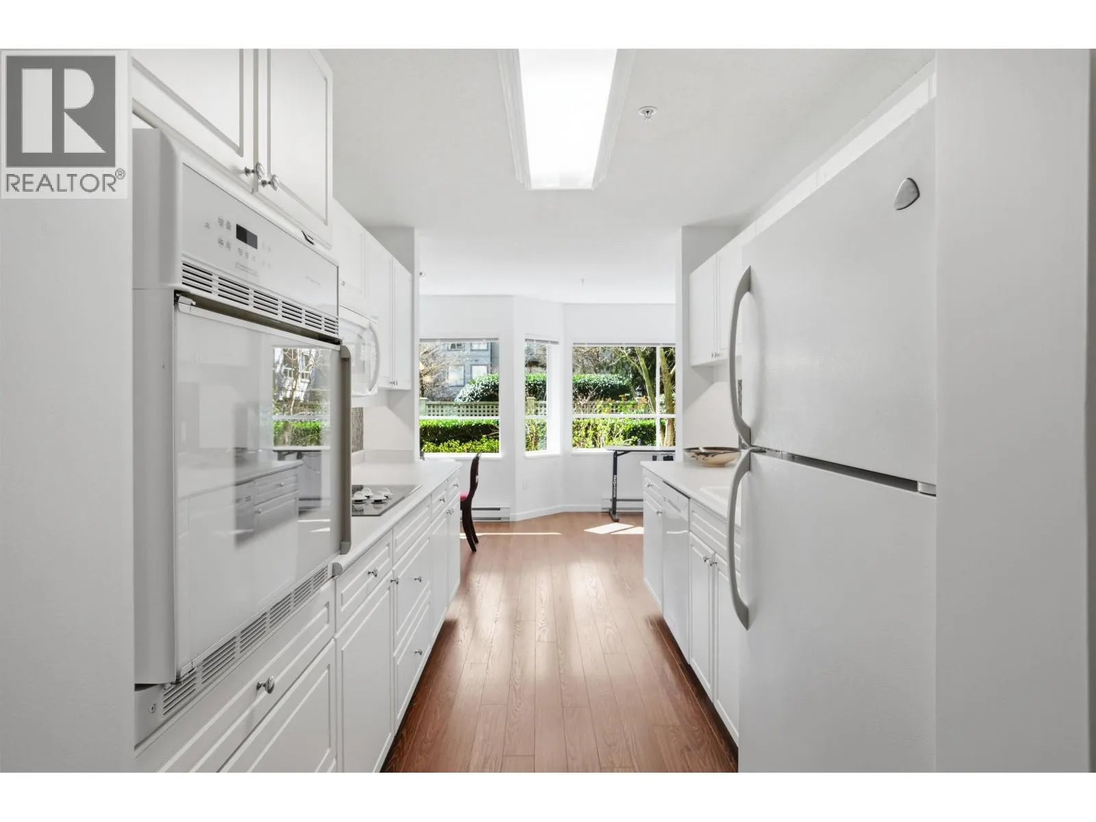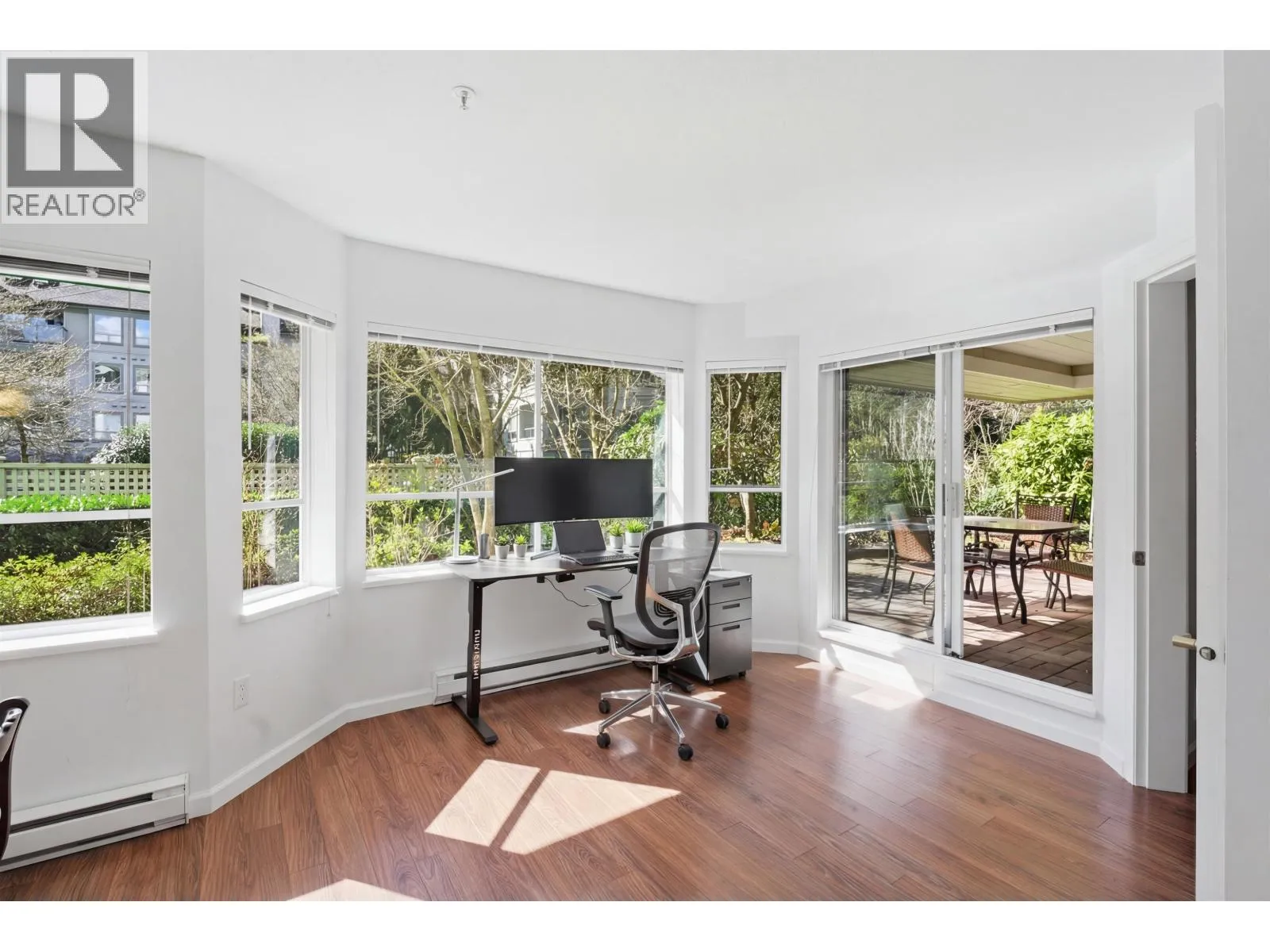 Welcome to Parkgate Manor! This bright, ground-floor 2-bed, 2-bath home offers 1,384 sq. ft. of inviting living space. The "opposite ends" layout ensures maximum privacy, perfect for growing families or guests. Enjoy a large eat-in kitchen and a dedicated workspace framed by a full wall of picture windows overlooking landscaped gardens. Step out to your sunny, south-facing patio for ultimate relaxation. The primary suite features a massive ensuite with heated floors and an updated spa-inspired shower with a bench. Rare bonus: a full laundry room and same-floor storage! Steps to Parkgate Plaza, library, community center, and St. Pius & Dorothy Lynas Elementary School. Cats only in this friendly, inclusive community. Move-in ready with room for your aesthetic touch. North Shore living at its best! (id:27476)