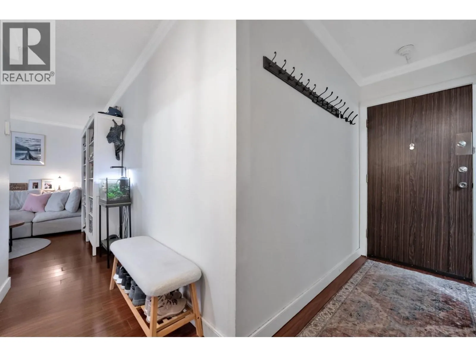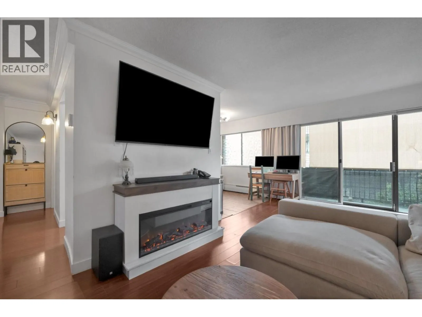 Bright and spacious suite in a well-maintained building in Central Lonsdale, steps to Lions Gate Hospital, shops, cafés, and restaurants. Close to Whole Foods, Loblaws, and the vibrant Lonsdale strip. Elevated first-floor home (not ground level) with a southwest-facing balcony offering great light and outdoor space. Features engineered hardwood floors, crown mouldings, heritage-style doors, and modern lighting. Updated kitchen with solid wood cabinetry and white appliances, plus a refreshed bathroom. Transit to Vancouver is right outside, with Club 16 and Fitness World nearby. Walk to Lonsdale Quay, Shipyards, and the waterfront. Includes parking and storage. Safe, central location with strong walkability and everyday convenience. (id:27476)