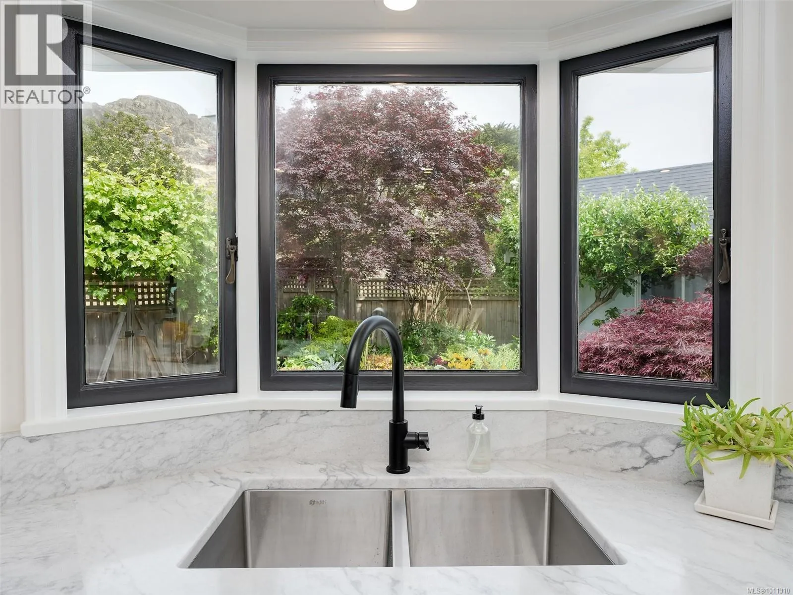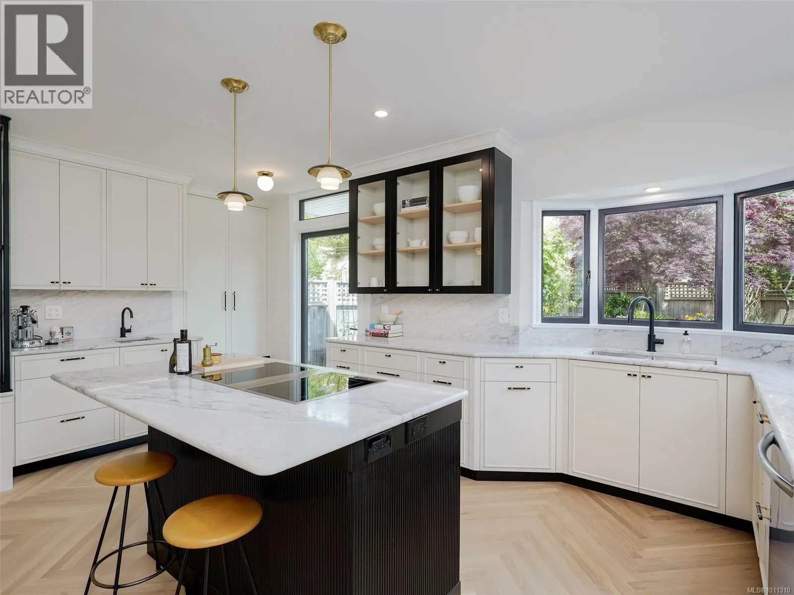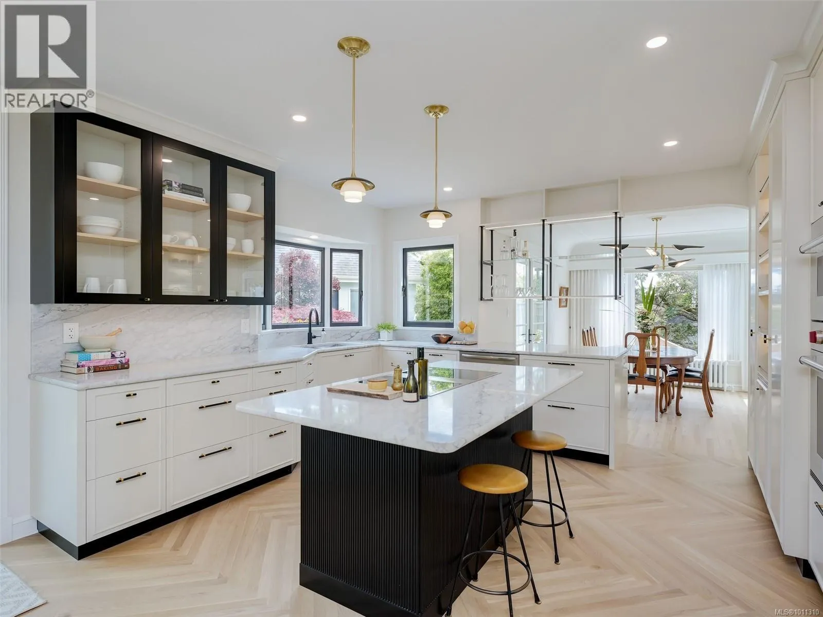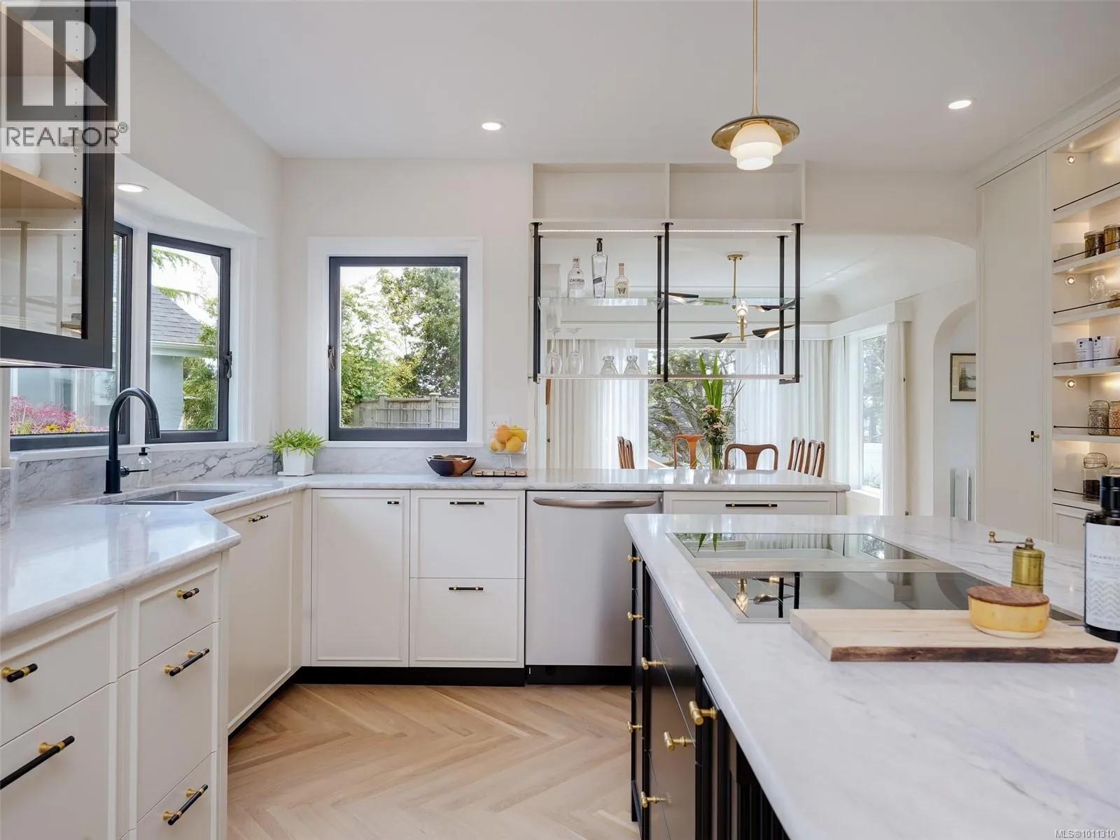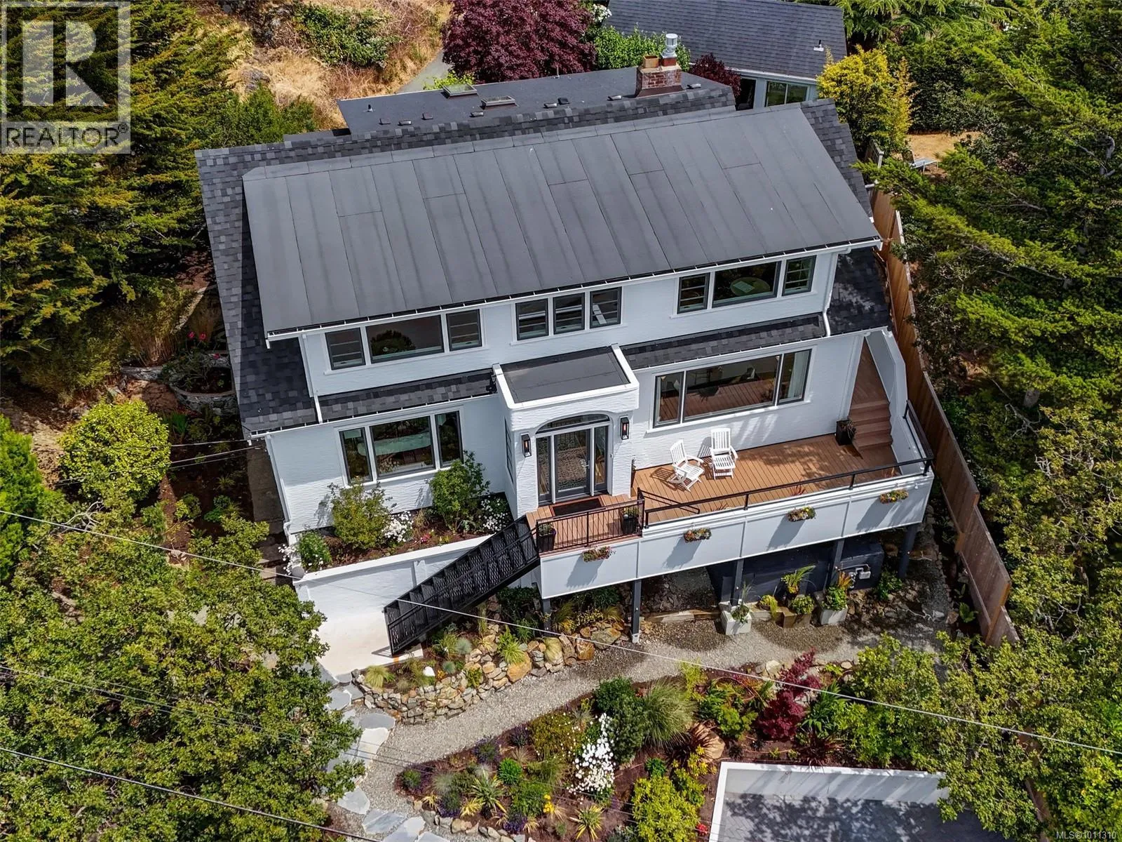 With panoramic views over the Juan de Fuca Strait and Olympic mountains, this remarkable home offers a rare combination of modern luxury, architectural character, and sought-after location. Exquisitely and thoroughly upgraded by the current owners, the new design blends timeless charm with modern elegance. The custom kitchen by Douglas Grant features marble counters, top of the line appliances and herringbone oak floors. The master suite has vaulted ceilings and a multi-room ensuite with views. French doors link the main living spaces to an ocean view deck as well as to the warm south facing rear patio garden, nestled beneath Walbran Park that naturally extends the private backyard. Tech systems include an integrated UNIFI WiFi network with âsmartâ components, privacy-focused security and weather-aware irrigation. A short walk to Gonzales beach, this home is part of the diverse and family-focused Harling Point neighbourhood, a peaceful retreat in a world class recreational oasis. (id:27476)