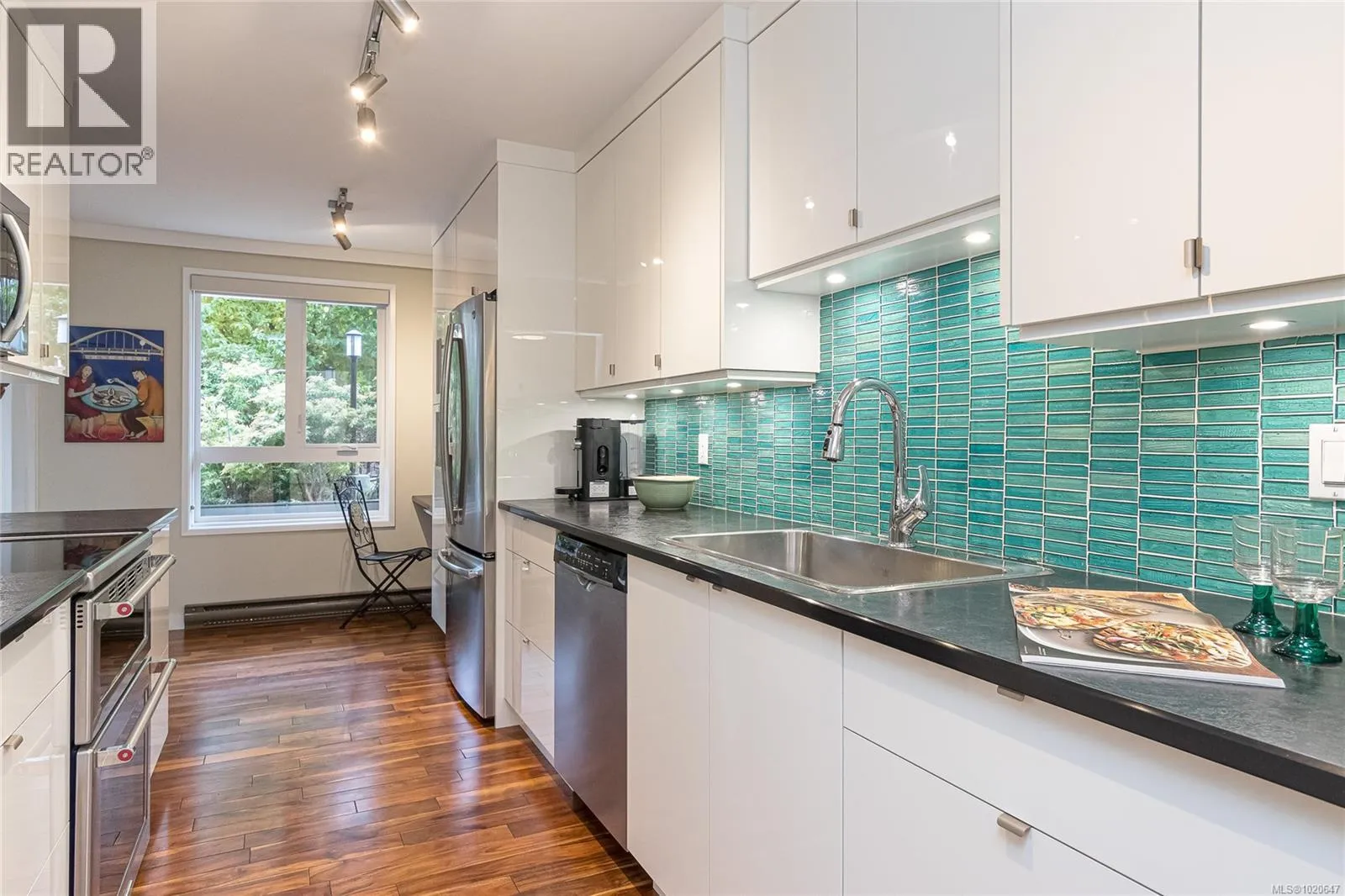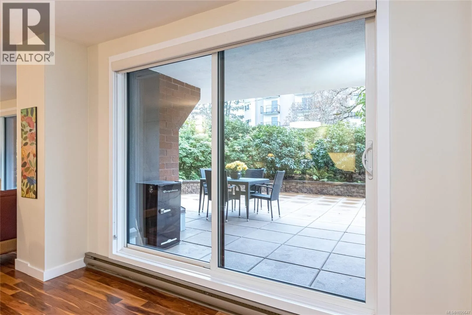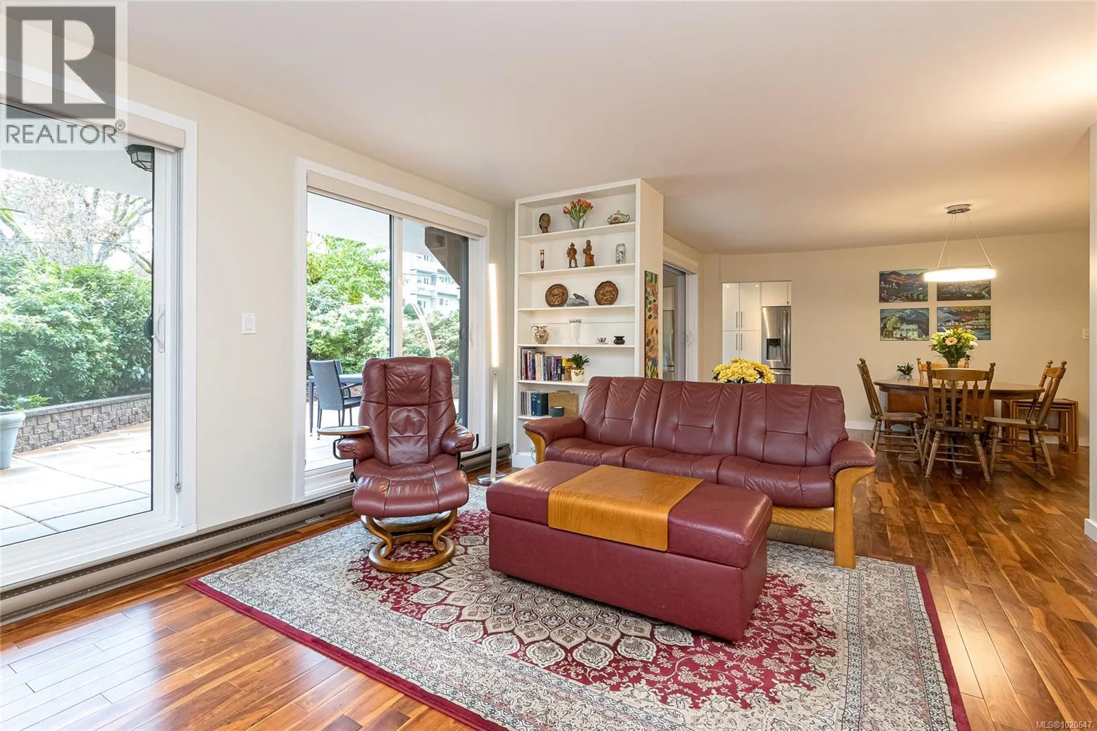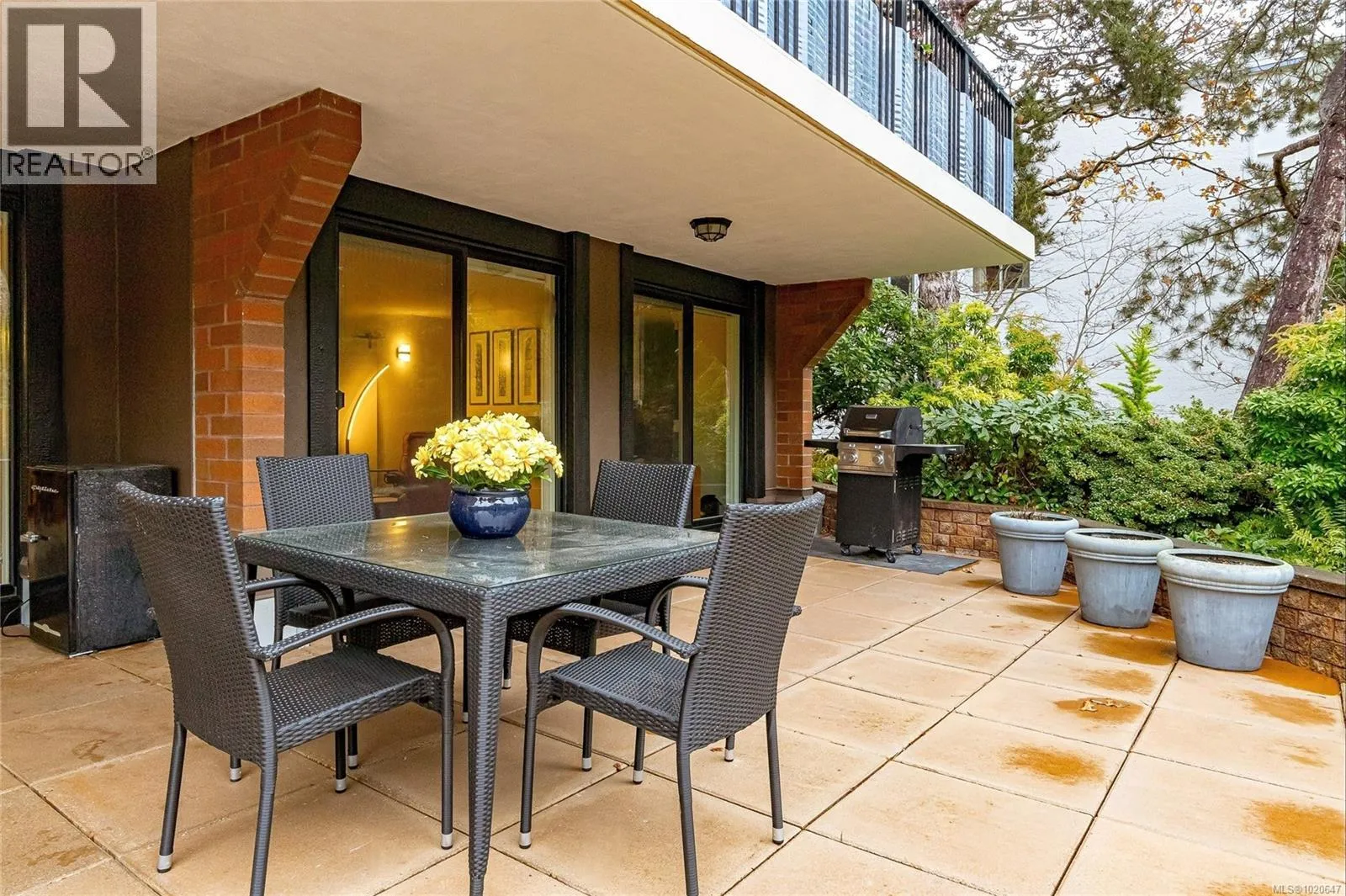 Beautiful sunny two bedroom condo steps from Oak Bay Marina and Oak Bay Village. Over 1300 sq ft of comfortable living space plus over 700 sq ft of private outdoor patio living space with southwest exposure. Spacious open floor plan with living room, dining room and office area separated by sliding panels. Modern kitchen complete with plenty of storage and desk. Primary bedroom boasts two closets plus wall to wall built in storage, second bedroom includes a large walk in closet. Enjoy sunny afternoons relaxing or entertaining with your own huge patio oasis. Walk between inside and patio area through three separate sliding glass doors plus kitchen door. Numerous new windows and sliding doors bring the outside into this bright and sunny unique main floor unit. Hardwood floors throughout, upgraded cabinetry and new in unit washer and dryer. Steel and concrete building with underground parking, secure storage, meeting room and hobby workshop. Unbeatable location for your fabulous new home! (id:27476)