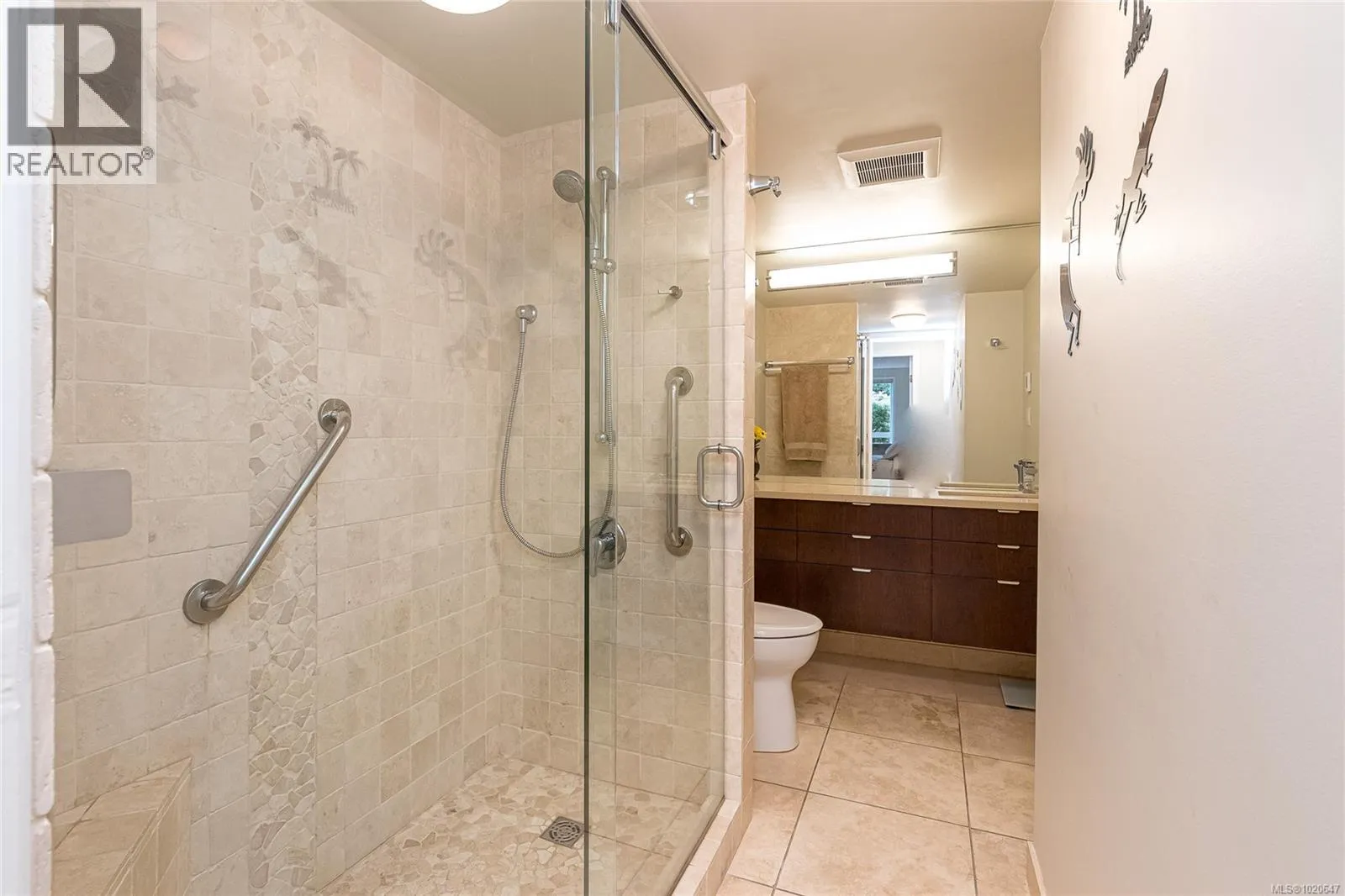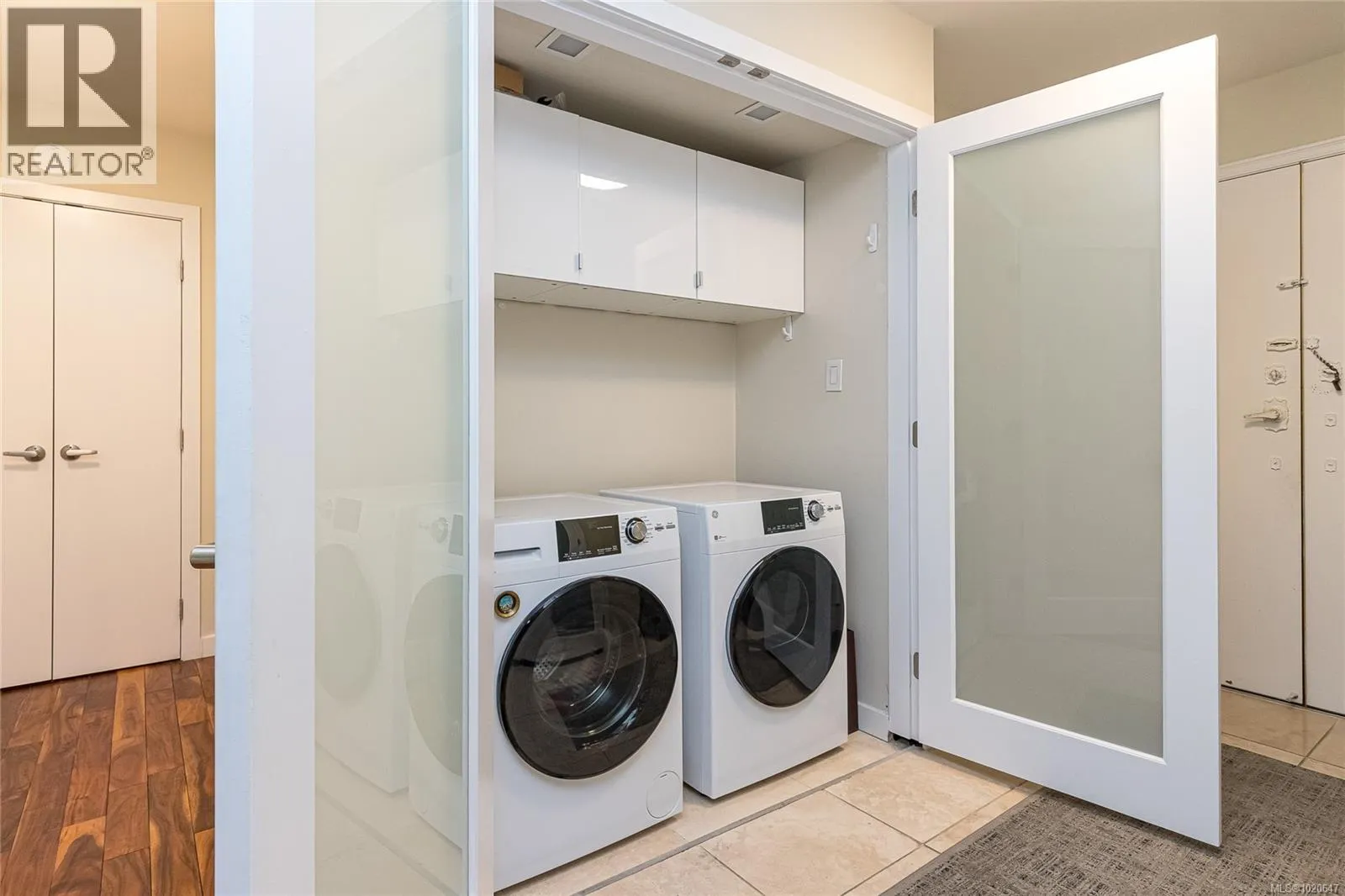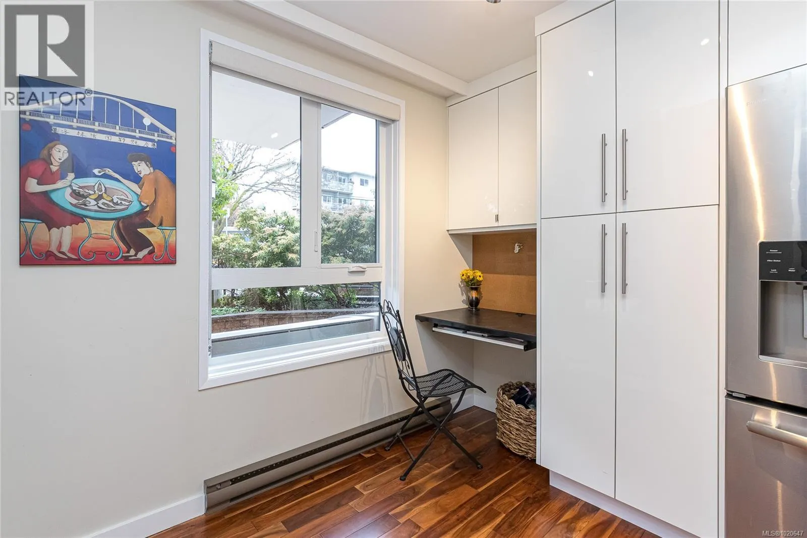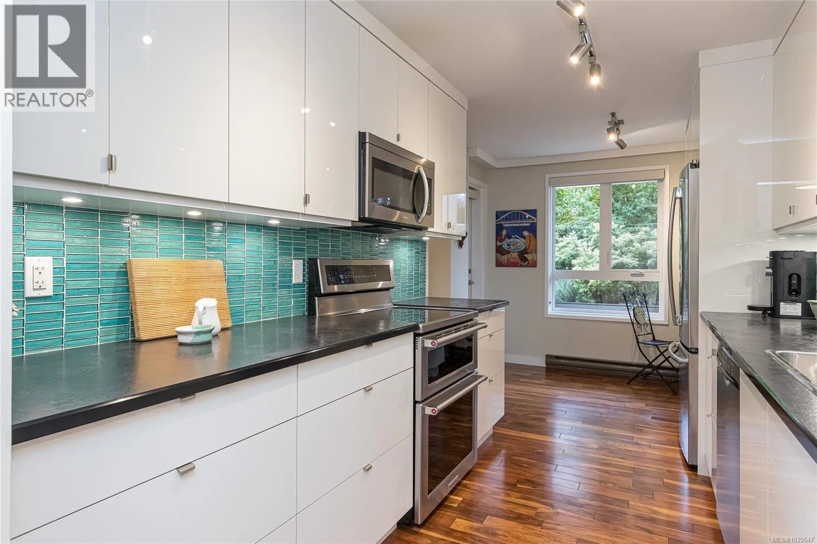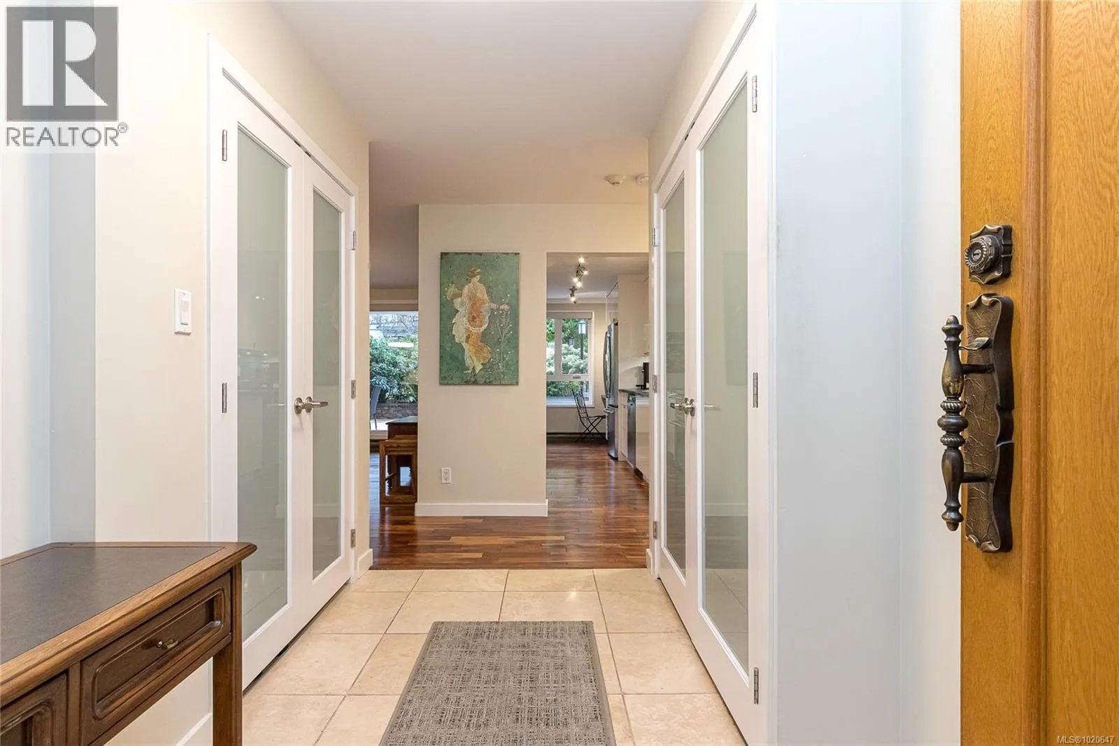 Beautiful sunny two bedroom condo steps from Oak Bay Marina and Oak Bay Village. Over 1300 sq ft of comfortable living space plus over 700 sq ft of private outdoor patio living space with southwest exposure. Spacious open floor plan with living room, dining room and office area separated by sliding panels. Modern kitchen complete with plenty of storage and desk. Primary bedroom boasts two closets plus wall to wall built in storage, second bedroom includes a large walk in closet. Enjoy sunny afternoons relaxing or entertaining with your own huge patio oasis. Walk between inside and patio area through three separate sliding glass doors plus kitchen door. Numerous new windows and sliding doors bring the outside into this bright and sunny unique main floor unit. Hardwood floors throughout, upgraded cabinetry and new in unit washer and dryer. Steel and concrete building with underground parking, secure storage, meeting room and hobby workshop. Unbeatable location for your fabulous new home! (id:27476)