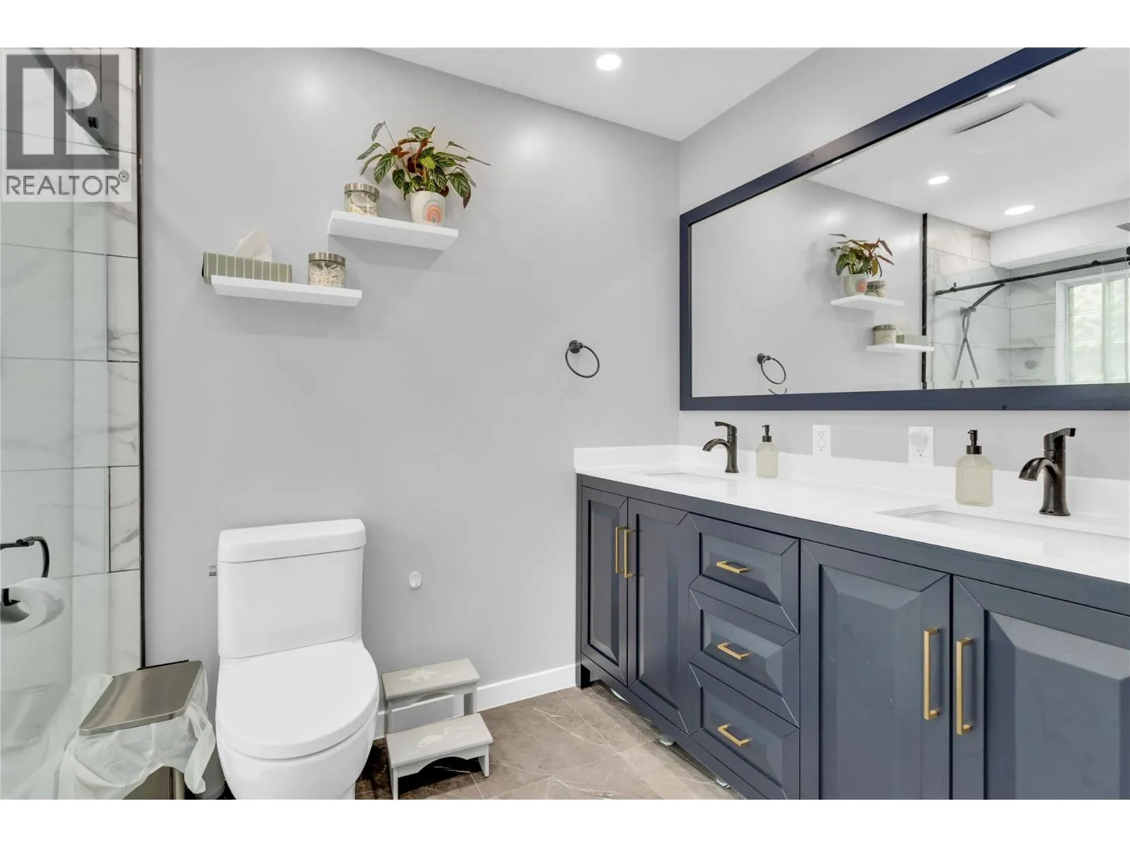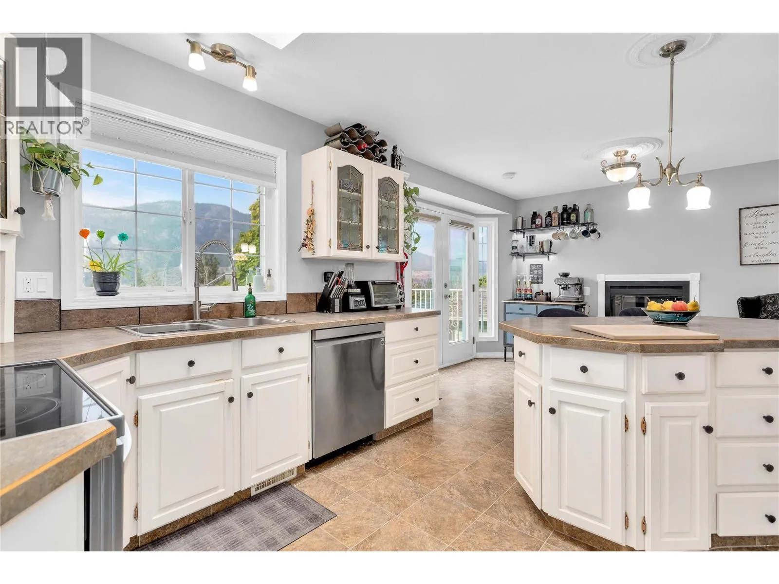 Welcome to this charming family home in Okanagan Falls! Nestled in a peaceful cul-de-sac with no through traffic, this private property offers stunning mountain views and glimpses of the lake. The home features 3 bedrooms on the upper level, including a primary suite with a newly updated bathroom and walk-in closet. A separate full bathroom serves the additional bedrooms. The spacious living area and bright kitchen are true highlights â the kitchen boasts an island and direct access to a balcony with mountain views. Skylights and windows throughout the upper level fill the home with natural light. The lower level includes a versatile in-law suite with 1 bedroom, 1 bathroom, and separate laundry, while the double garage leads into a mudroom with a den and main laundry. Enjoy the private backyard with no homes above, ideal for outdoor living. A rare find in a sought-after location, offering comfort, functionality, and breathtaking views. (id:27476)