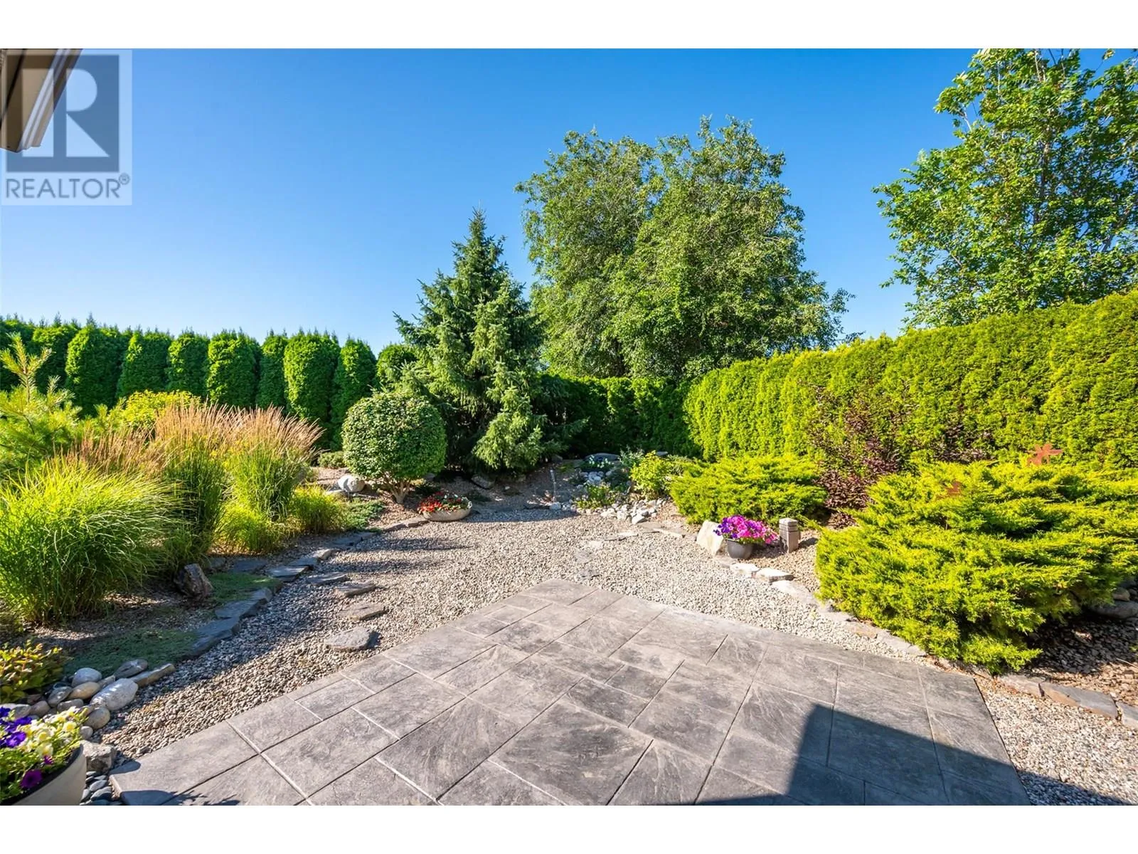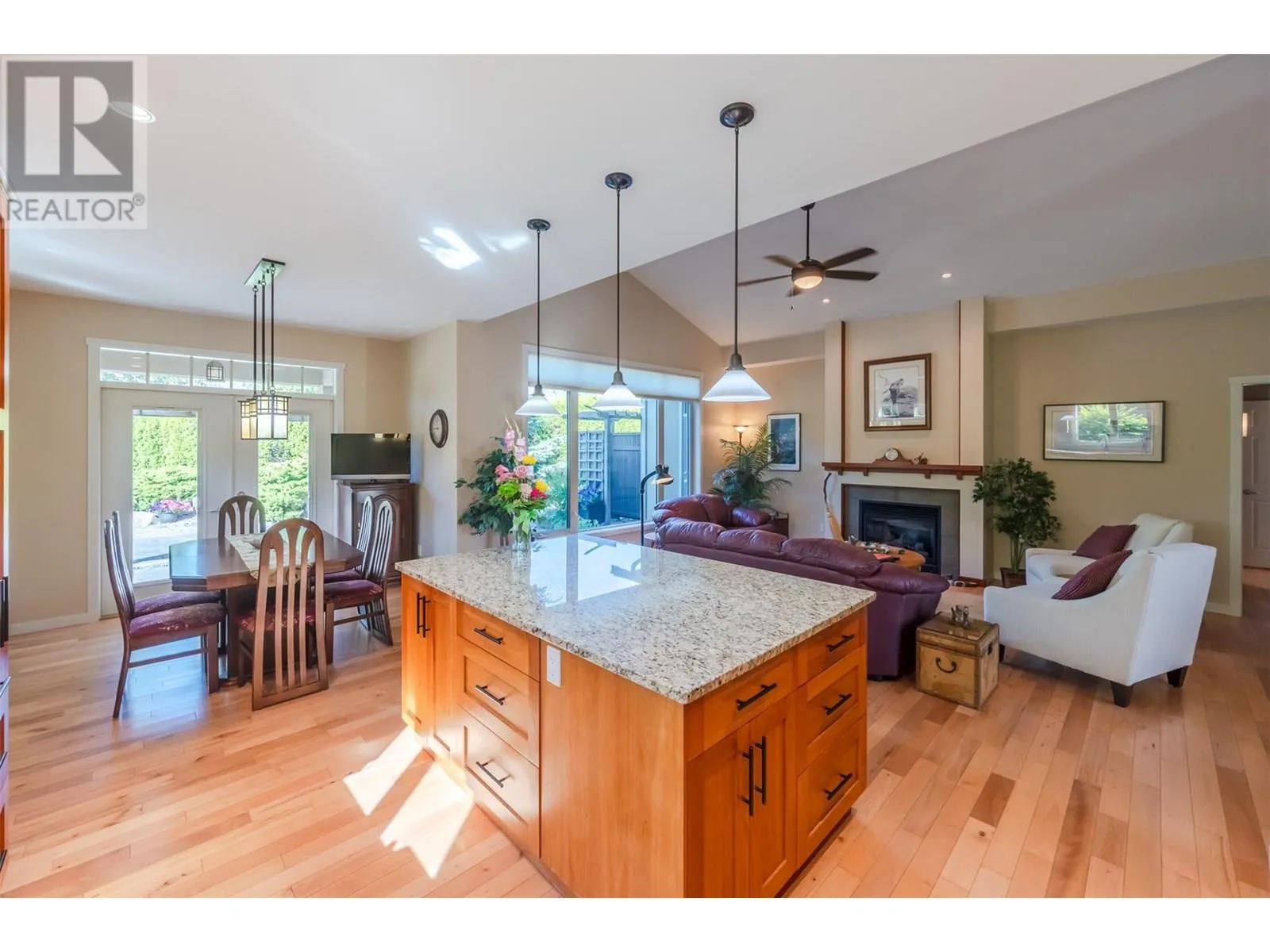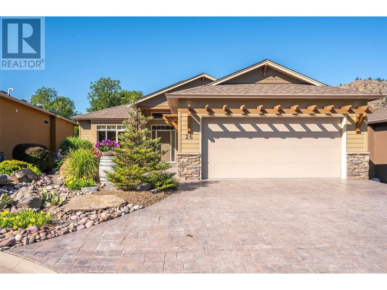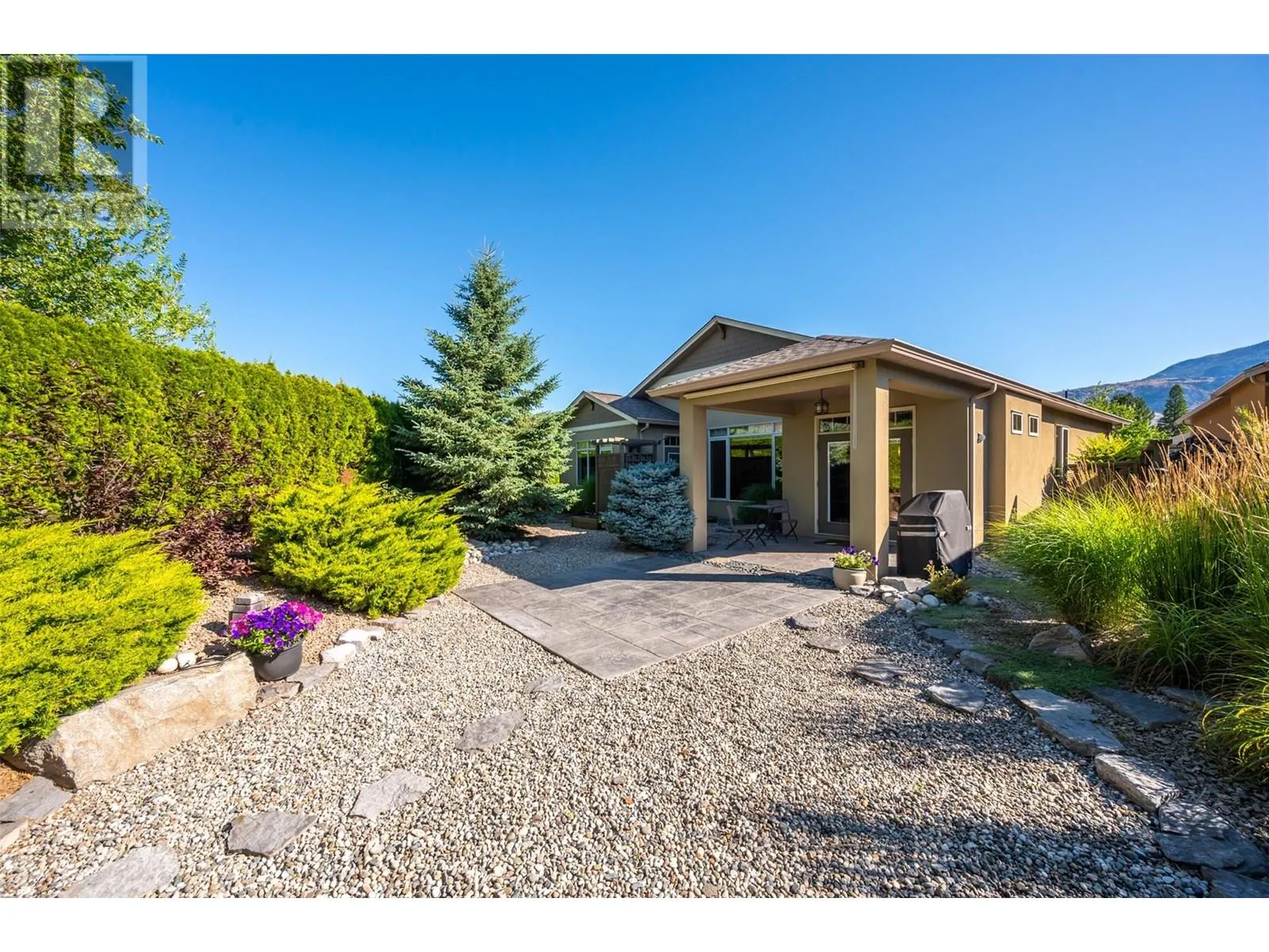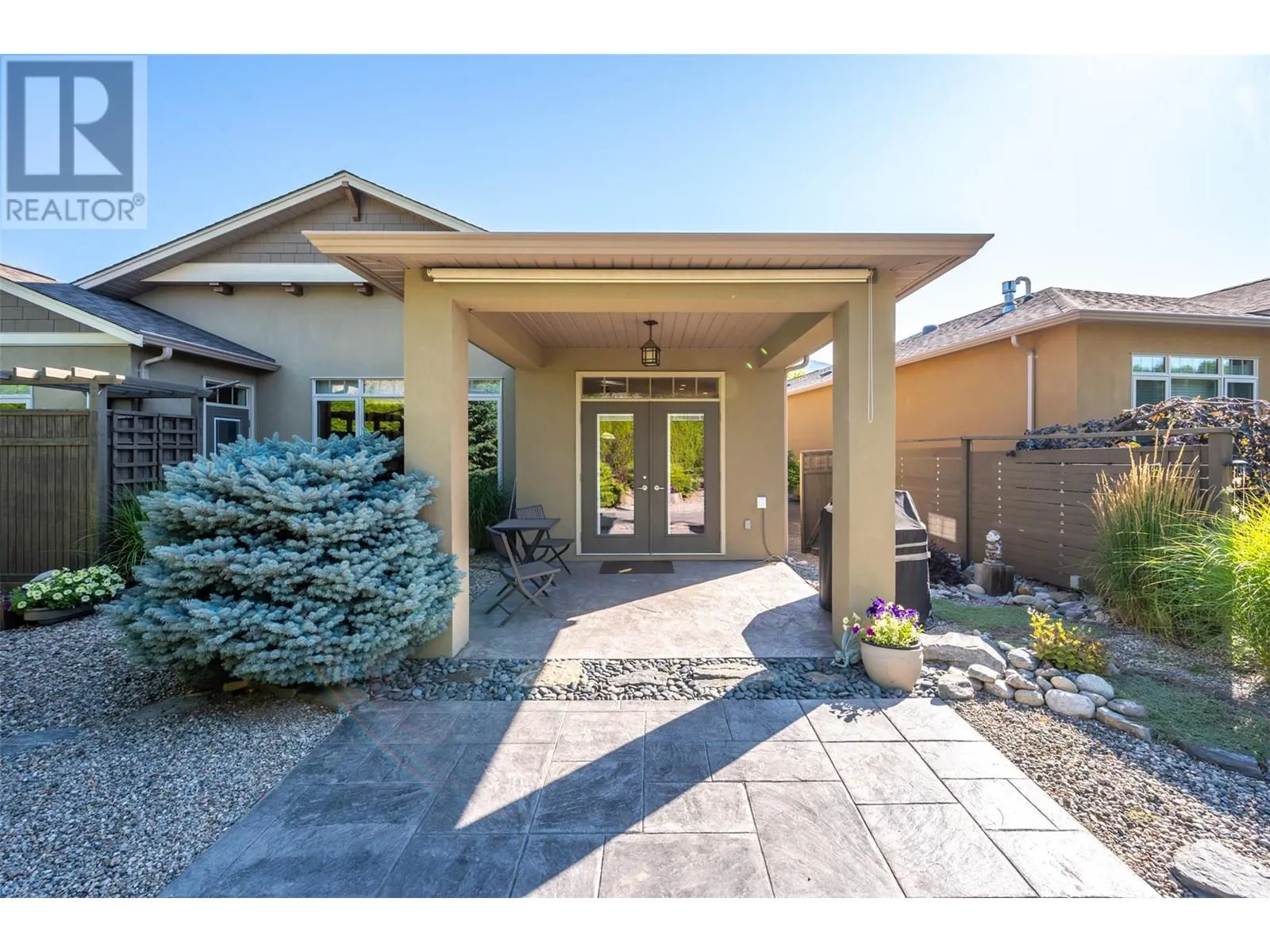 Welcome to Arbour Crest, a sought-after 55+ gated community known for its exceptional quality and beautifully maintained grounds. This stunning 2-bedroom plus den rancher offers easy one-level living with vaulted ceilings and an open-concept layout. The spacious kitchen features quartz countertops, a large island, and flows effortlessly into the dining and living areas, complete with a cozy gas fireplace. The primary suite is a true retreat with double French doors to your private backyard, a large walk-in closet, double vanities, and a walk-in shower. The versatile den makes a perfect office, TV room, or could easily be converted into a third bedroom. The guest bedroom enjoys its own private âwingâ with full bathâideal for visitors or extended stays. Outside, enjoy low-maintenance xeriscape landscaping, a large stamped concrete patioâperfect for entertaining or adding a hot tubâand an oversized driveway on a pie-shaped lot that offers added space and privacy. This home combines comfort, style, and smart design in a quiet, secure community just minutes from golf, shopping, lake access, and downtown Oliver. Low strata fees and well maintained grounds and home make this the perfect move in ready retirement ""dream home"". (id:27476)