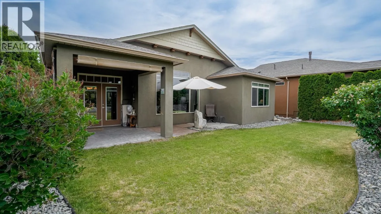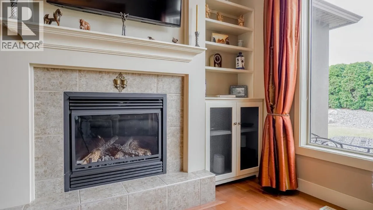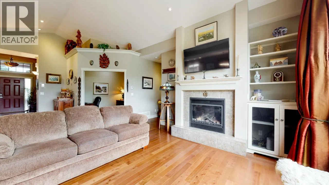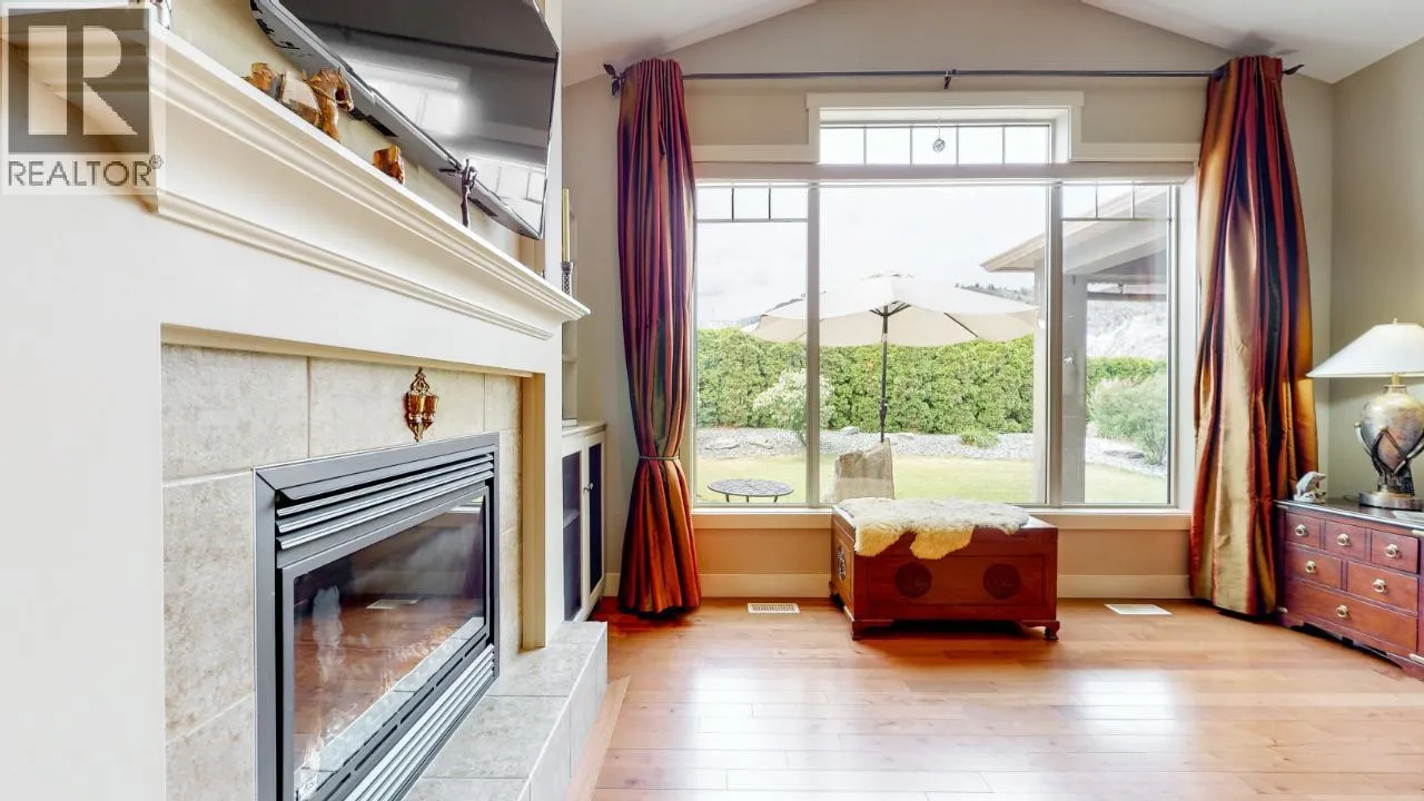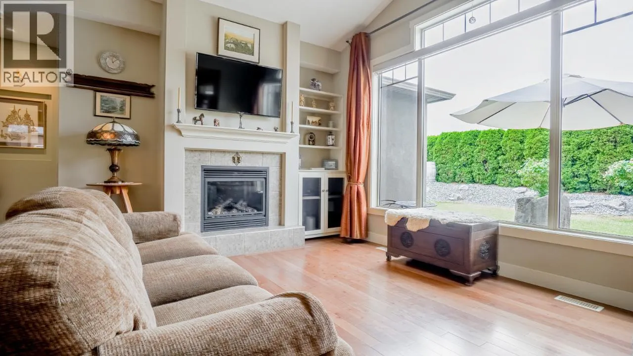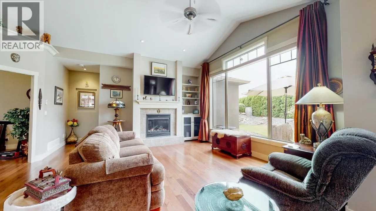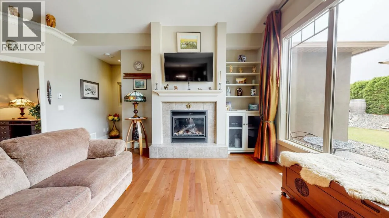 Welcome to Arbor Crest, a highly sought-after 55+ gated community! This beautiful 2 Bedroom + Den, 2 Bath Rancher offers over 1,600 sq ft of quality, custom finishes along with a double garage & private yard. Step inside the roomy foyer to a bright, open great room featuring vaulted ceilings, large windows, hardwood floors & a cozy gas fireplace. The stunning kitchen boasts gorgeous quartz counters, undermount sink, new fridge & stove, elegant taps & a large island perfect for entertaining. Enjoy custom blinds, including sunshades, and French doors with phantom screens leading to a tranquil backyard oasis. Relax on the covered, stamped concrete patio with gas BBQ hook-up, surrounded by privacy hedging & breathtaking sunsets. The back yard was refreshed with new soil & lush green lawn in 2024, along with a new retaining wall on the north side. Spacious primary suite includes an impressive 5-pce ensuite with quartz counters, dual sinks, soaker tub, shower, heated tile floors & walk-in closet. A bright second bedroom sits near a full 3-pce bath, while the French-doored den offers flexible living space. Additional features include a laundry/mudroom with sink, immaculate garage with storage & mounted TV, solar tubes, water softener, central vac & A/C. Beautifully landscaped with U/G irrigation. Low bare-land strata fee $175/mth. Pet-friendly (2 allowed), min. 3-month rentals. Ideally located near the riverfront trail, beach, golf & amenities. Book your private showing today! (id:27476)