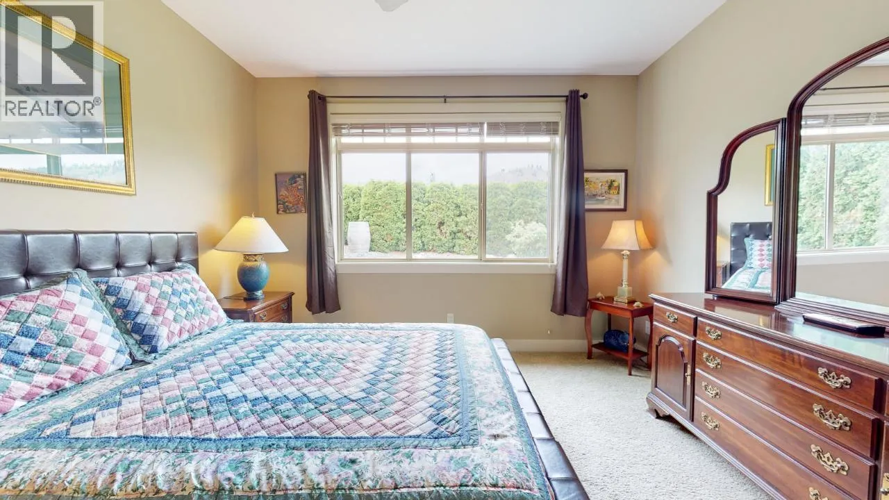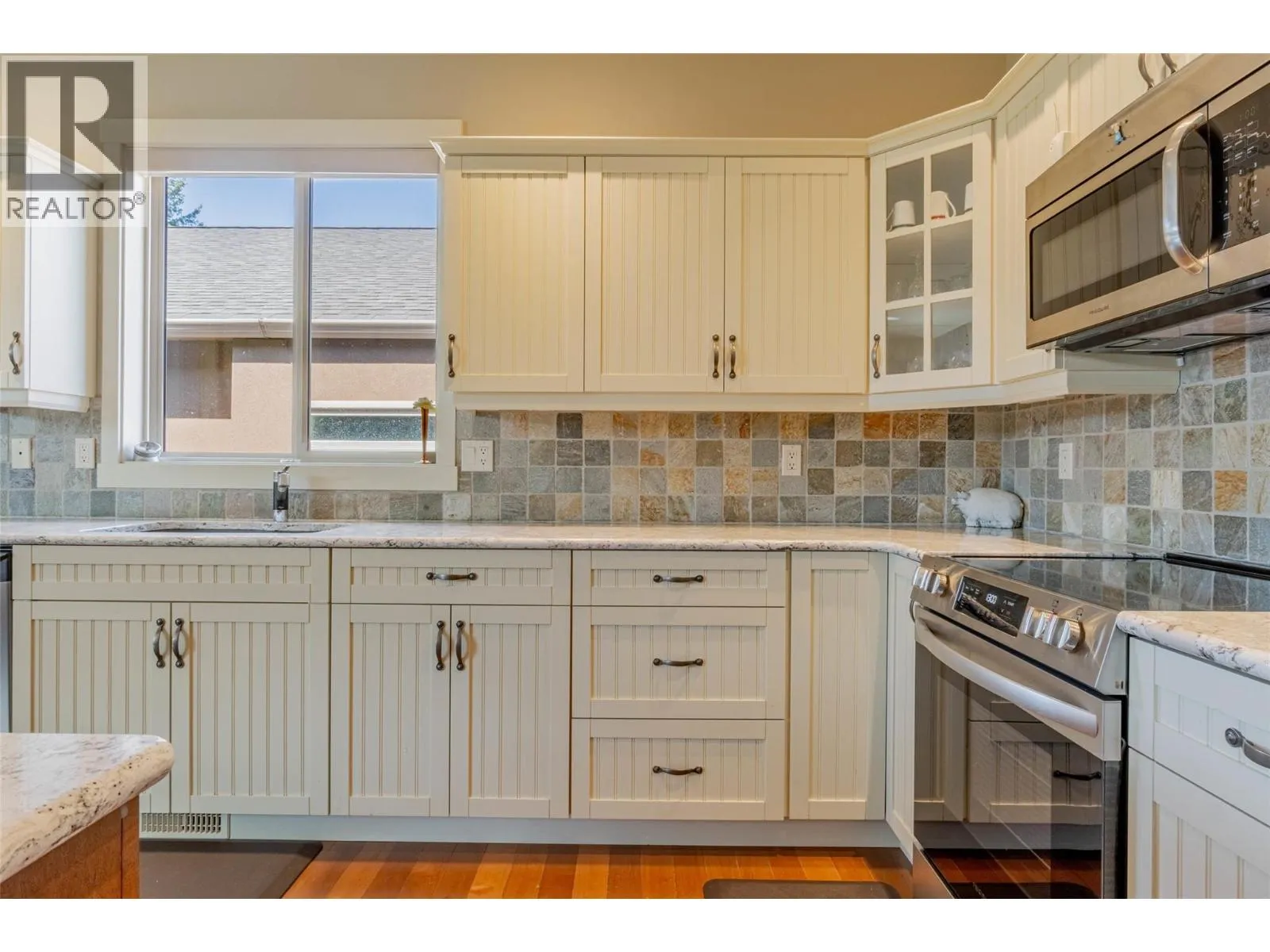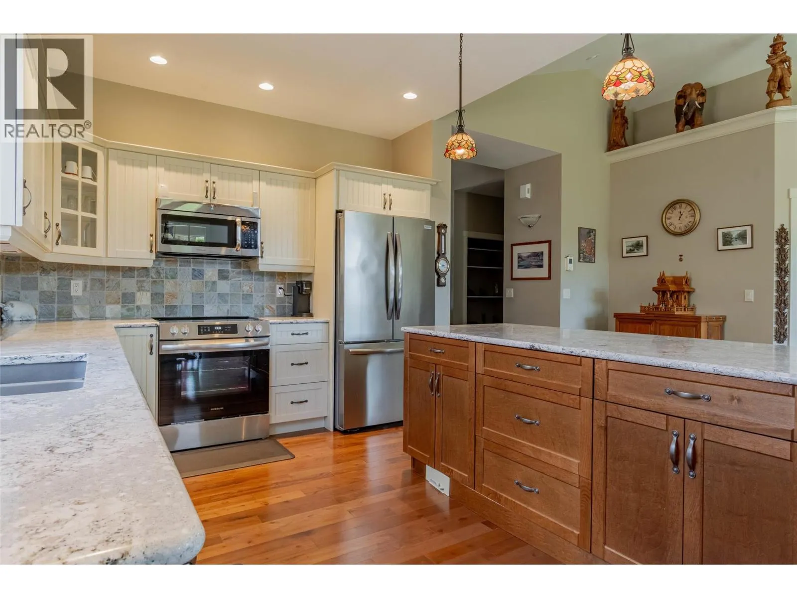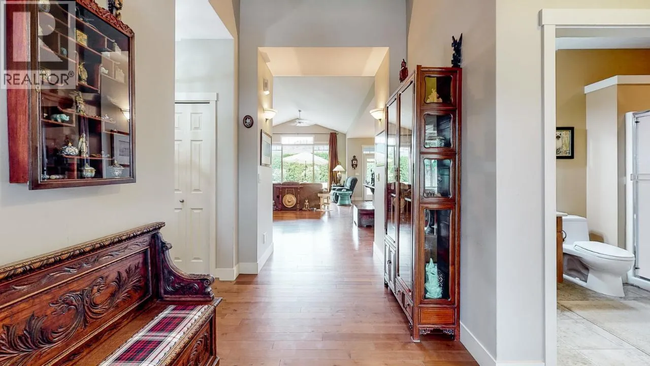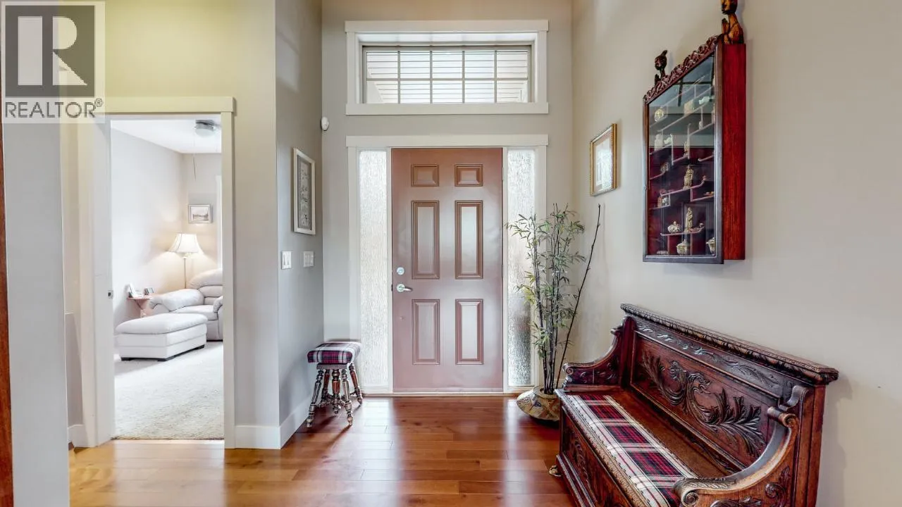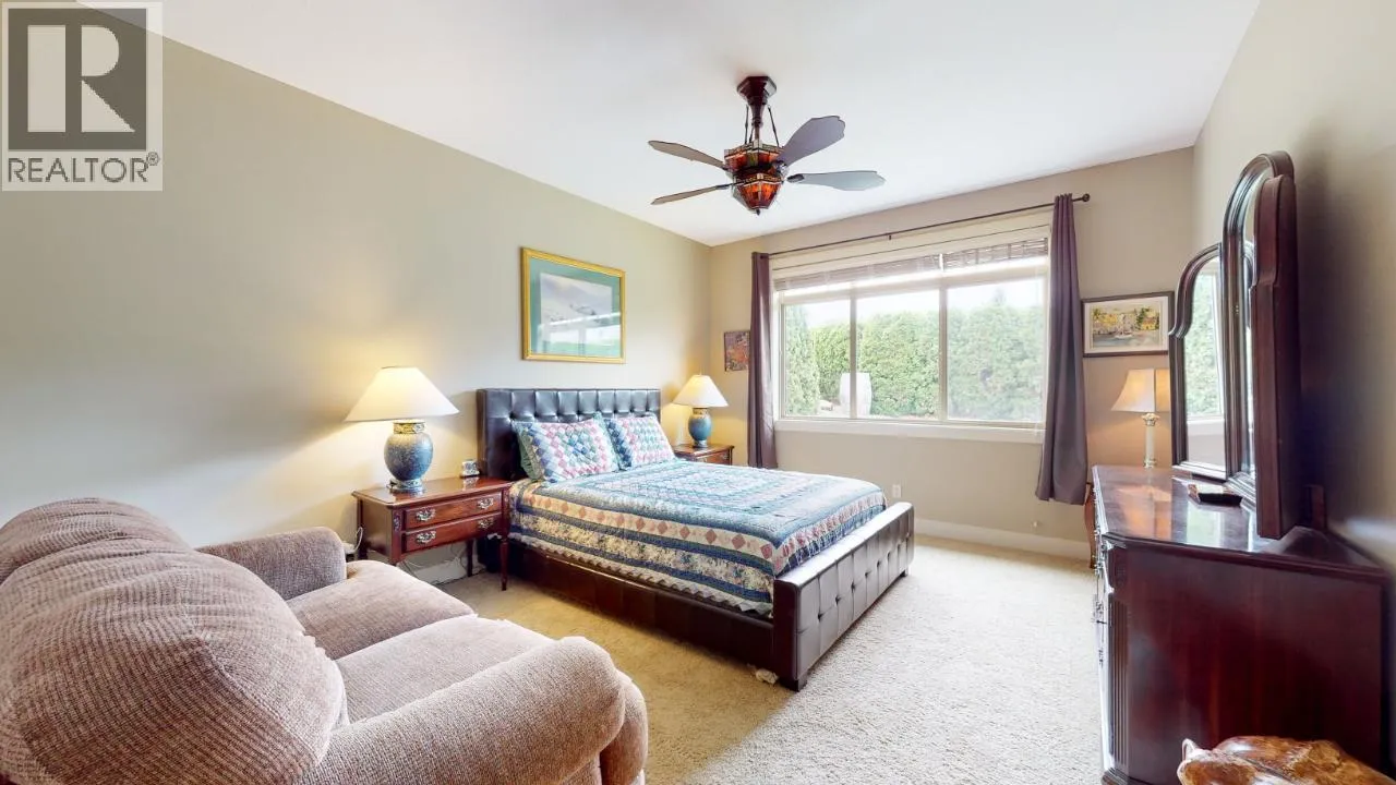 Welcome to Arbor Crest, a highly sought-after 55+ gated community! This beautiful 2 Bedroom + Den, 2 Bath Rancher offers over 1,600 sq ft of quality, custom finishes along with a double garage & private yard. Step inside the roomy foyer to a bright, open great room featuring vaulted ceilings, large windows, hardwood floors & a cozy gas fireplace. The stunning kitchen boasts gorgeous quartz counters, undermount sink, new fridge & stove, elegant taps & a large island perfect for entertaining. Enjoy custom blinds, including sunshades, and French doors with phantom screens leading to a tranquil backyard oasis. Relax on the covered, stamped concrete patio with gas BBQ hook-up, surrounded by privacy hedging & breathtaking sunsets. The back yard was refreshed with new soil & lush green lawn in 2024, along with a new retaining wall on the north side. Spacious primary suite includes an impressive 5-pce ensuite with quartz counters, dual sinks, soaker tub, shower, heated tile floors & walk-in closet. A bright second bedroom sits near a full 3-pce bath, while the French-doored den offers flexible living space. Additional features include a laundry/mudroom with sink, immaculate garage with storage & mounted TV, solar tubes, water softener, central vac & A/C. Beautifully landscaped with U/G irrigation. Low bare-land strata fee $175/mth. Pet-friendly (2 allowed), min. 3-month rentals. Ideally located near the riverfront trail, beach, golf & amenities. Book your private showing today! (id:27476)