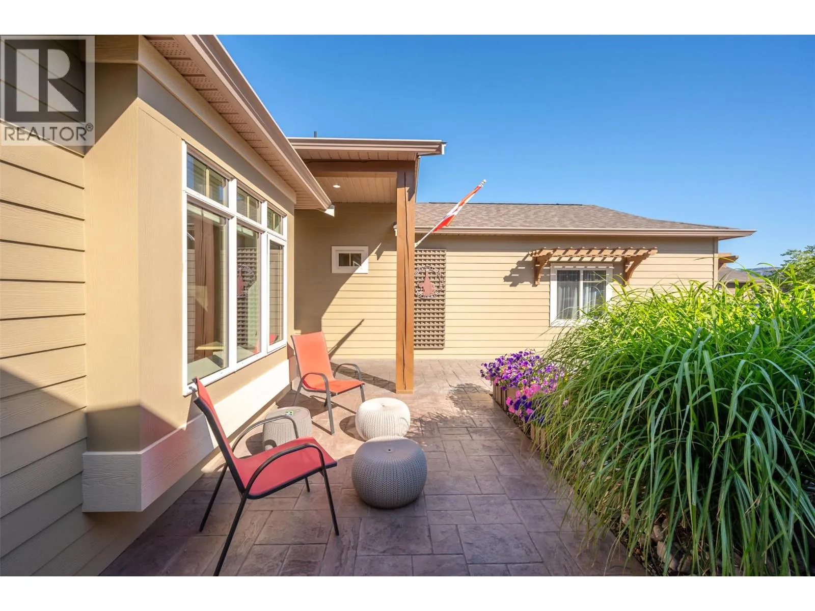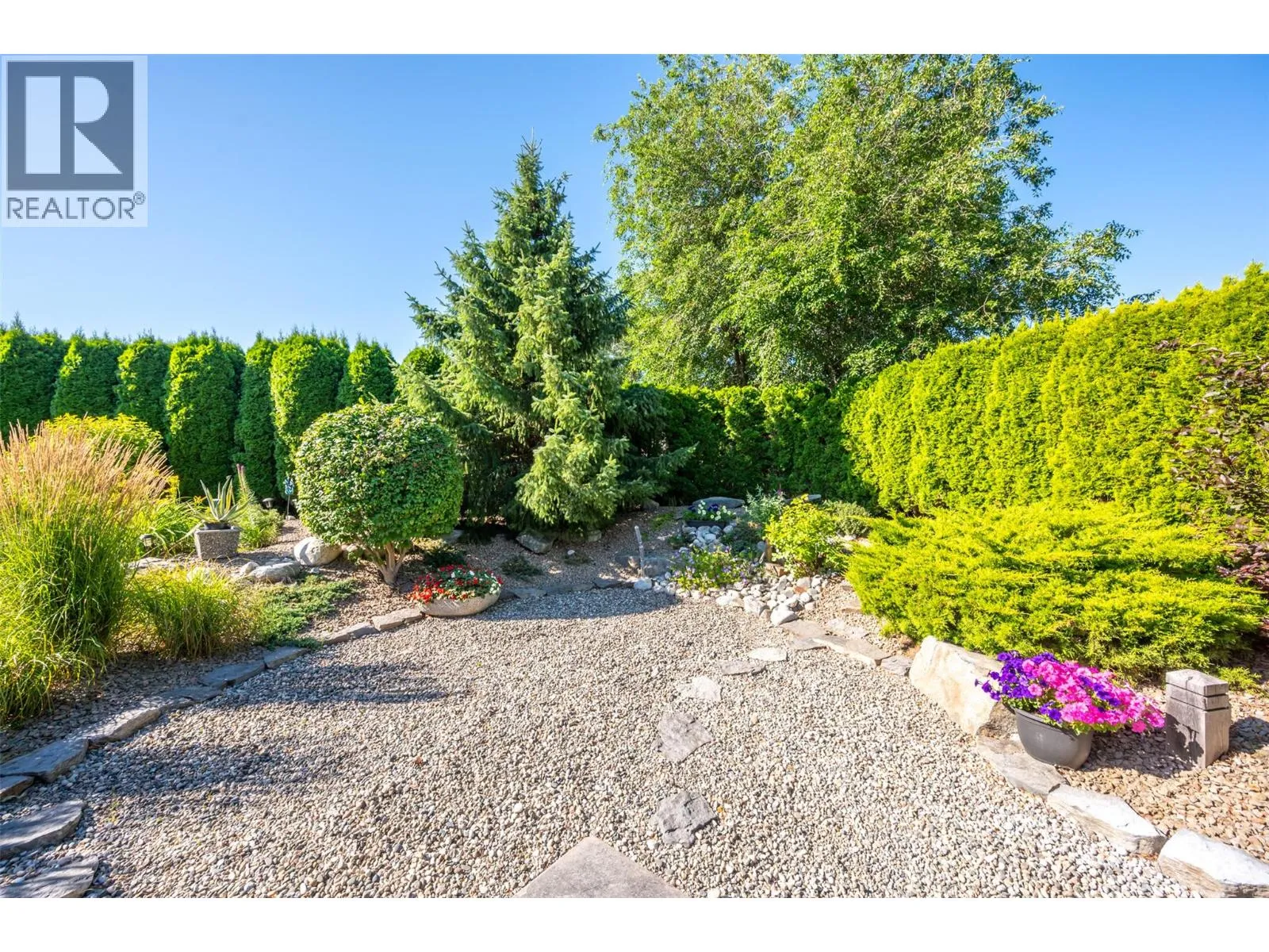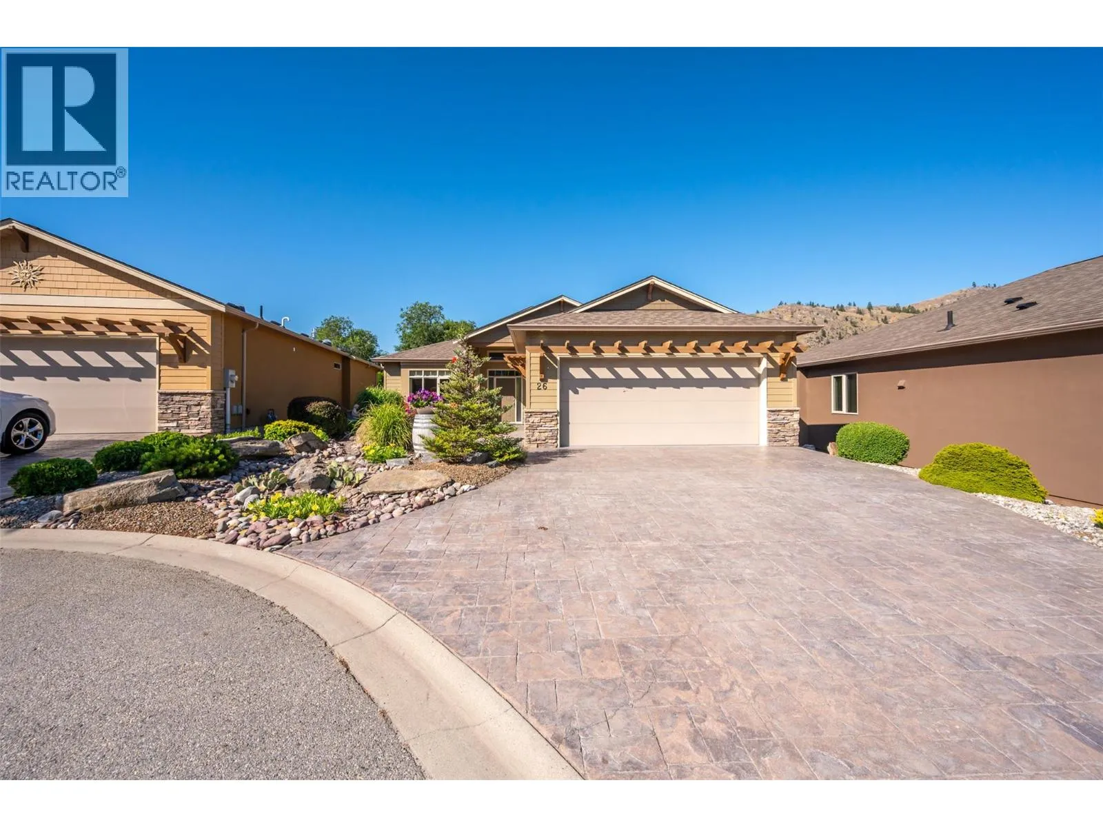 Arbour Crest is a sought-after 55+ gated community offering carefree, lock-and-leave living in a beautifully maintained setting. This stylish 2-bedroom plus den rancher features easy one-level living with vaulted ceilings and a bright, open-concept design. The kitchen boasts quartz countertops, a large island, and flows seamlessly into the dining and living areas, complete with a cozy gas fireplaceâperfect for relaxed entertaining. The primary suite is a private retreat with French doors to the backyard, walk-in closet, double vanities, and walk-in shower. A flexible den offers space for a home office, TV room, or potential third bedroom, while the guest bedroom enjoys its own private wing with full bathâideal for visitors. Outdoor lovers will enjoy the low-maintenance xeriscape landscaping including a dry riverbed feature, a spacious stamped concrete patio for outdoor living or a hot tub (wiring and pad ready to go), tasteful landscaped pie shaped lot (one of the larger lots) with private backyard. The generous driveway offers parking for multiple cars while use of the double garage for cars or storage give you plenty of flexibility. With low strata fees and a prime location just minutes from golf courses, shopping, lake access, and downtown Oliver, this move-in-ready home is perfect for active retirement living with peace of mind and convenience. (id:27476)