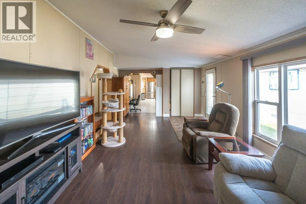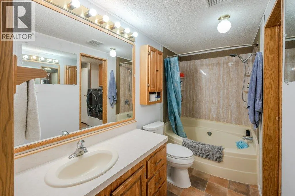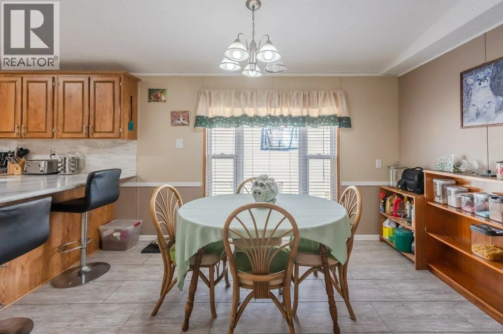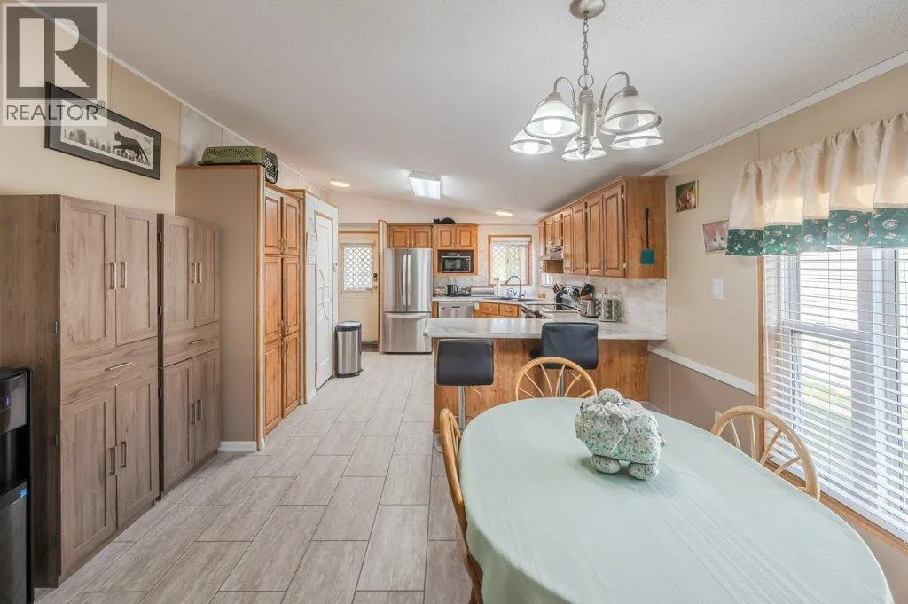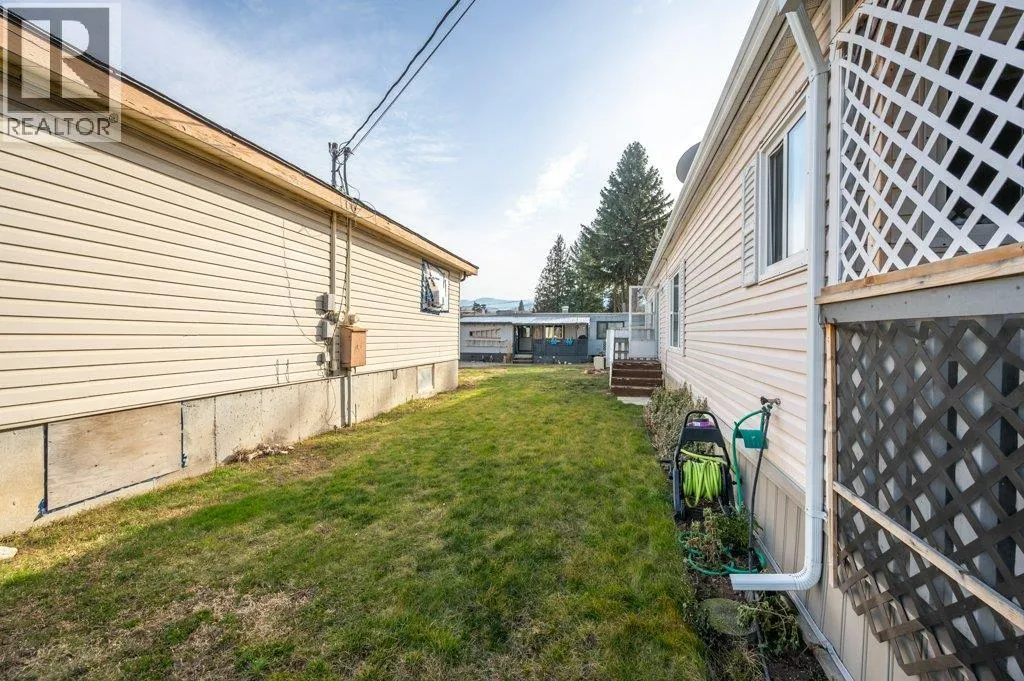 Welcome to perfect retirement living in Country Lodge! This large home boasts a spacious open layout featuring 3 bedrooms, 2 full bathrooms & laundry area. The vaulted ceiling adds to the grandeur of the living area & makes it feel even more spacious. You will love the bright & airy feel of this home, which is filled with natural light. The large kitchen is perfect for whipping up your favorite meals & features plenty of counter space & storage for all your cooking needs. Stainless steel appliances with newer fridge, beautiful stone backsplash & deep corner sink. Flooring is a mix of tile, laminate & hardwood in the main bedroom. Generous sized bedrooms, and primary bedroom has the convenience of a 4-piece ensuite. Large laundry room with new washer & dryer and room for a small freezer. Added features include a new A/C unit and upgraded metal roof. Enjoy your morning coffee or watch the sunset from the covered front porch, enclosed for a pet but can be opened up to enhance your view. The low maintenance yard is perfect for those who want to enjoy outdoor living without extensive upkeep. Two outdoor storage sheds included. Electrical inspection completed for peace of mind. Country Lodge welcomes age 55+ and one small indoor pet. Owner occupied only, no rentals permitted. Pad rent is only $500/mth and includes sewer, water & garbage. Located close to recreation, golf, wineries, shopping & town amenities. Make your move to affordable living in the beautiful South Okanagan! (id:27476)