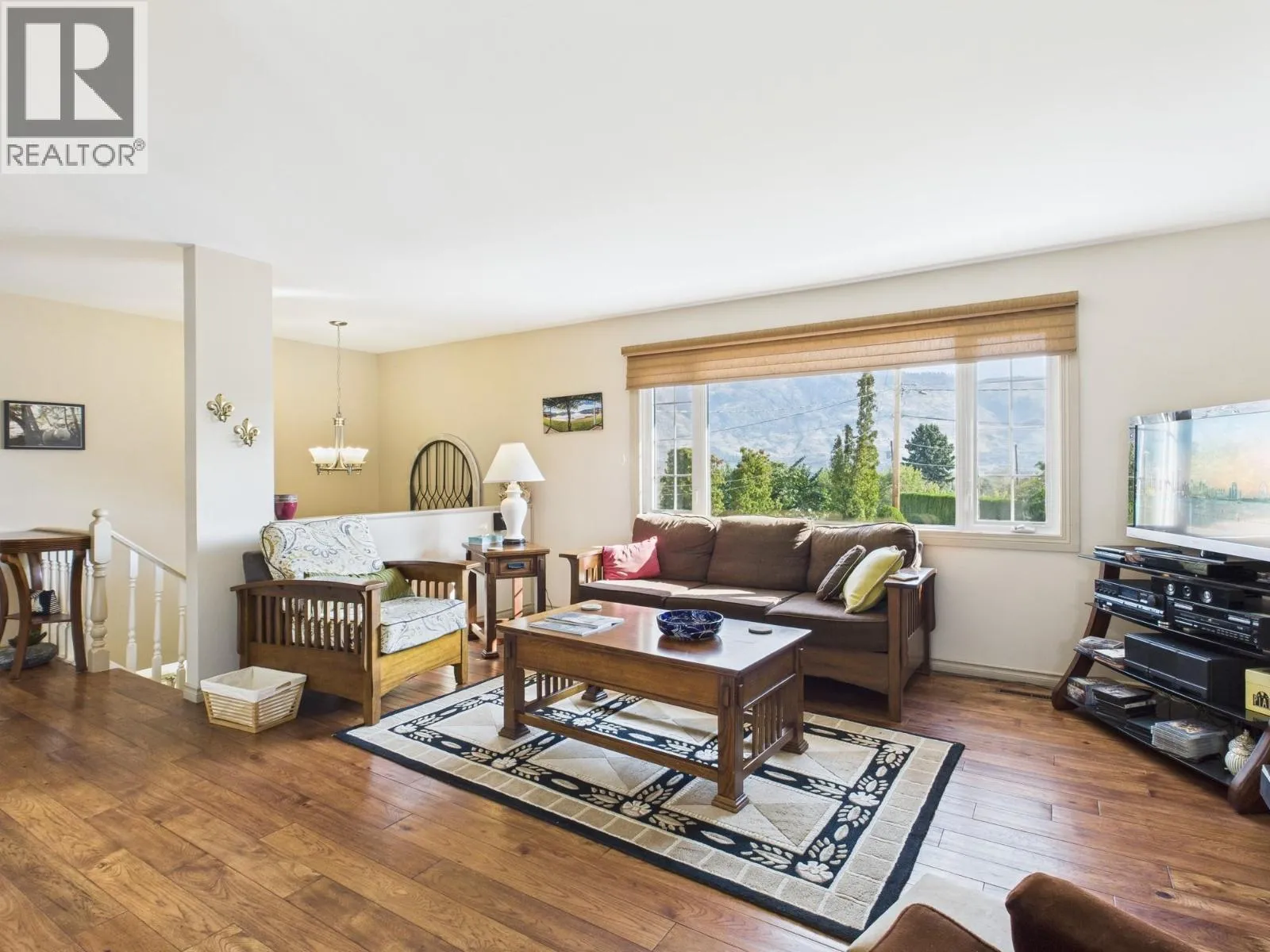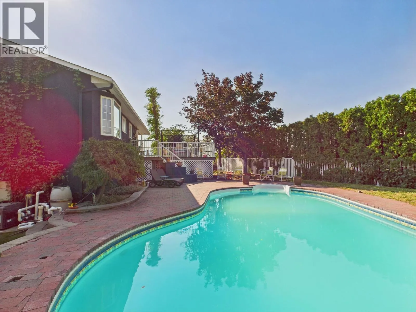 This 4 bedroom home offers easy Okanagan living. Upstairs you'll find 3 bedrooms, primary with 2 piece ensuite. The living room showcases a gas fireplace & lakeview. The kitchen has been opened to the living area for inclusive entertaining and the dining area opens to a family size deck overlooking the inground pool, accented with brick surround. The lower level is perfect for extended family featuring 3 piece bathroom, spacious bedroom & recroom for family movie nights. Nothing to do in this home but move the family in. Perfectly located to walk to all amenities: elementary or high school, shopping, park & rec centre. Long driveway to accomodate offers much parking & room for your RV. Call today to view. Measurements to be verified if important. (id:27476)