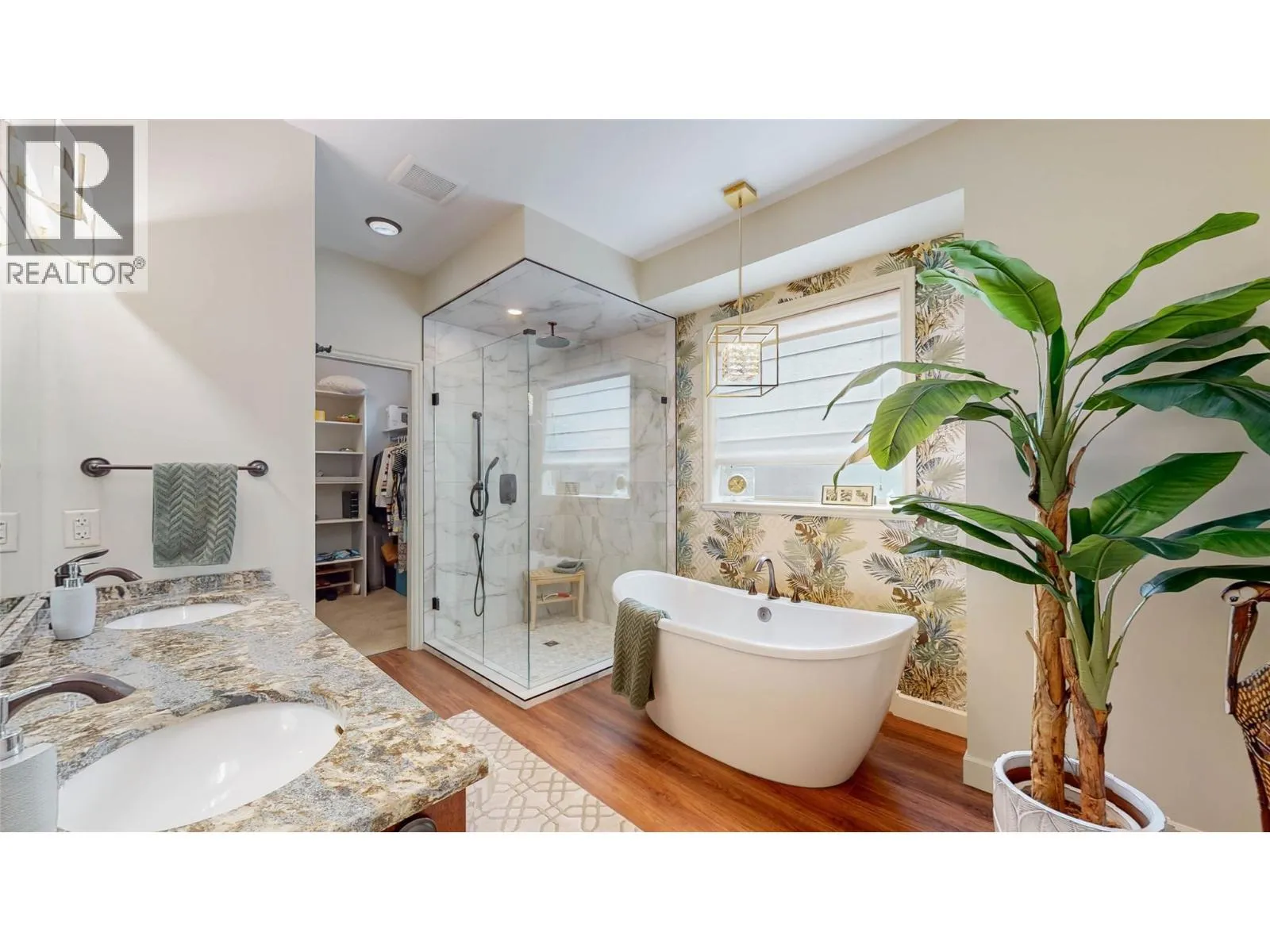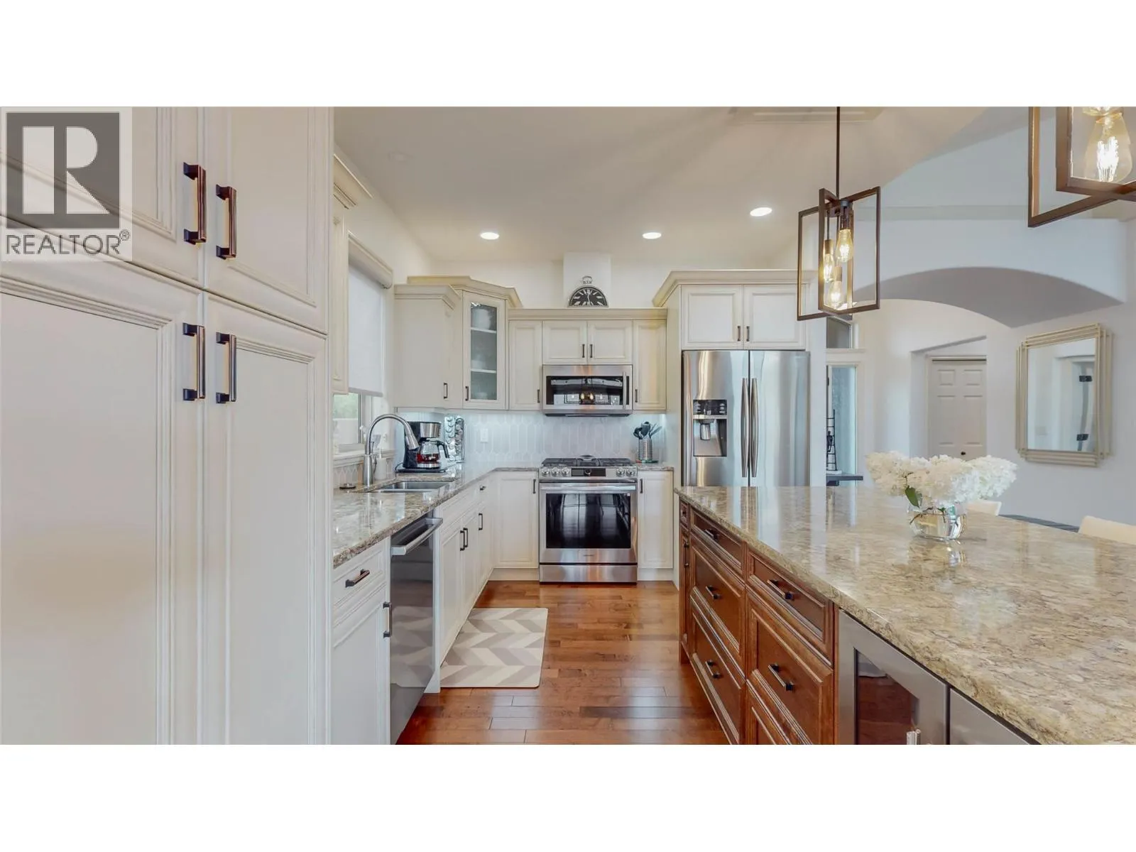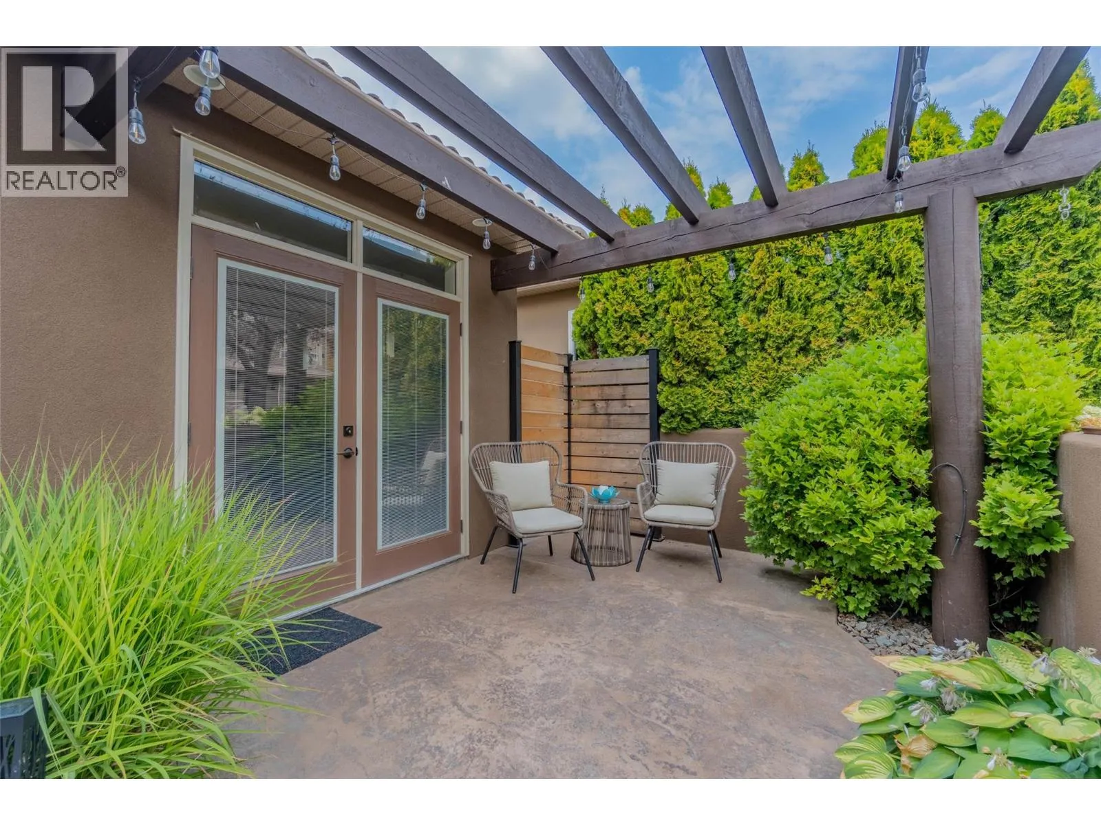 A study in âCasual Eleganceâ was the vision for this renovation. Welcome to #4 in Sonora Ridge an executive gated community on the East Bench of Osoyoos, just a short walk from the lake and minutes from Downtown. The main level features an open living space with custom cabinetry, gas fireplace, vaulted ceilings and oversized windows showcasing stunning mountain views and a glimpse of the lake. The chefâs kitchen includes custom cabinetry, a large island, granite countertops, pantry, and premium appliances including like-new gas range and 3-drawer dishwasher. Step from the dining area to a partially covered upper deck with an outdoor kitchen, dining space and lounging area protected by solar blinds. The primary suite offers a spa-like bath with a soaker tub, walk-in shower, and double sinks. The office includes custom shelving, a fireplace and French Doors leading to the courtyard. A spacious laundry room completes the main level with oversized appliances and ample storage. The lower level offers two bedrooms, full bathroom, kitchenette with dishwasher, a large family room and access to a private backyard with covered patio, gas fire-pit, artificial turf and space for games. Additional features include a gym, cold storage room and heated double garage with hot and cold water. (id:27476)