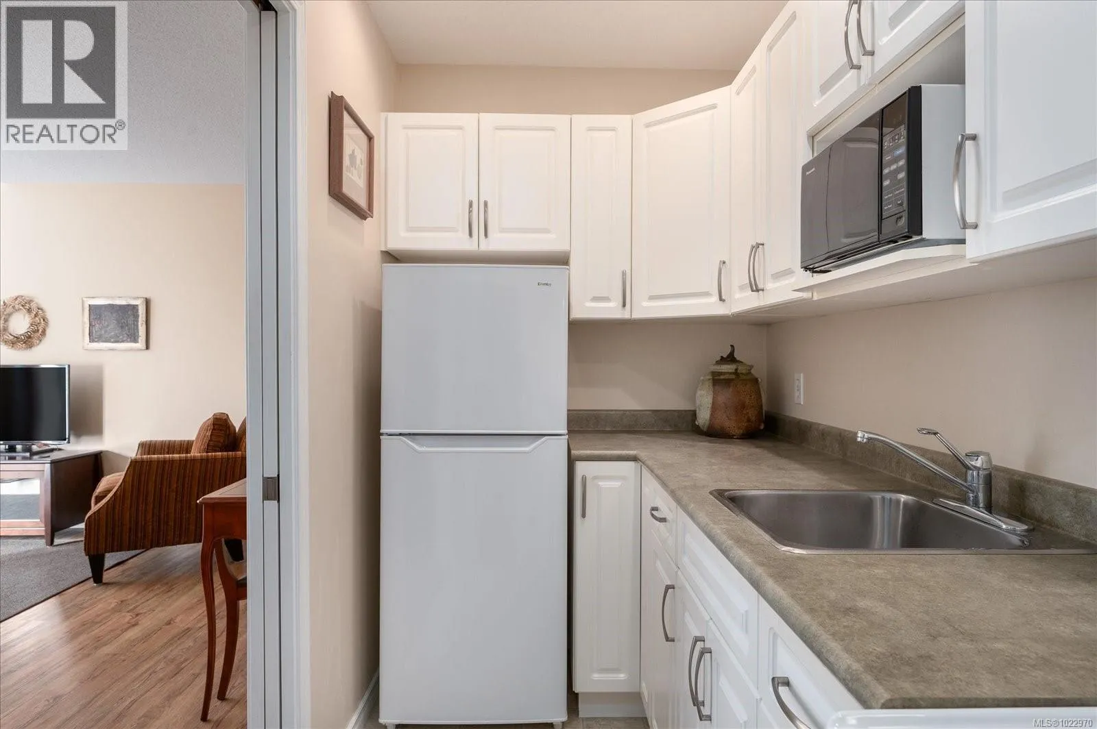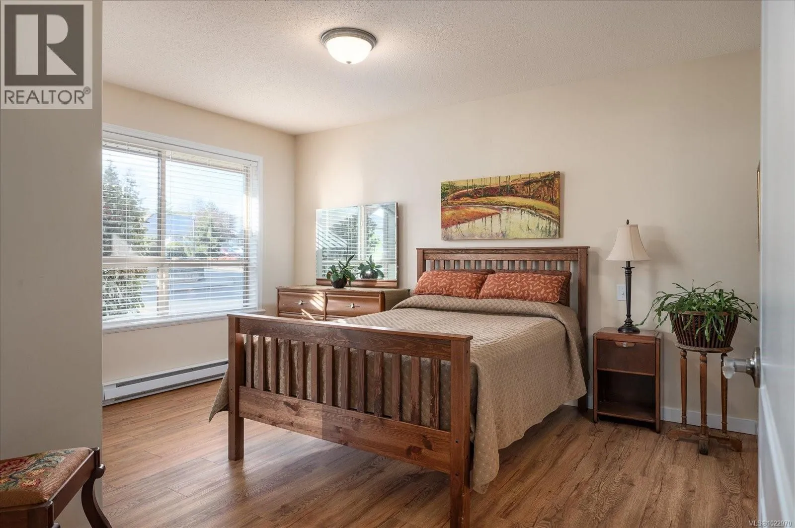 Bright and well designed south-facing patio home in the sought after Madison Court 55+ community. This rare 2 bedroom, 2 bathroom one-level residence offers open living with vaulted ceilings, large windows, and excellent natural light. Updated hot water tank, flooring, & window coverings. The layout supports aging in place with step-free living and flexible access. Enter through your own private south-facing patio or via the secured main entrance. Weekly light housekeeping & your linens laundered incl in maint fee. Laundry facilities (incl in fees) conveniently located just steps from the unit. Residents enjoy a shared community lounge with gas fireplace, space for puzzles or games, and a community garden. Well-maintained, non-smoking building. One small dog or cat permitted (see bylaws). A rare opportunity for low-maintenance living that balances independence, and optional community connection. (id:27476)