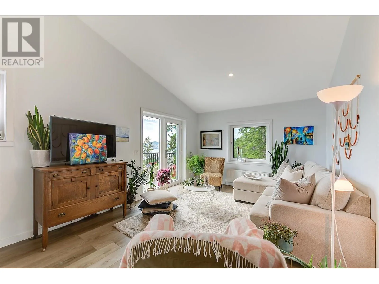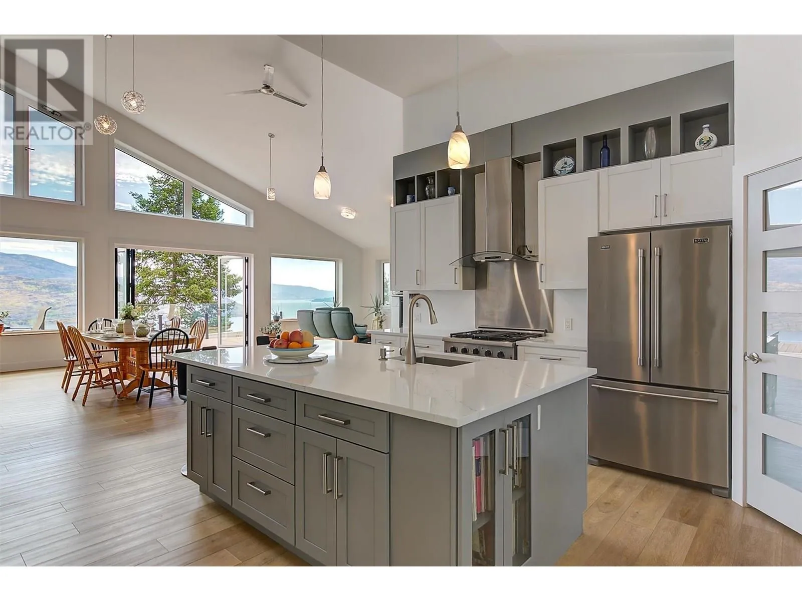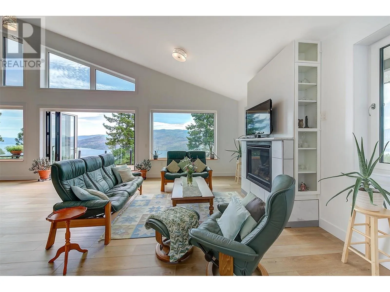 This 2019 owner-built home truly has the WOW factor and ticks all the right boxes. Perched on the hillside with stunning panoramic views of Okanagan Lake and the mountains, you can enjoy the breathtaking scenery from the spacious front deck or from inside the home. The bright, flexible, open-concept floor plan features soaring vaulted ceiling, a generous living room, and seamless flow into the dining area and beautifully appointed chefâs kitchen, complete with stainless steel appliances, quartz countertops, and a large islandâallowing you to organize and entertain your way. Three generously sized bedrooms, each with walk-in closets and private access to modern bathrooms, offer exceptional space and comfort for family or guests. Step outside to relax in the peaceful garden patio surrounded by nature or explore the nearby trail system, providing a quiet, private, and serene lifestyle. Adding versatility, the home includes a separate one-bedroom legal suite with its own entranceâideal for extended family, guests, or rental income. This high-performance home was owner-constructed to exceed the Building Code and is engineered to be fire-smart, wind-resistant, and earthquake-resistant for long-term protection and peace of mind. Year-round comfort is provided by the super high-efficiency design, radiant water heating system, and ductless split air conditioning units. The 10-kilowatt solar panel system, natural gas generator, and battery backup system support both sustainability and lower utility costs. For added convenience, the attached double garage features a Level 2 EV charger. This beautifully maintained Peachland home is the perfect blend of luxury, efficiency, and Okanagan lifestyleâmove-in ready and not to be missed! (id:27476)